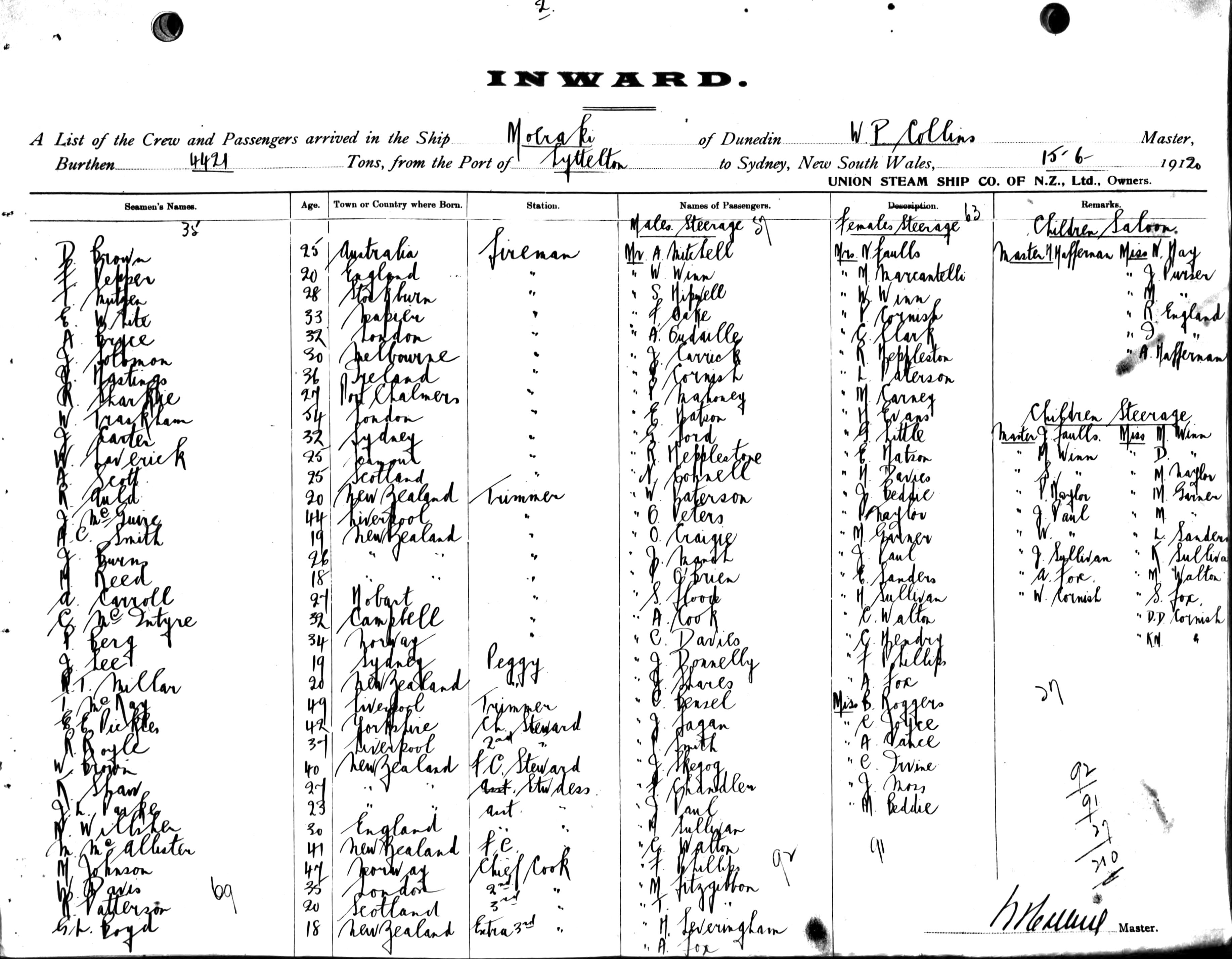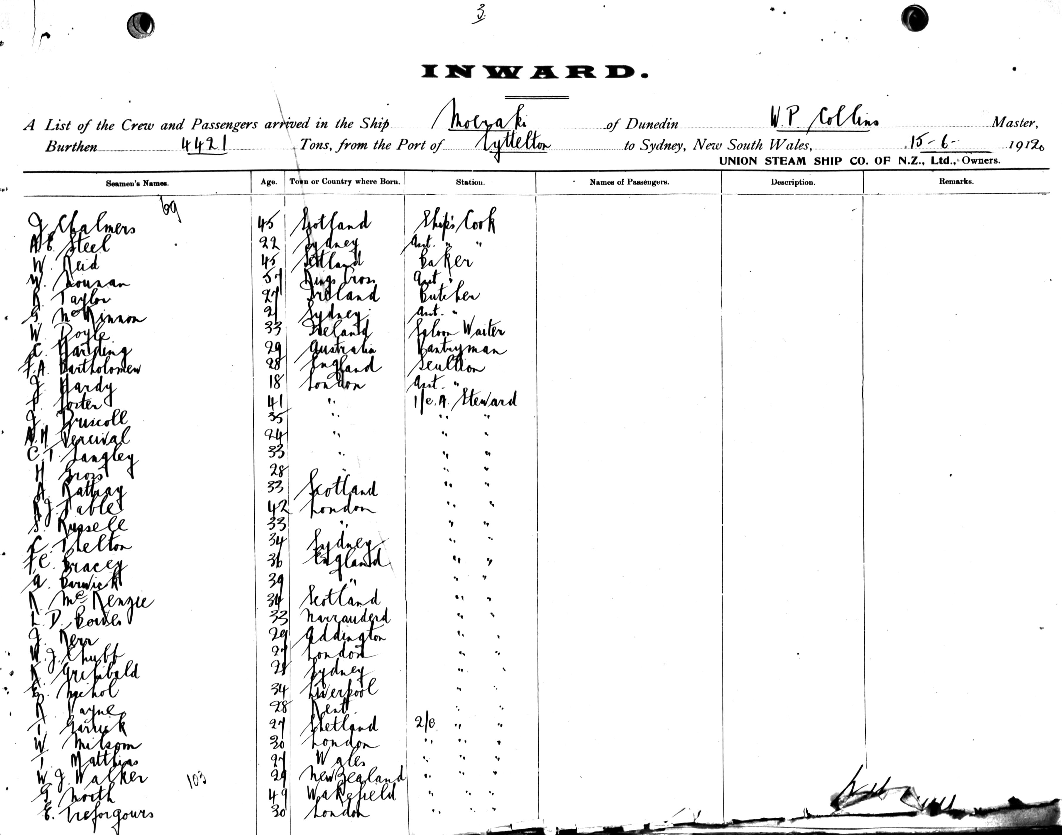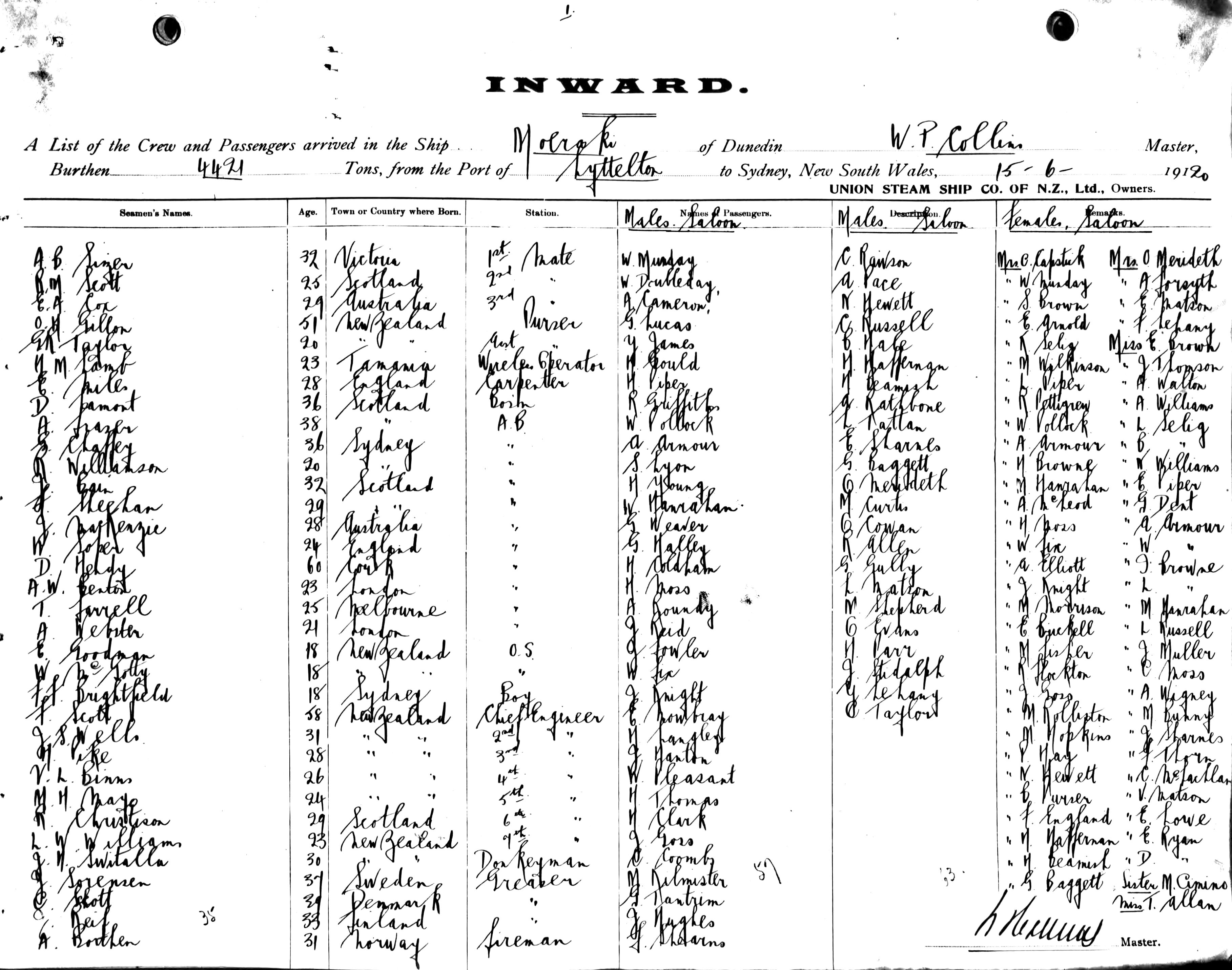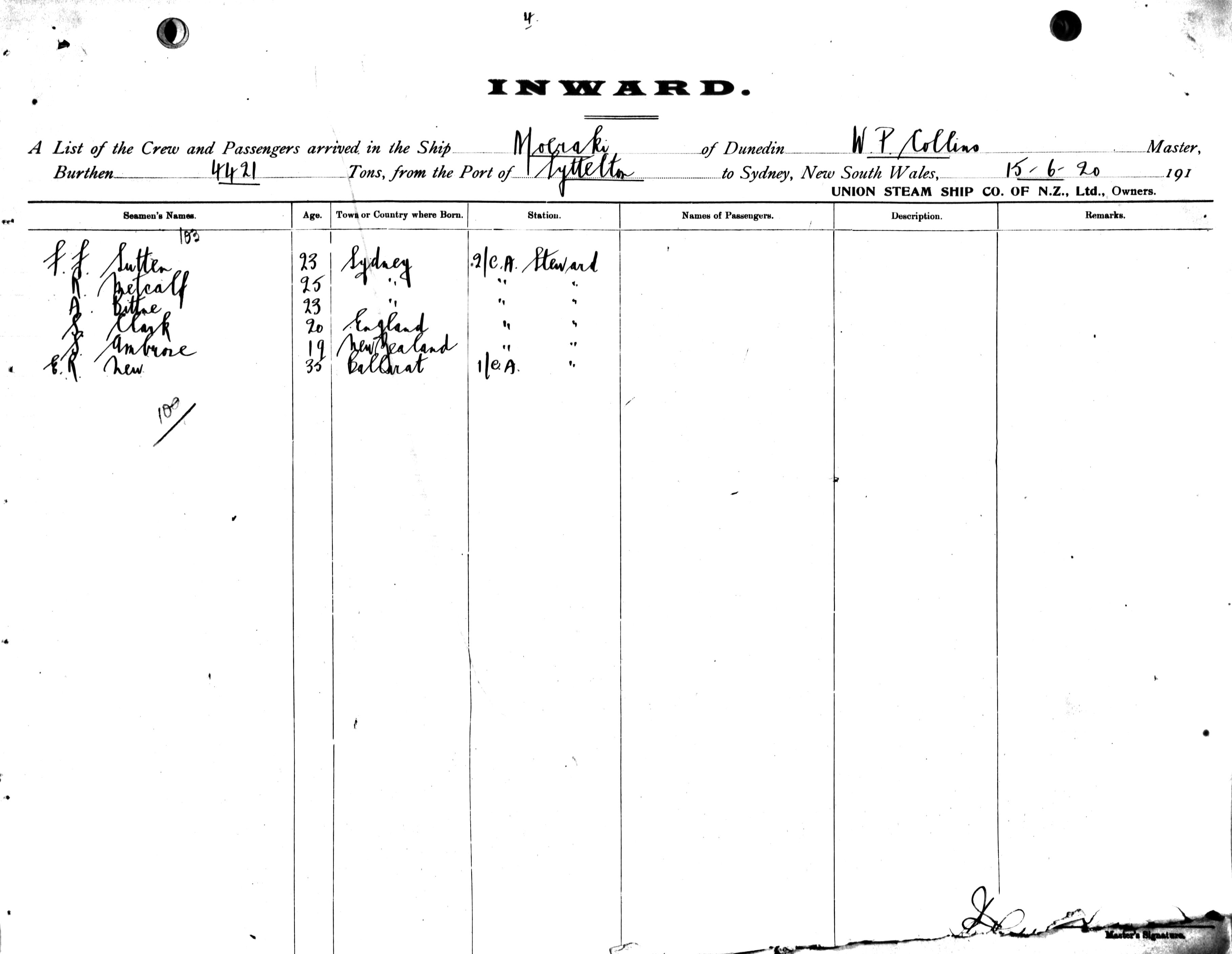 MOERAKIOF DUNEDIN, W. P. COLLINS, MASTER, BURTHEN 4421 TONS FROM THE PORT OF LYTTELTON TO SYDNEY, NEW SOUTH WALES, 15TH JUNE 1920 |