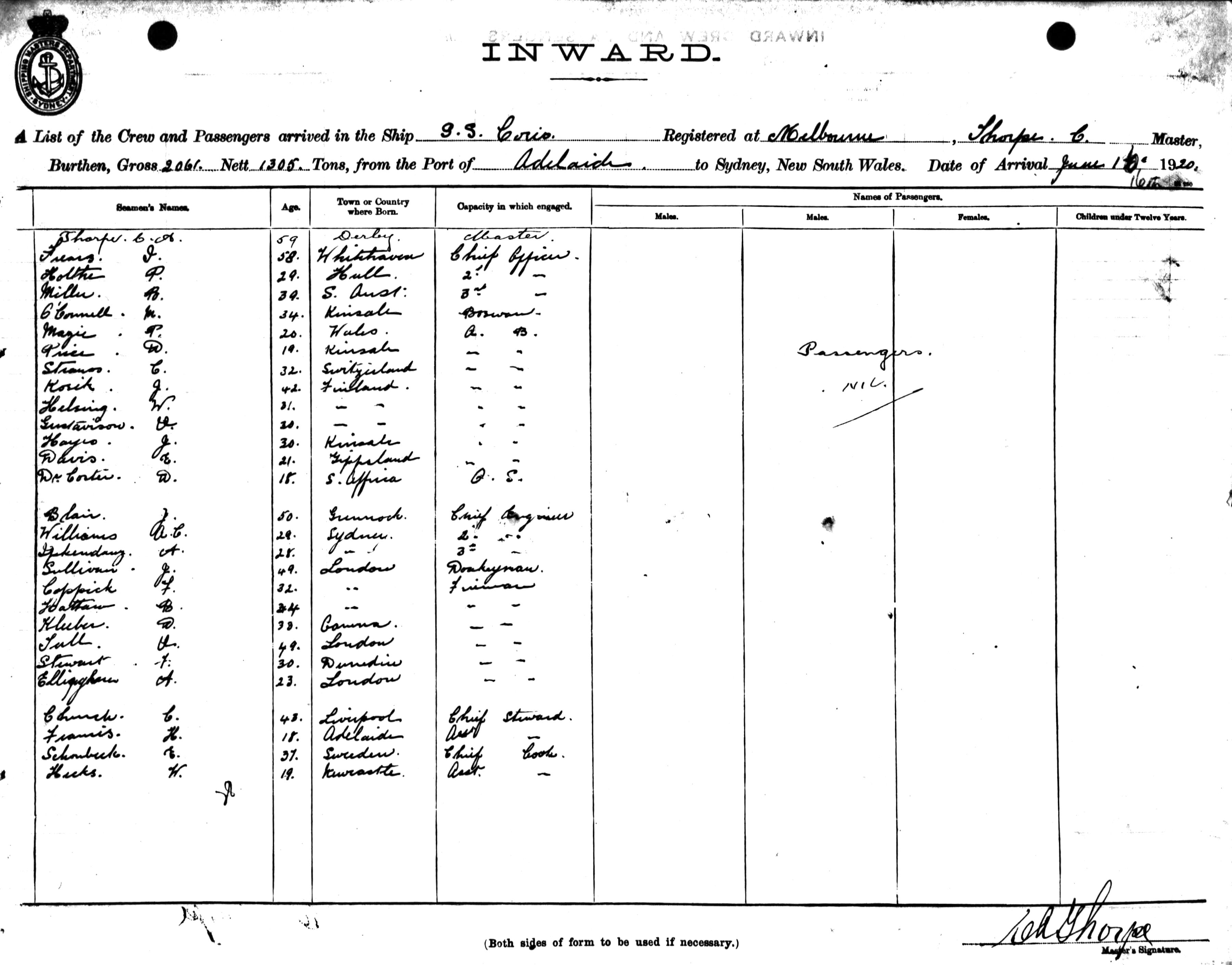 CORIOOF MELBOURNE, C. A. THORPE, MASTER, BURTHEN 2061/1305 TONS FROM THE PORT OF ADELAIDE TO SYDNEY, NEW SOUTH WALES, 16TH JUNE 1920 |