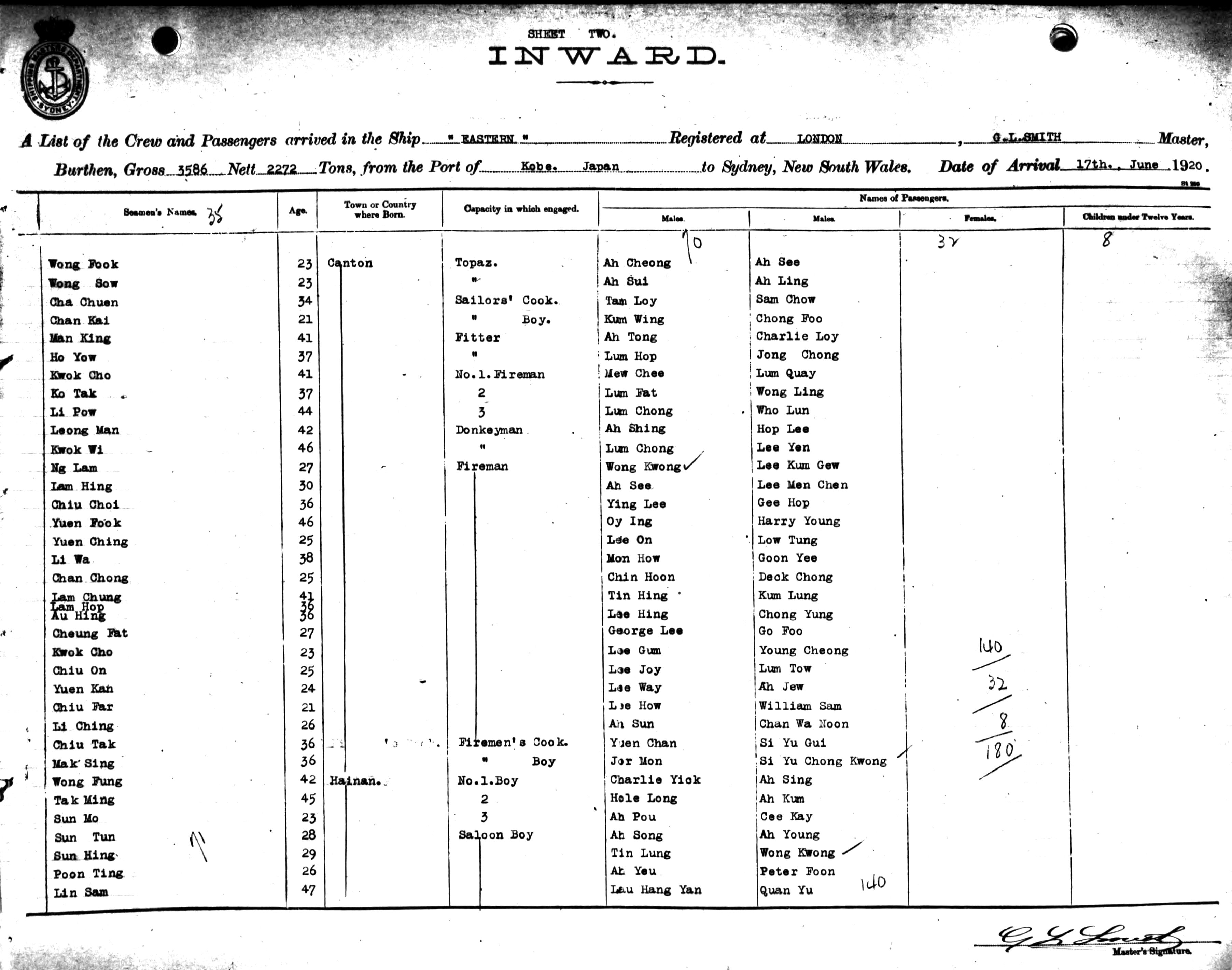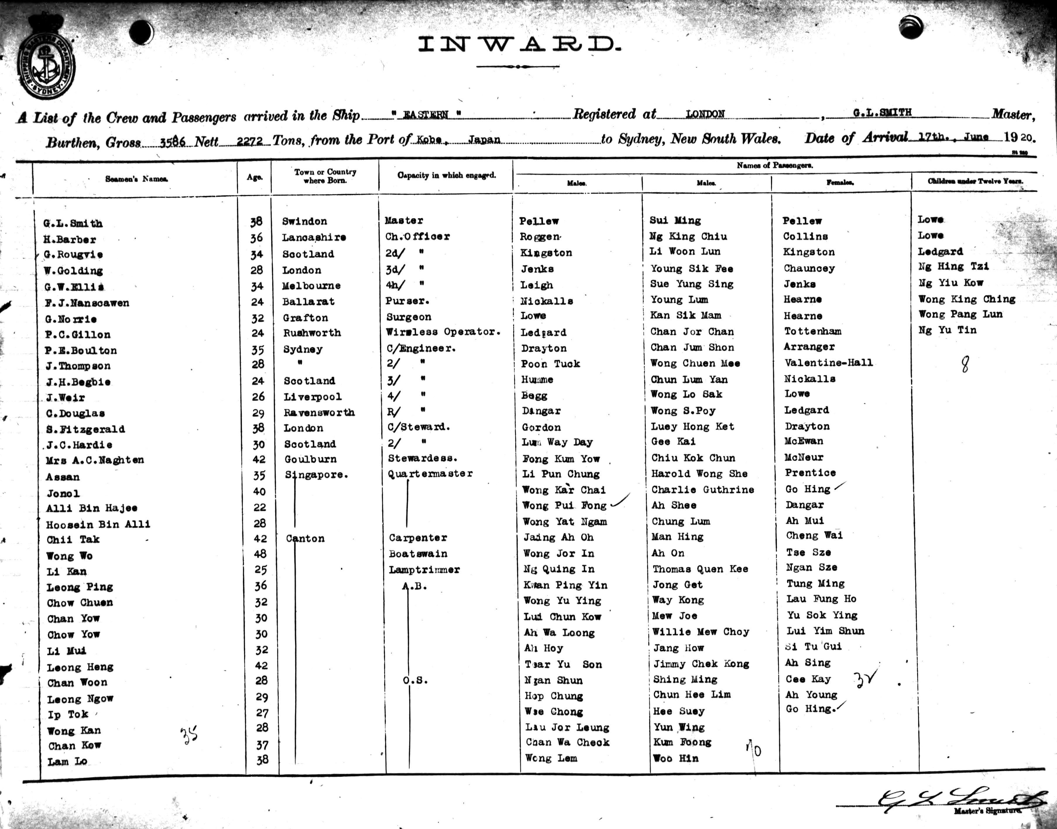 EASTERNOR LONDON, G. L. SMITH, MASTER, BURTHEN 3586 / 2272 TONS FROM THE PORT OF KOBE, JAPAN TO SYDNEY, NEW SOUTH WALES, 17TH JUNE 1920 |