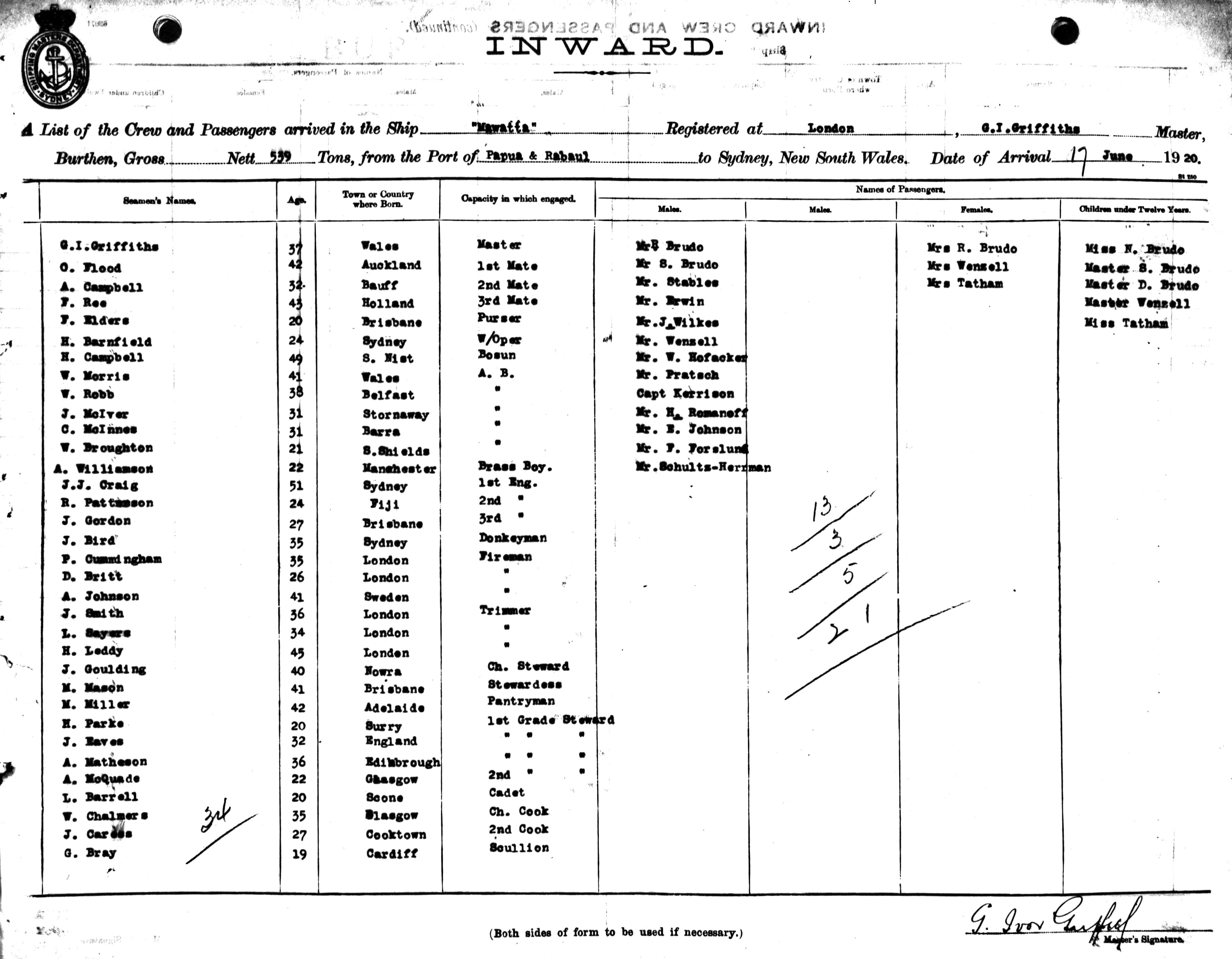 MAWATTAOF LONDON, G.I. GRIFFITHS, MASTER, BURTHEN 539 TONS FROM THE PORTS OF PAPUA & RABAUL TO SYDNEY, NEW SOUTH WALES, 17TH JUNE 1920 |
