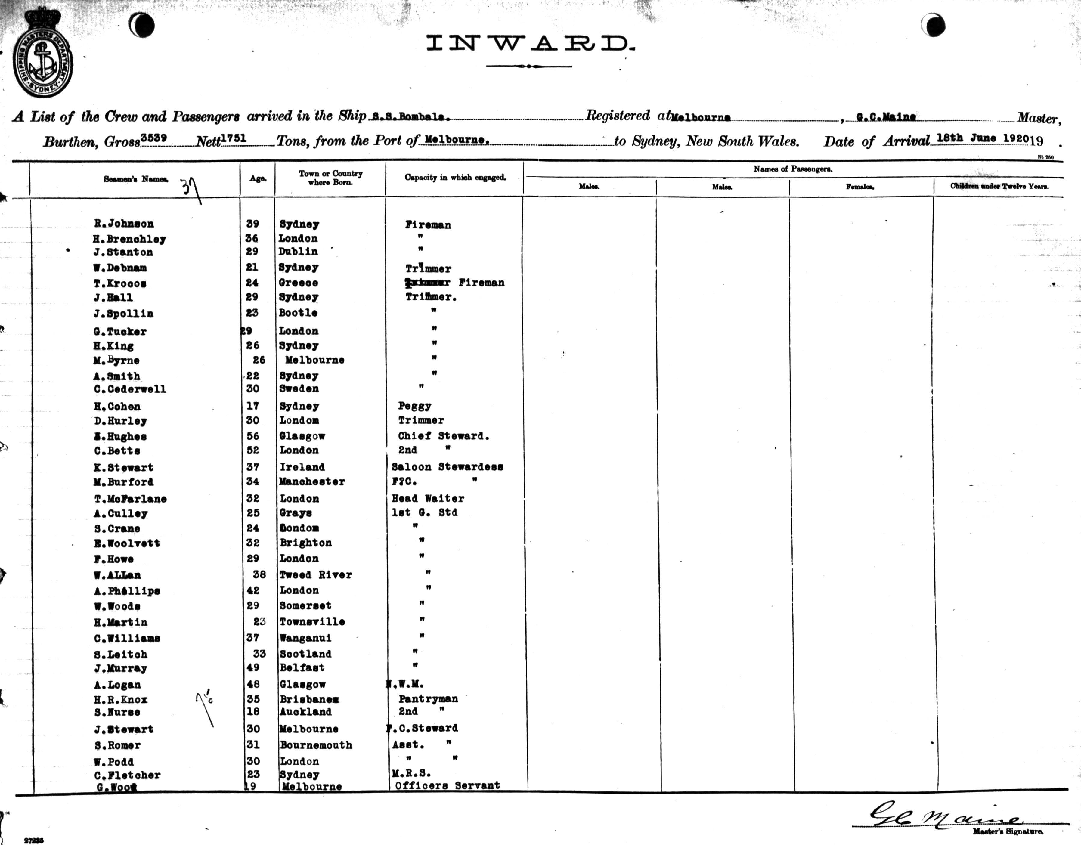 BOMBALAOF MELBOURNE, G. C. MAINE, MASTER, BURTHEN 3539/1751 TONS FROM THE PORT OF MELBOURNE TO SYDNEY, NEW SOUTH WALES, 16TH JUNE 1920 |