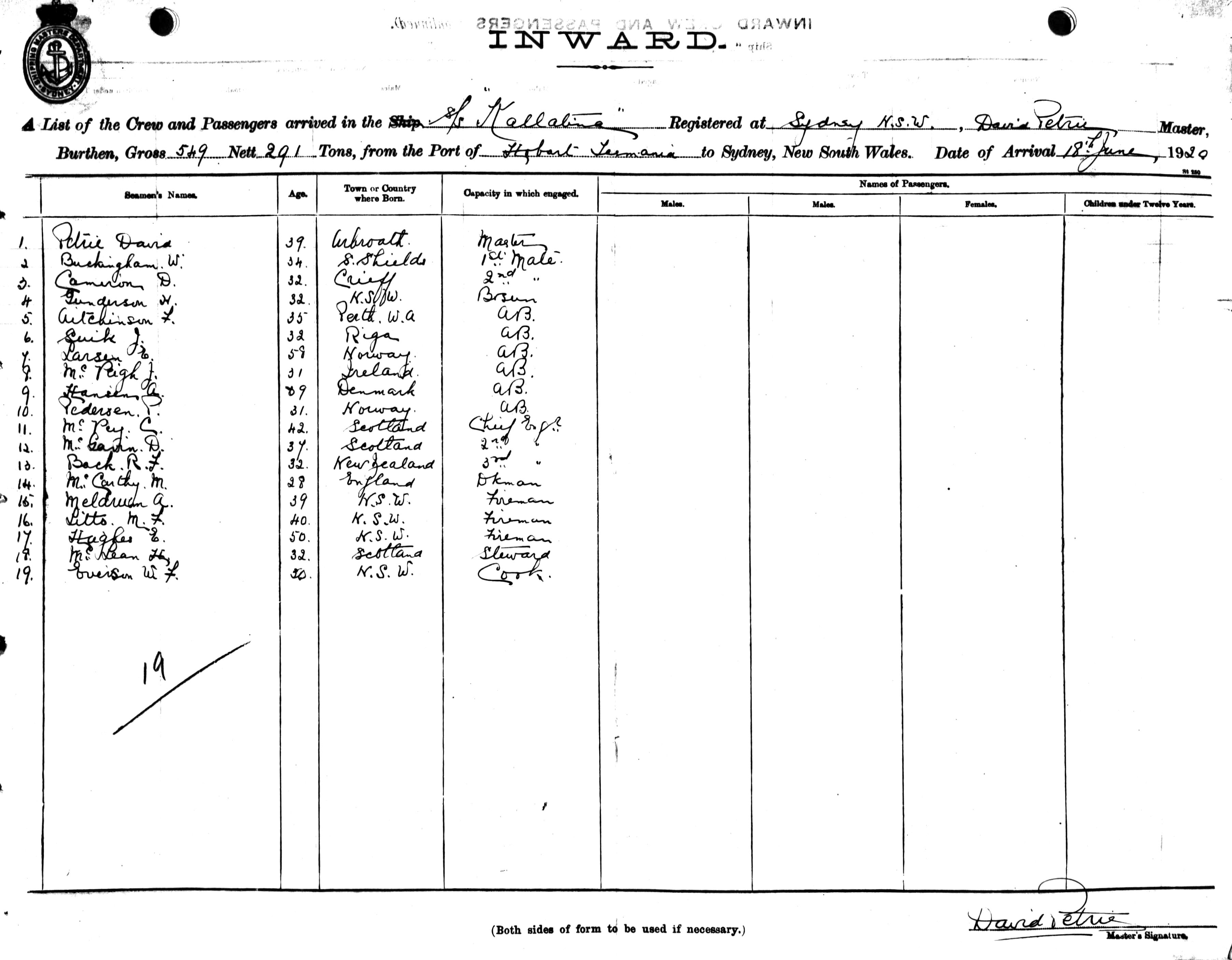 KALLATINAOF SYDNEY, DAVID PETRIE, MASTER, BURTHEN 549/291 TONS FROM THE PORT OF HOBART TO SYDNEY, NEW SOUTH WALES, 18TH JUNE 1920 |