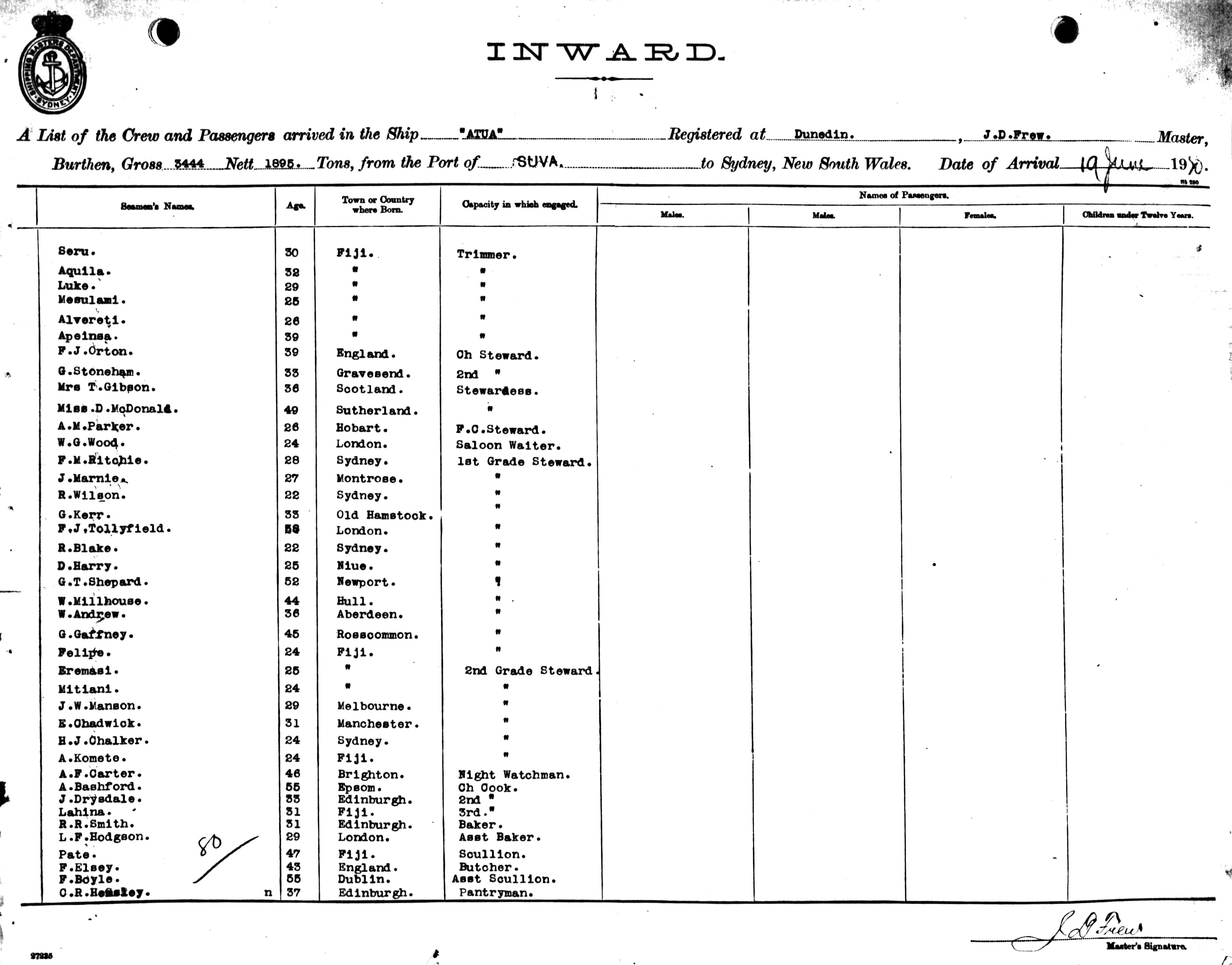 ATUAOF DUNEDIN, J. D. FREW, MASTER, BURTHEN 3444/1895 TONS FROM THE PORT OF SUVA TO SYDNEY, NEW SOUTH WALES, 19TH JUNE 1920 |