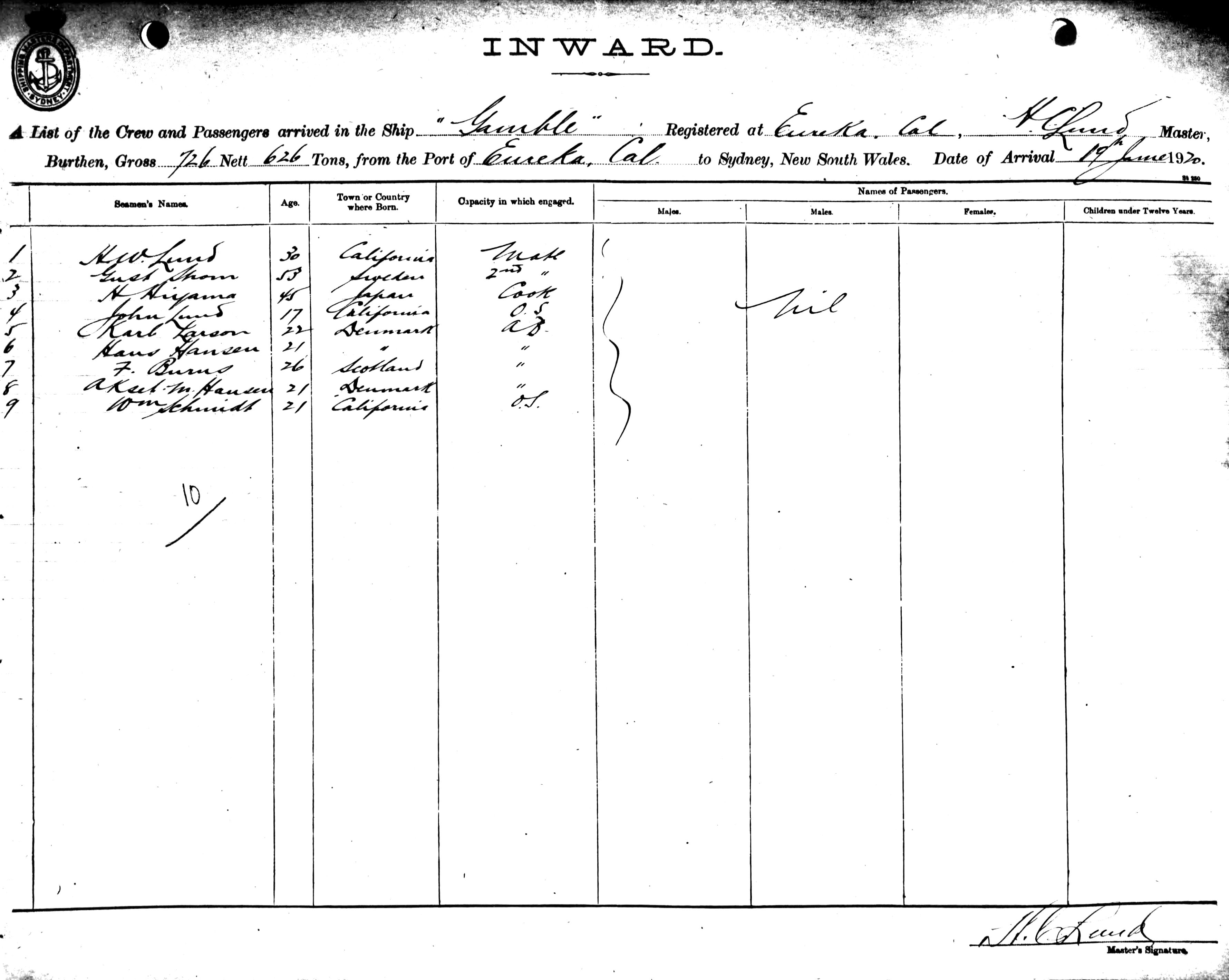GAMBLEOF EUREKA, U.S.A., H. C. LUND, MASTER, BURTHEN 726/626 TONS FROM THE PORT OF EUREKA, CALIFORNIA TO SYDNEY, NEW SOUTH WALES, 19TH JUNE 1920 |