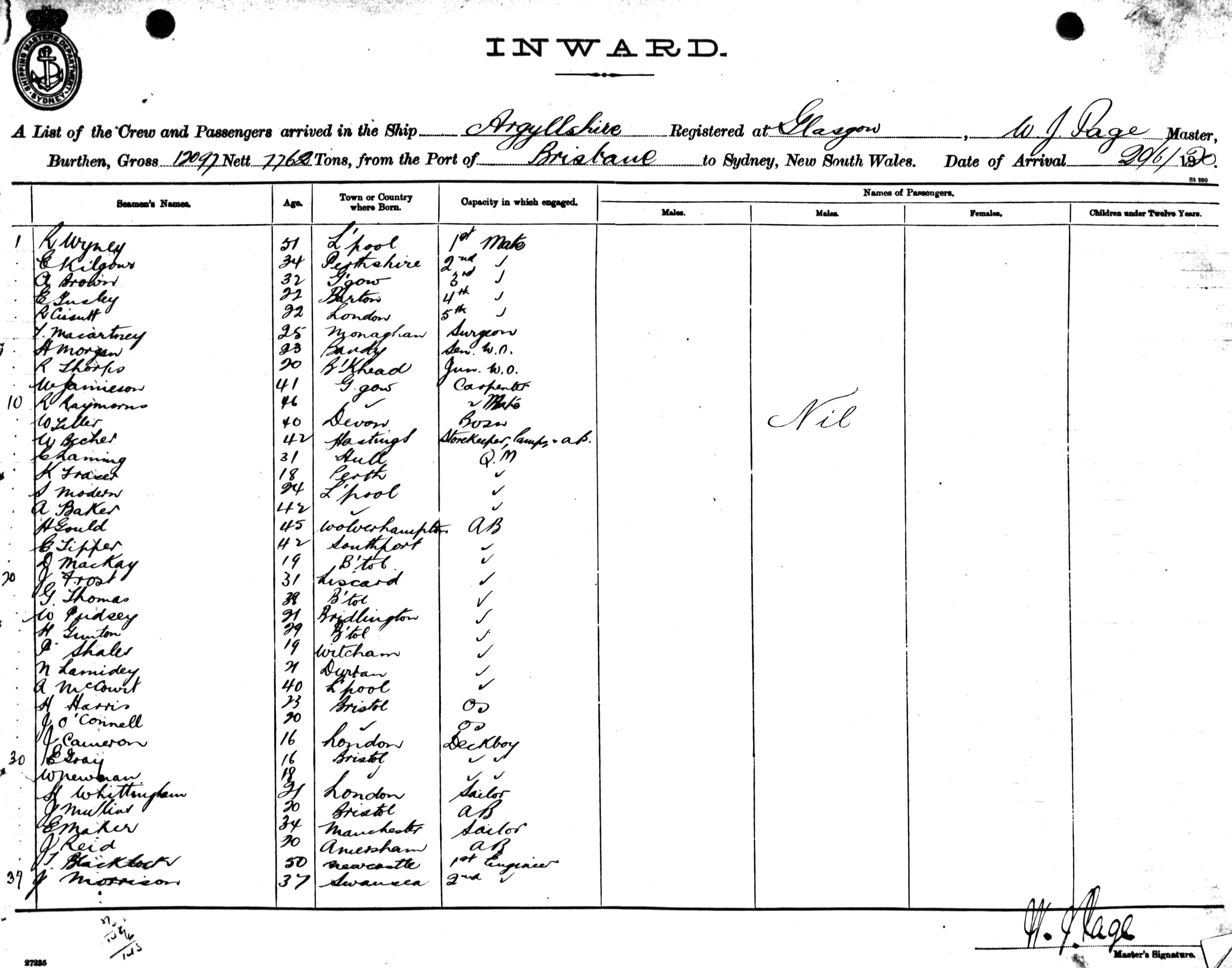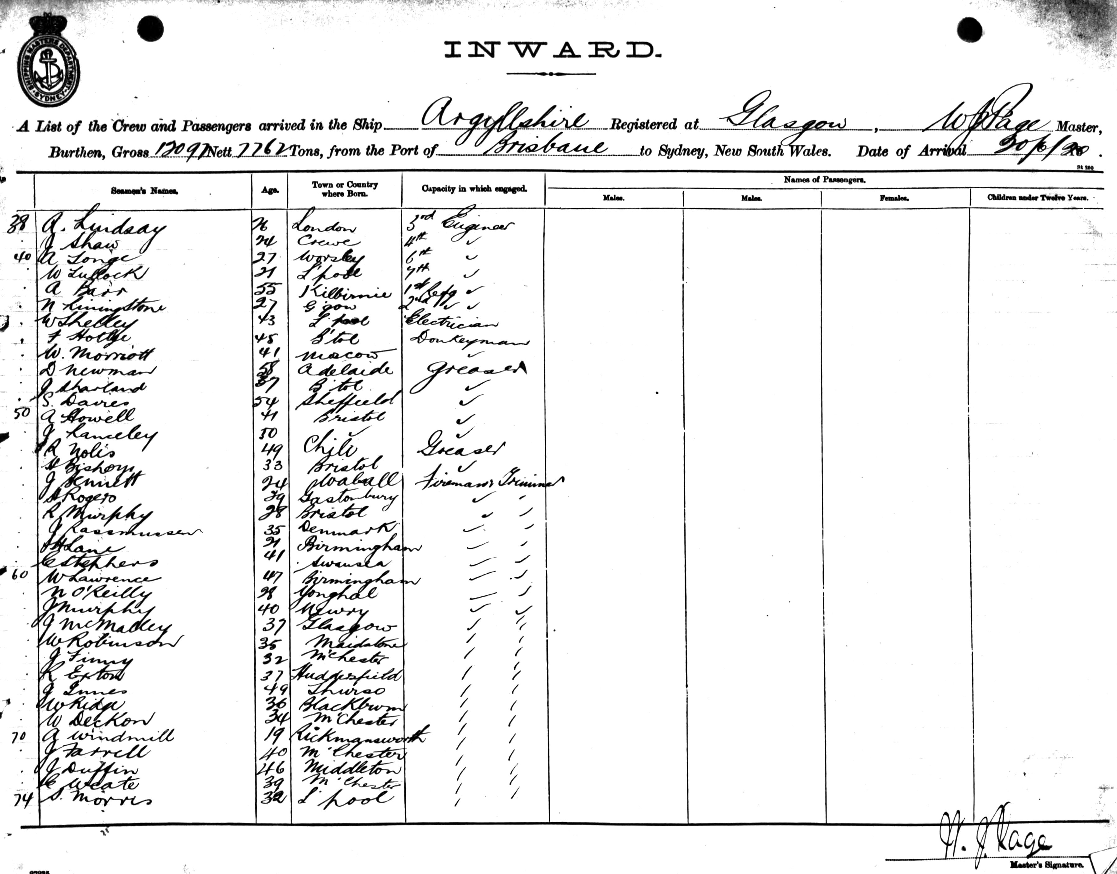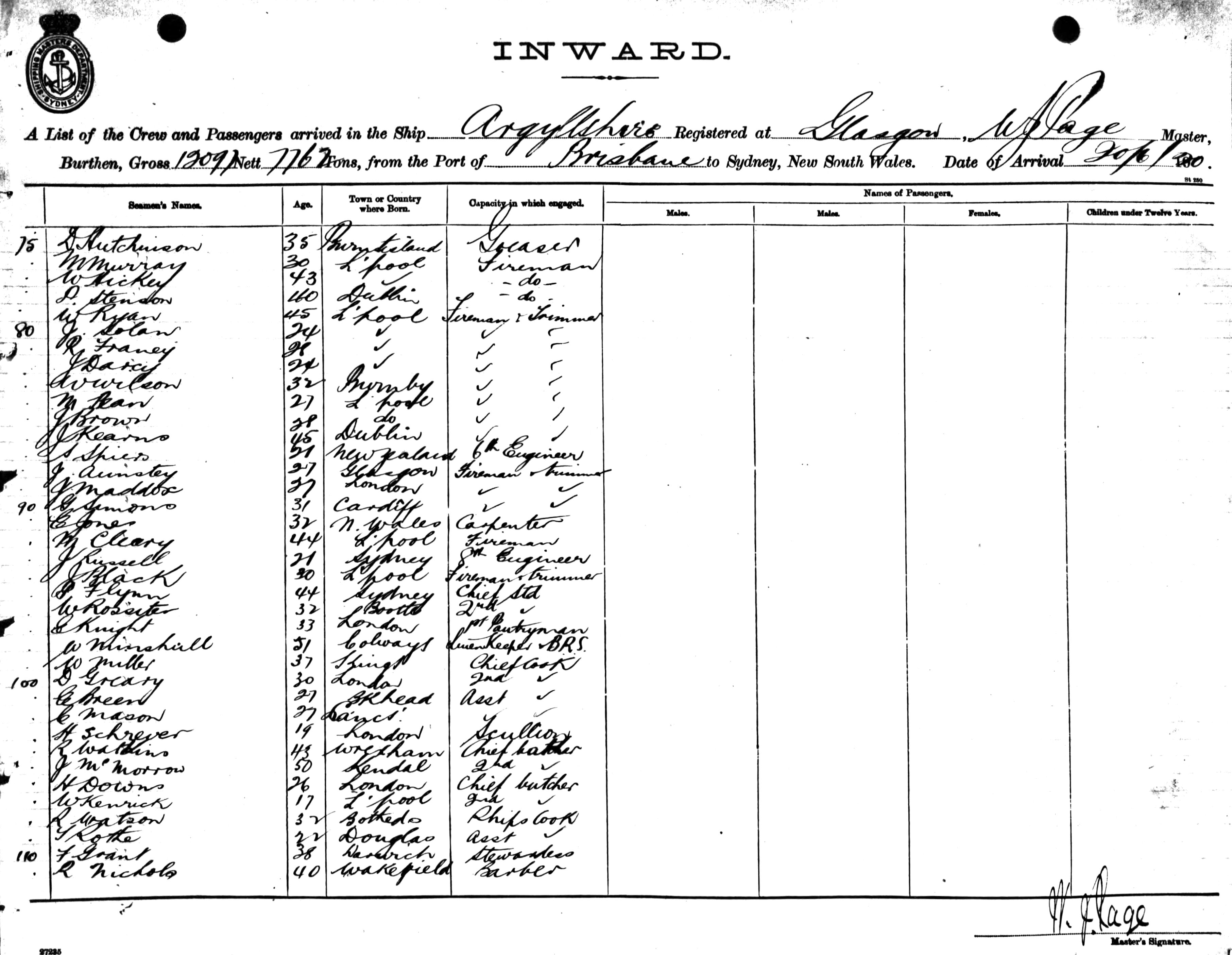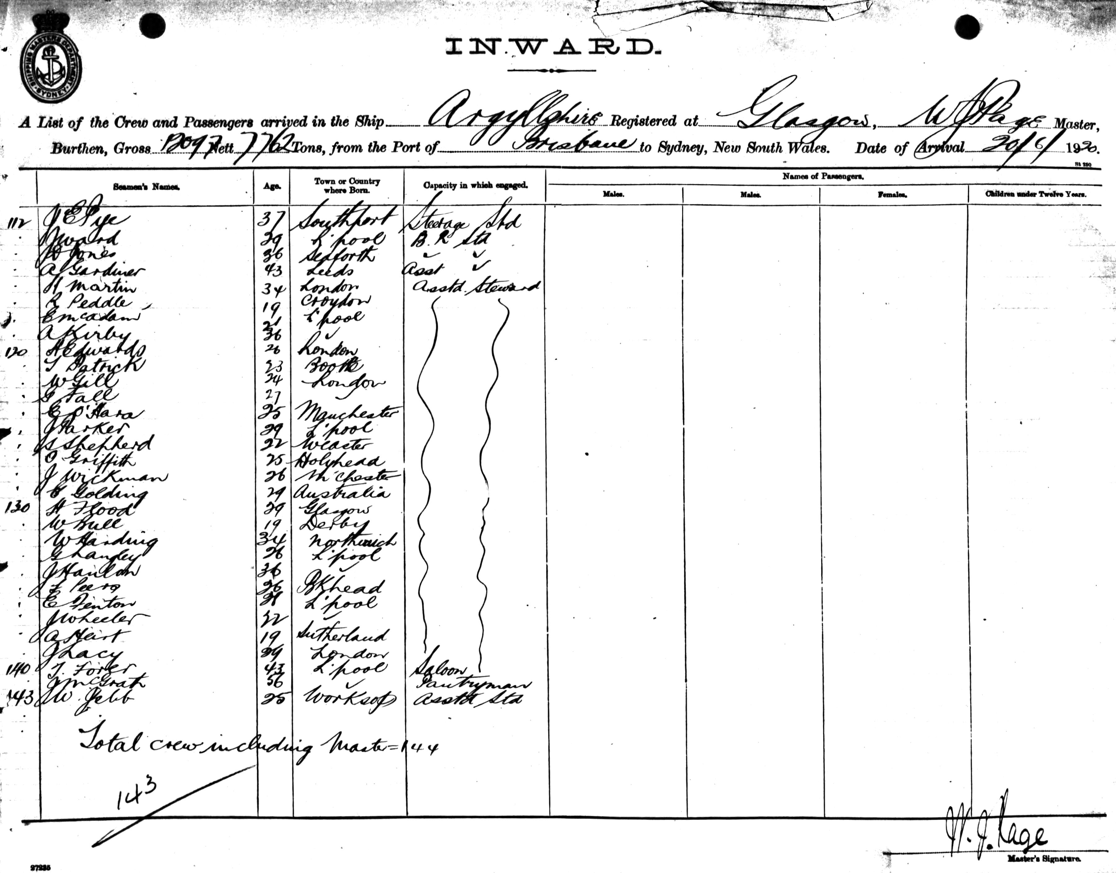 ARGYLLSHIREOF GLASGOW, W. J. PAGE, MASTER, BURTHEN 12097/7762 TONS FROM THE PORT OF BRISBANE TO SYDNEY, NEW SOUTH WALES, 20TH JUNE 1920 |
