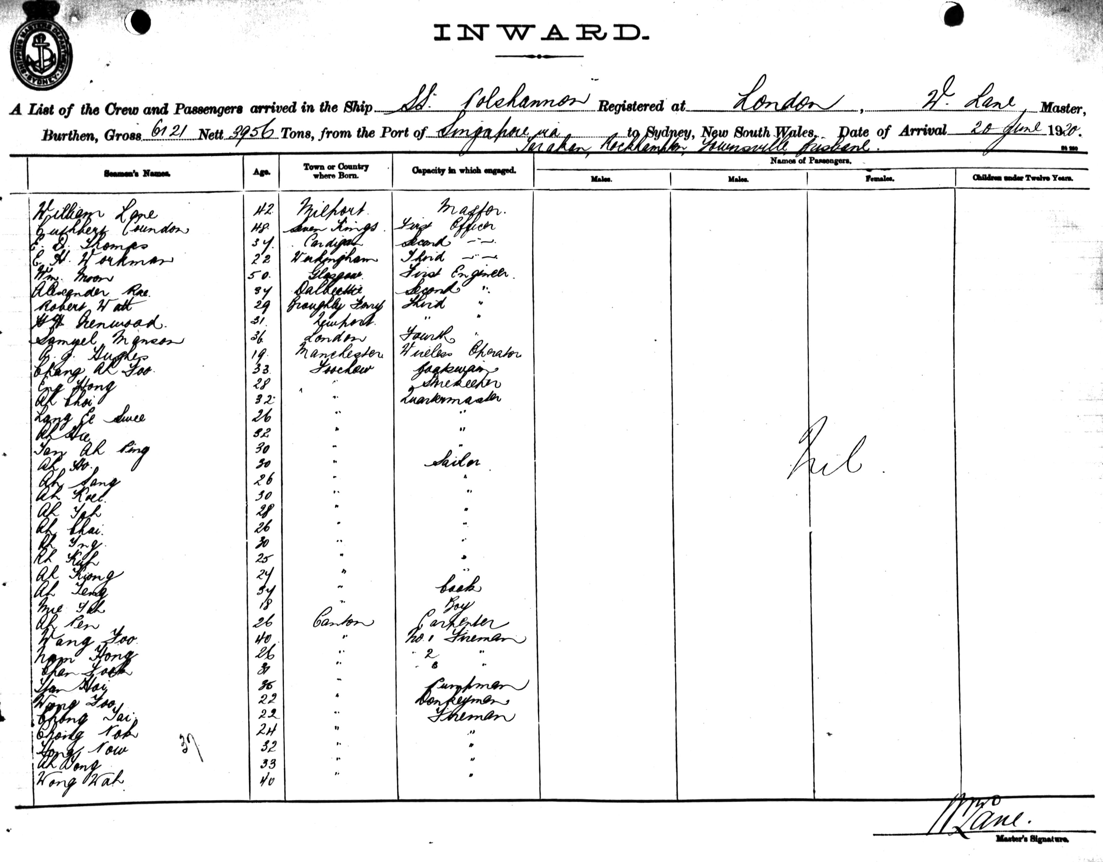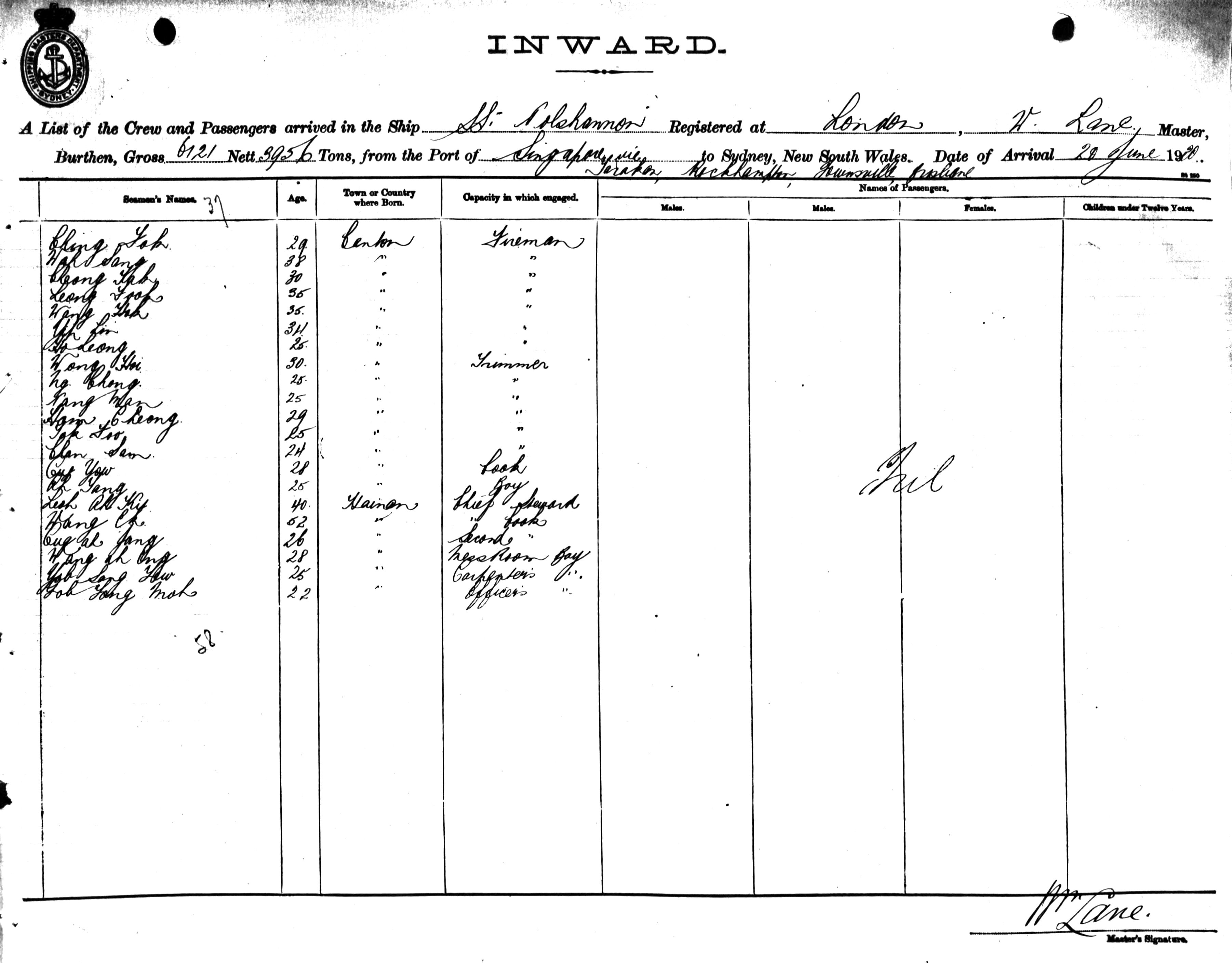 POLSHANNONOF LONDON, W. LANE, MASTER, BURTHEN 6121/3956 TONS FROM THE PORT OF SINGAPORE via TARAKAN, TOWNSVILLE, ROCKHAMPTON & BRISBANE TO SYDNEY, NEW SOUTH WALES, 20TH JUNE 1920 |