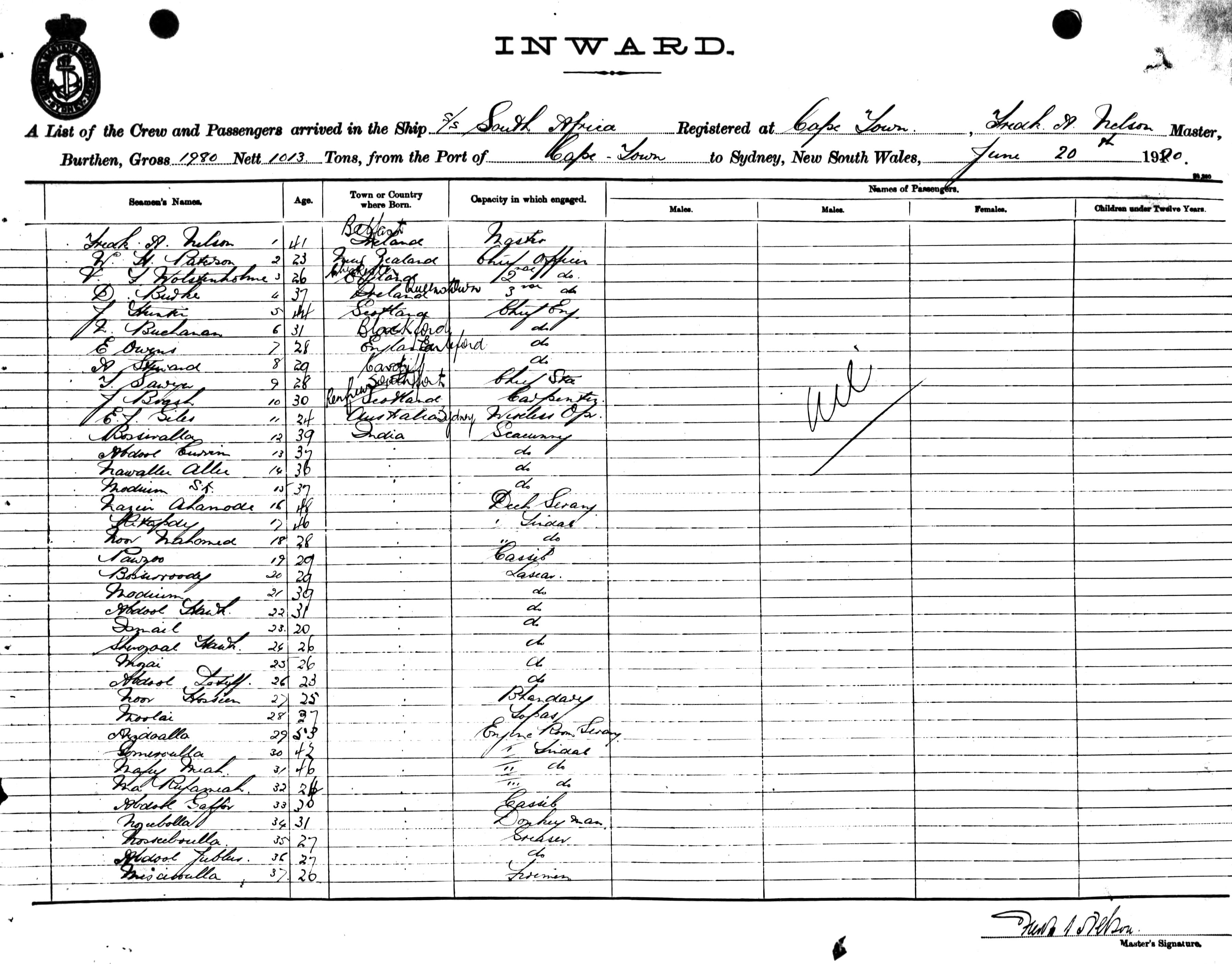 Mariners and ships in Australian Waters | SOUTH AFRICAOF CAPE TOWN, FREDK. A. NELSON, MASTER, BURTHEN 1980/1013 TONS FROM THE PORT OF CAPE TOWN TO SYDNEY, NEW SOUTH WALES, 20TH JUNE 1920 |