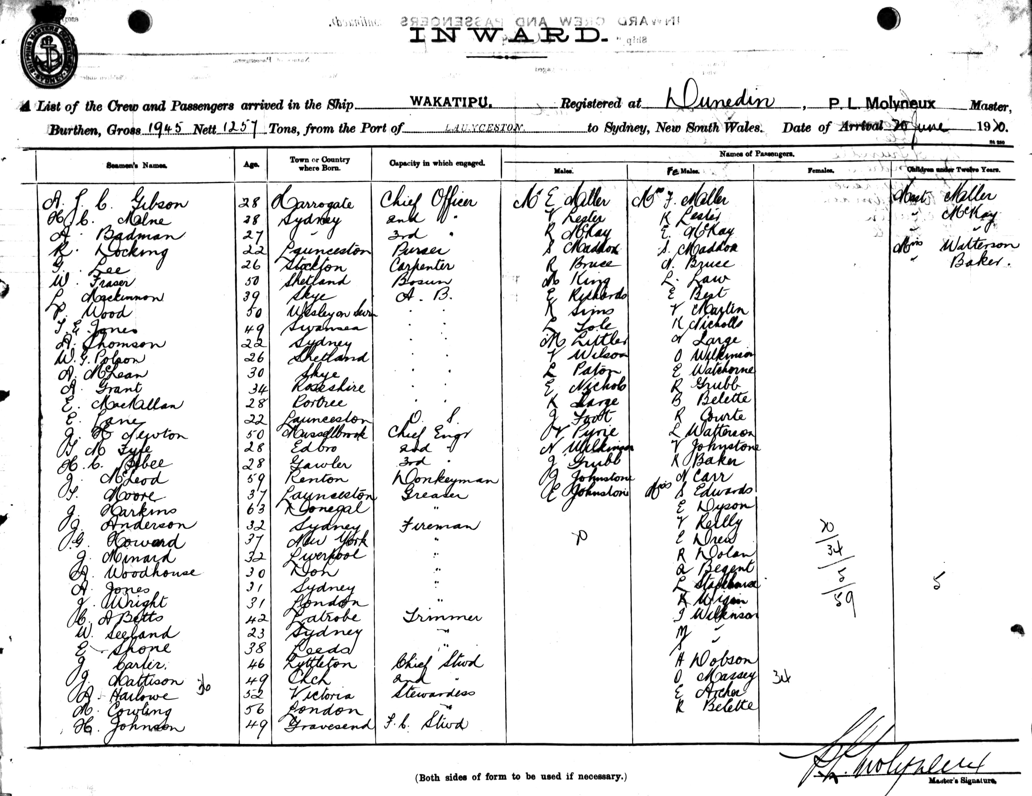 WAKATIPUOF DUNEDIN, P. L. MOLYNEUX, MASTER, BURTHEN 1945/1257 TONS FROM THE PORT OF LAUNCESTON TO SYDNEY, NEW SOUTH WALES, 20TH JUNE 1920 |