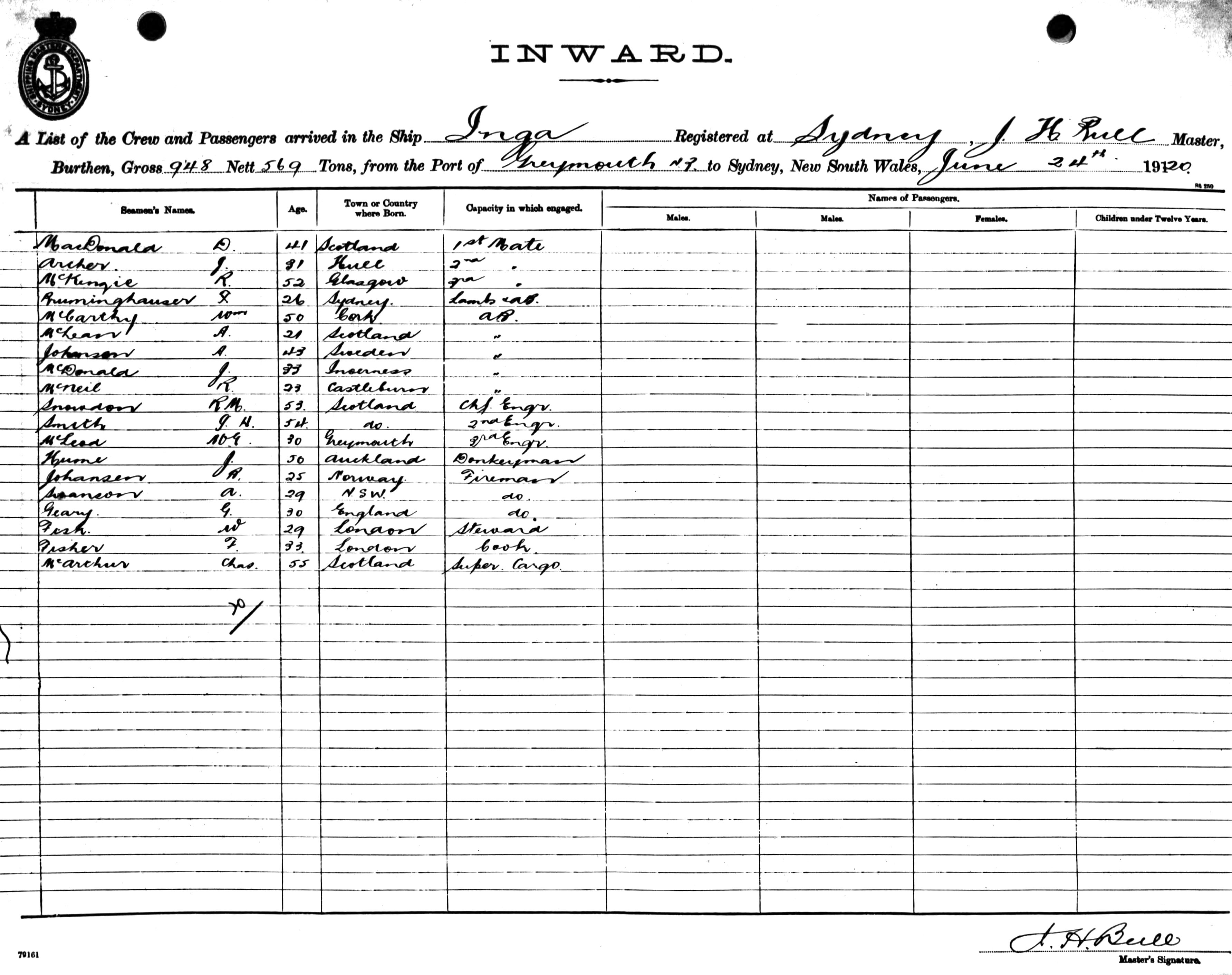 INGAOF SYDNEY, J. H. BULL, MASTER, BURTHEN 948/569 TONS FROM THE PORT OF GREYMOUTH, N.Z. TO SYDNEY, NEW SOUTH WALES, 24TH JUNE 1920 |