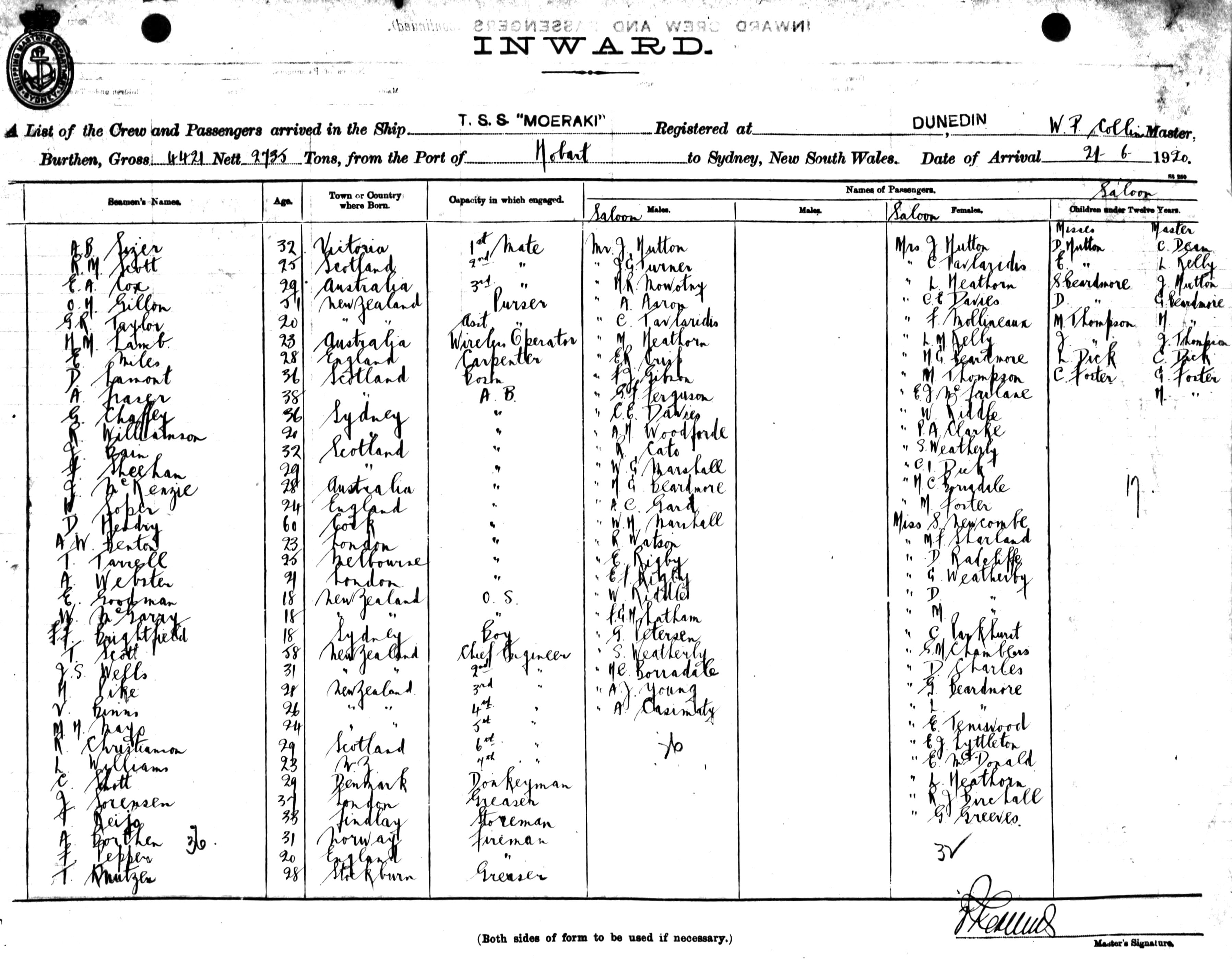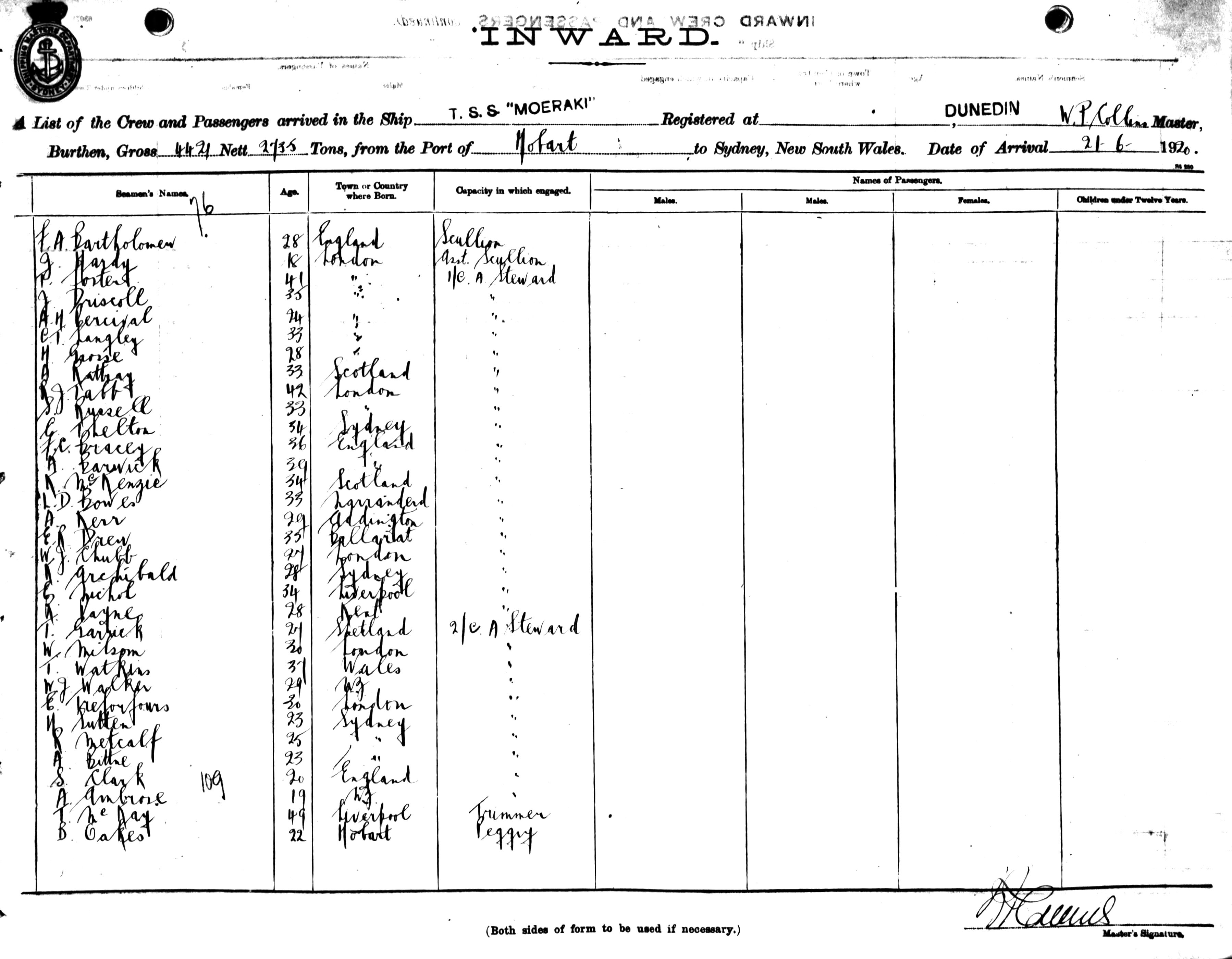 MOERAKIOF DUNEDIN, W. P. COLLINS, MASTER, BURTHEN 4421/2735 TONS FROM THE PORT OF HOBART TO SYDNEY, NEW SOUTH WALES, 21ST JUNE 1920 |