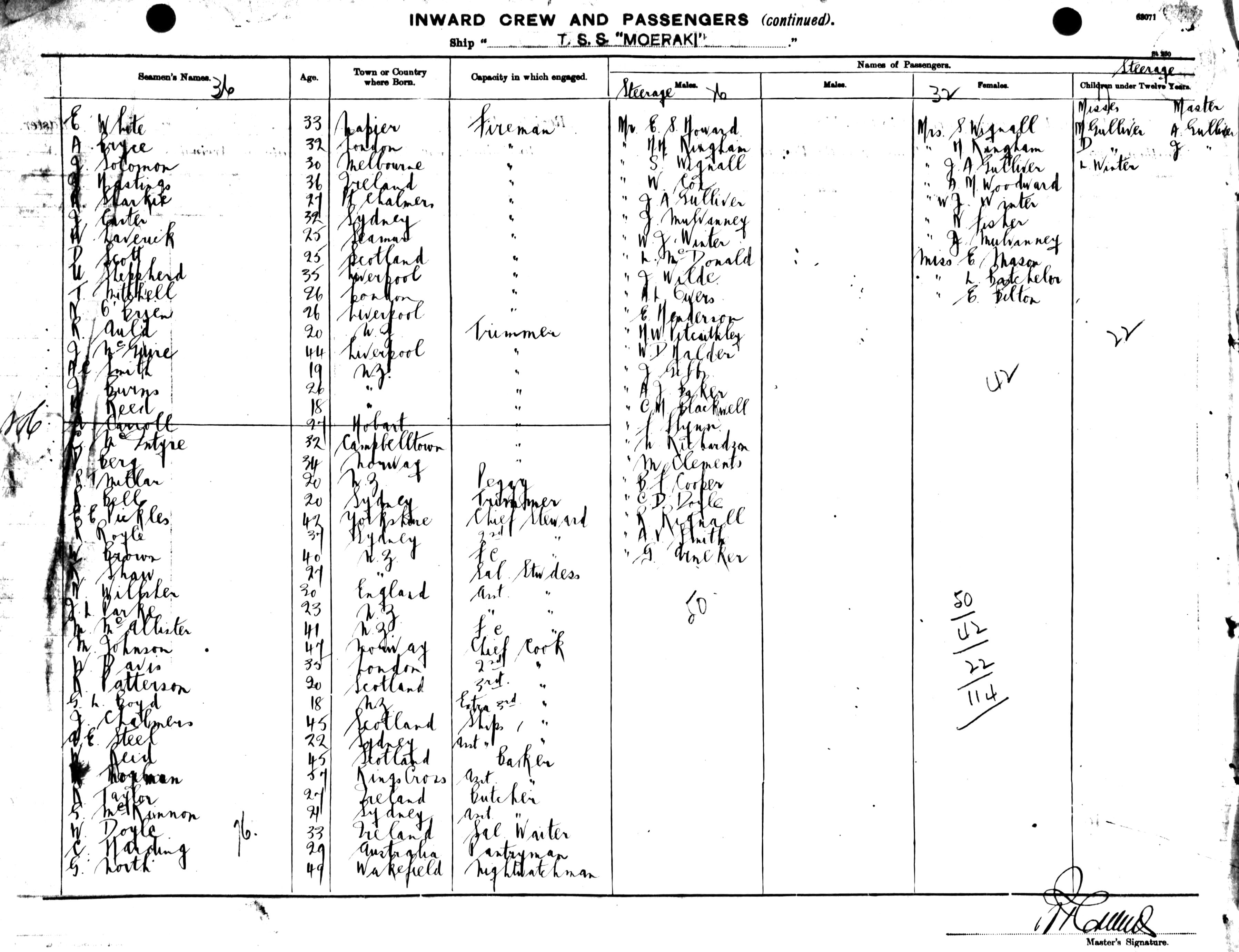 Source: State Records Authority of New South Wales: Shipping Master's Office; Passengers Arriving 1855 - 1922; NRS13278, [X444] reel 2110 & 2111. Transcribed by Lyn & Maurie. You may view/print a scan of the original list - a monitor set to high resolution is recommended for clarity. Use your back button to return. |