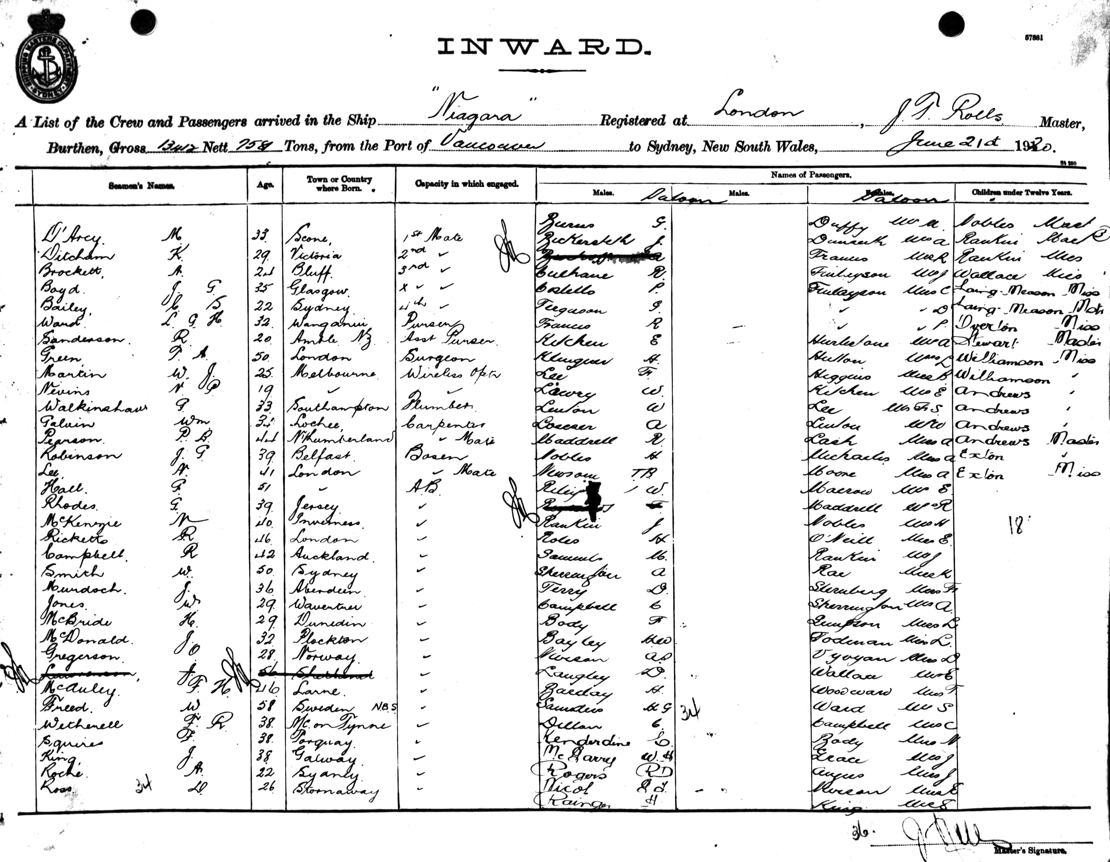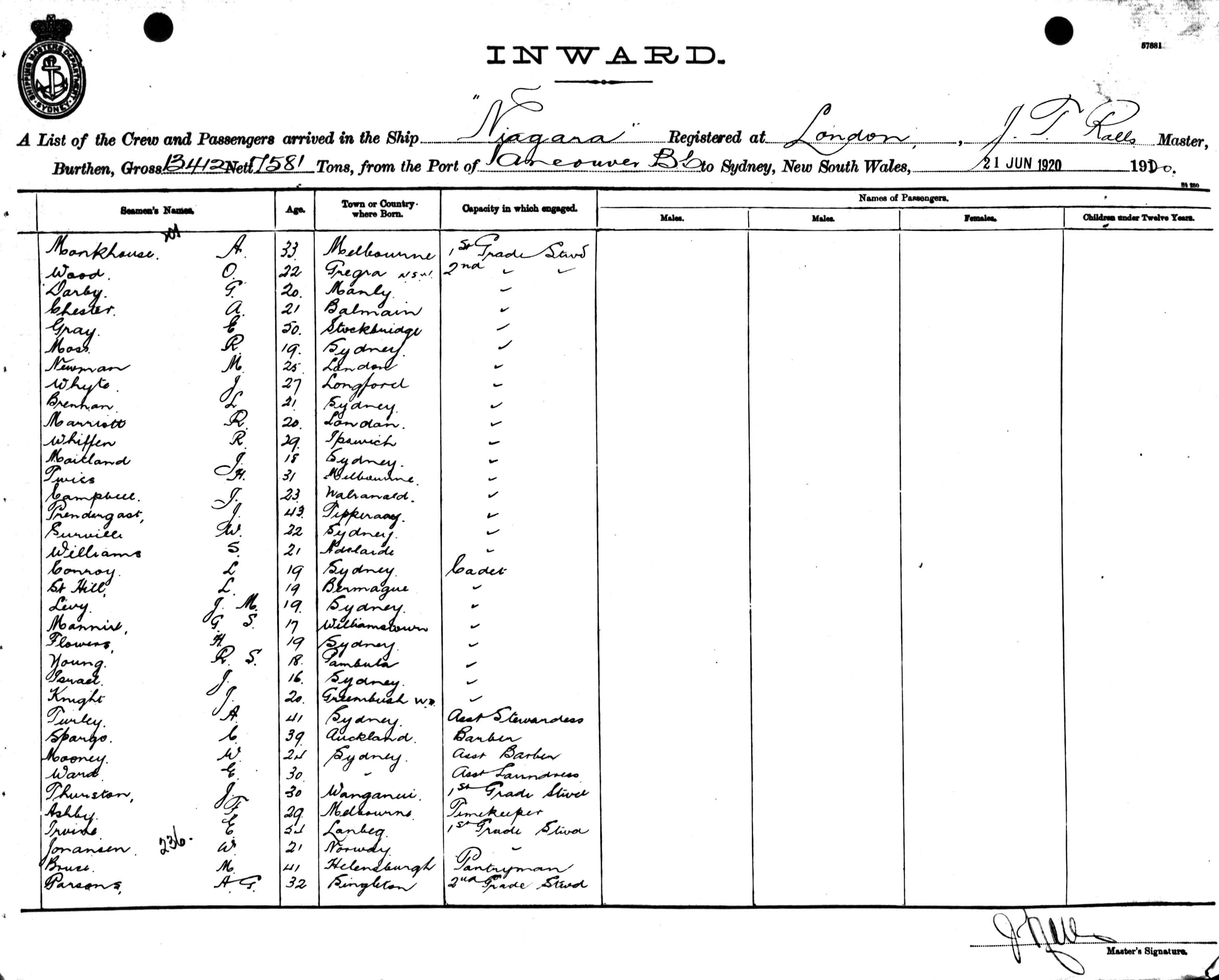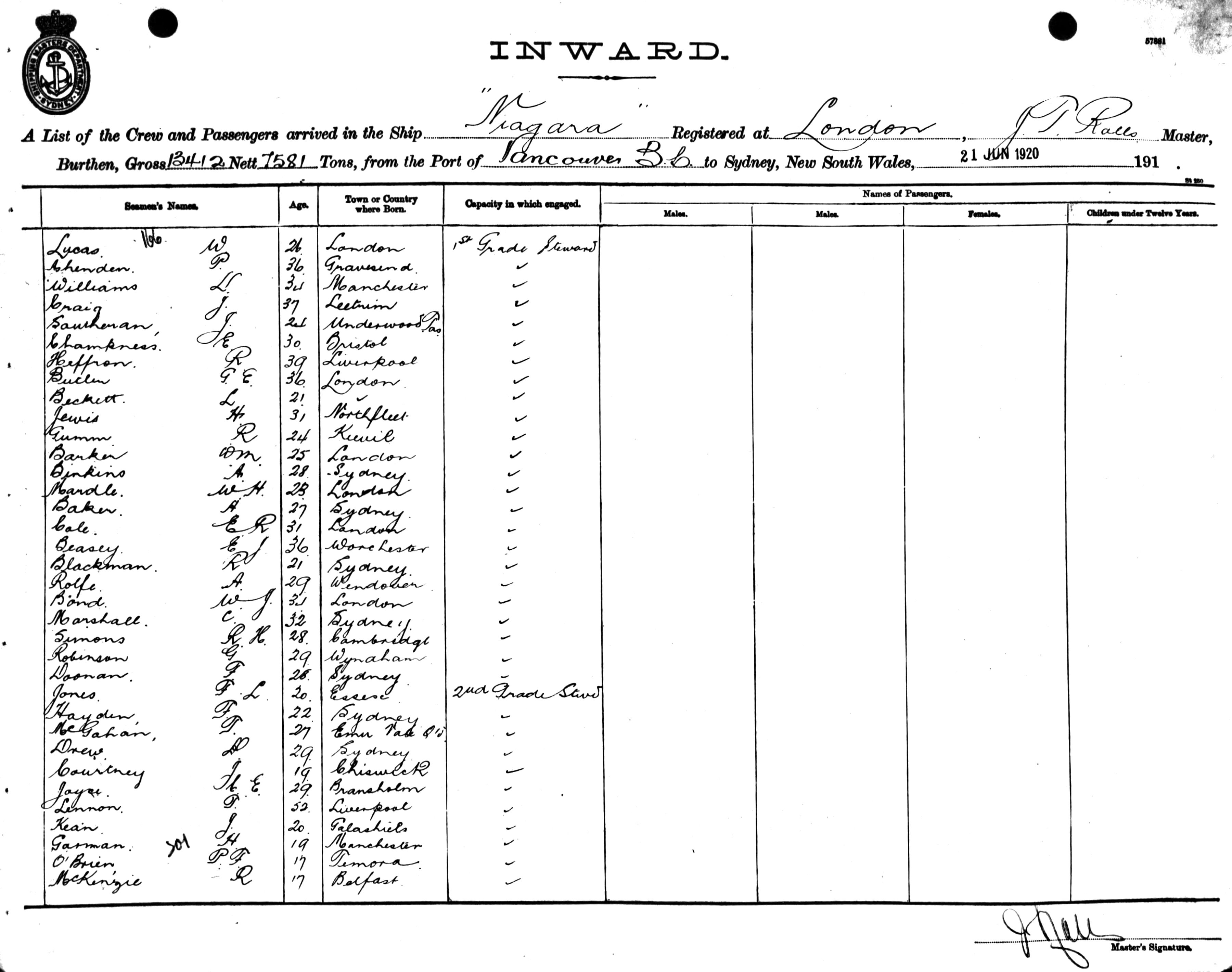 Mariners and ships in Australian Waters | NIAGARAOF LONDON, J. T. ROLLS, MASTER, BURTHEN 13412/7581 TONS FROM THE PORT OF VANCOUVER TO SYDNEY, NEW SOUTH WALES, 21ST JUNE 1920 |