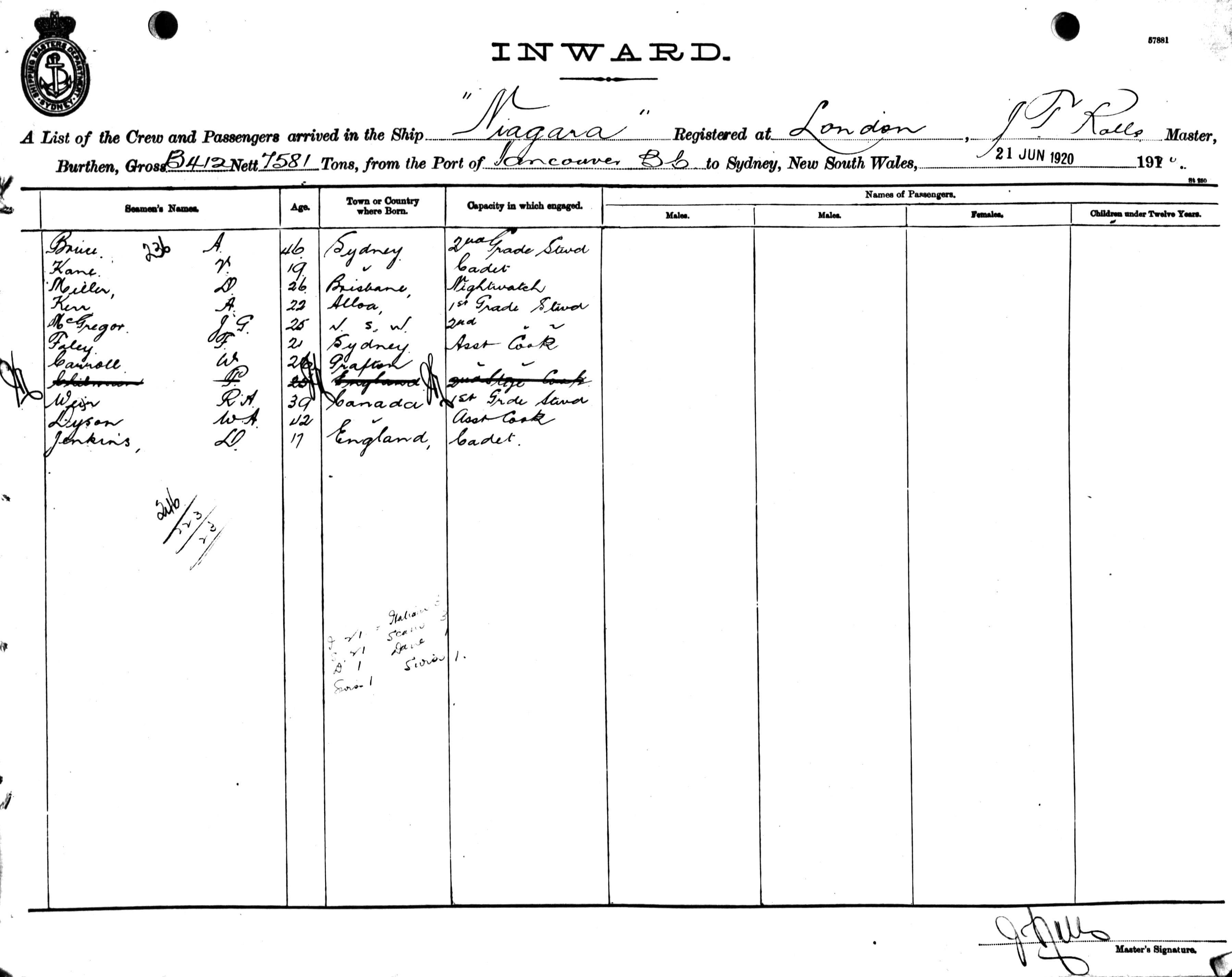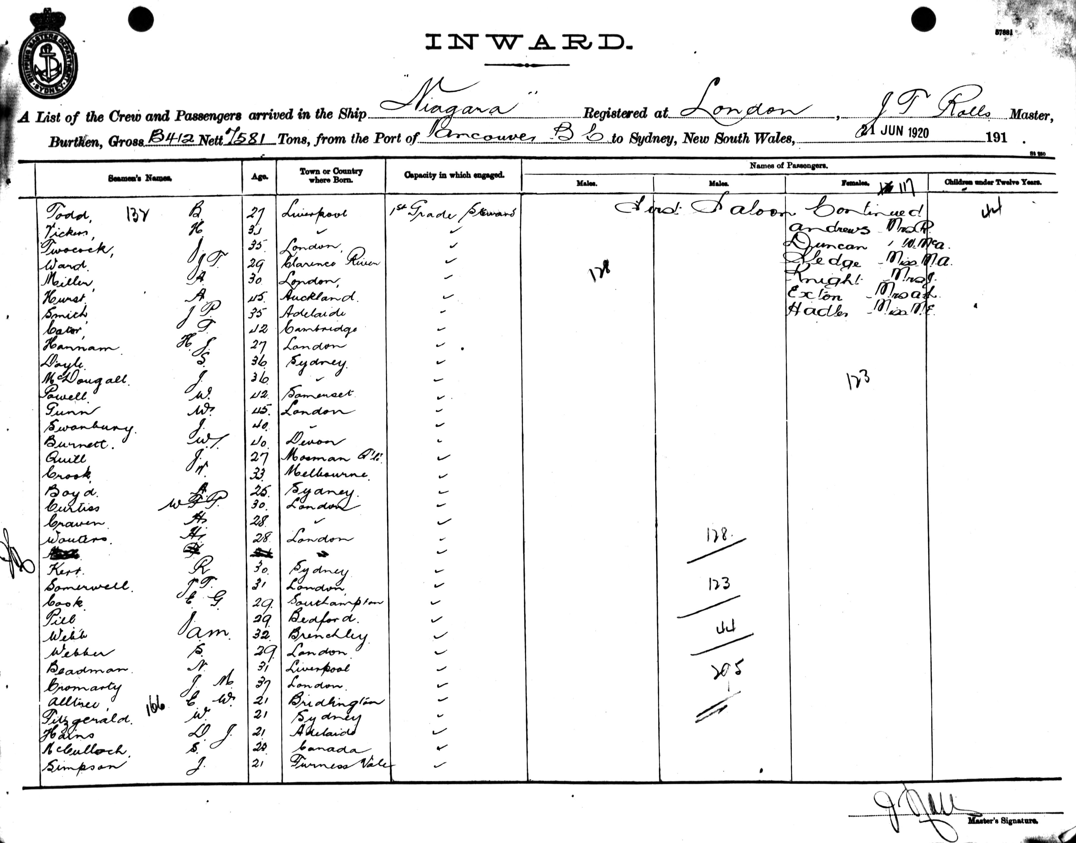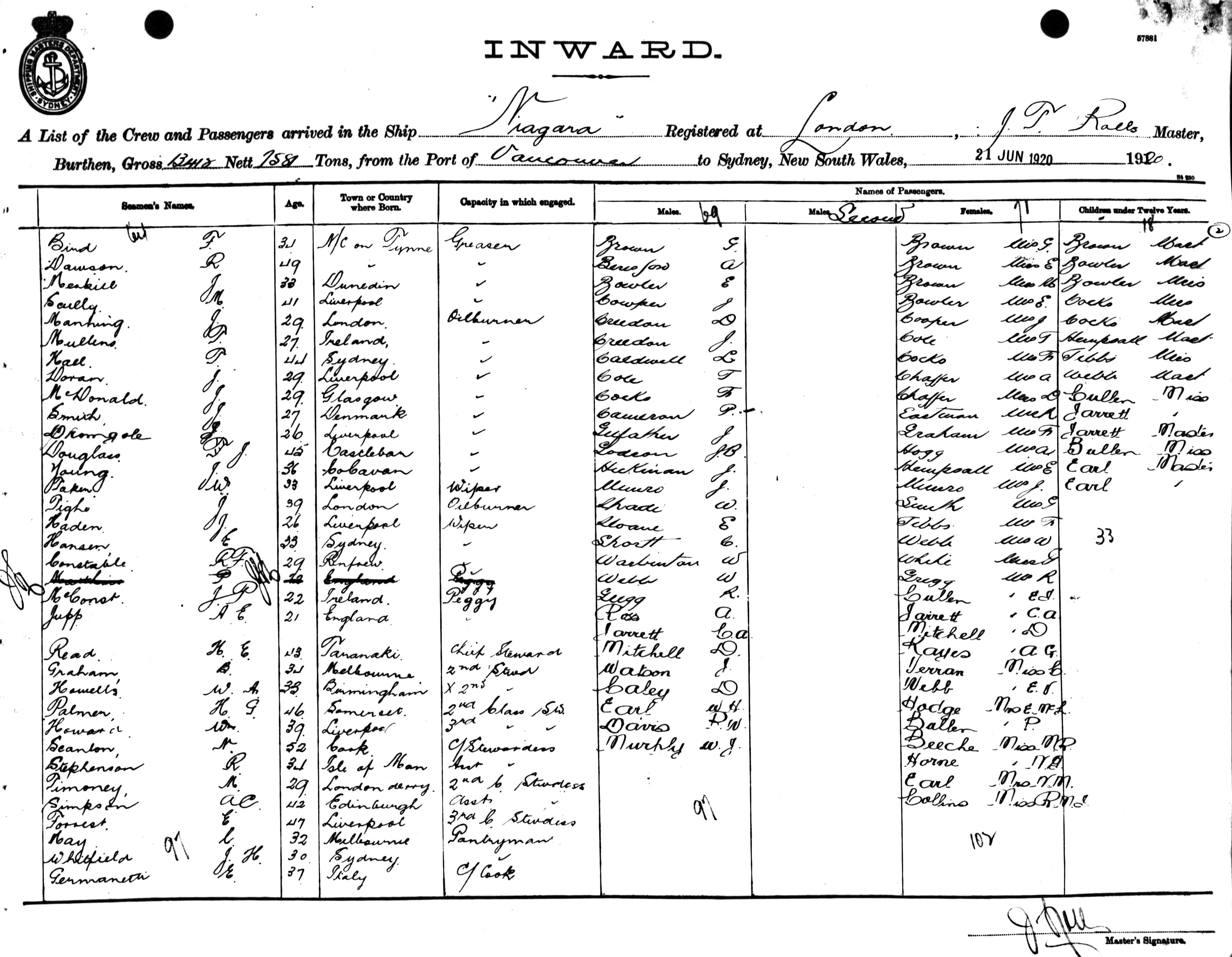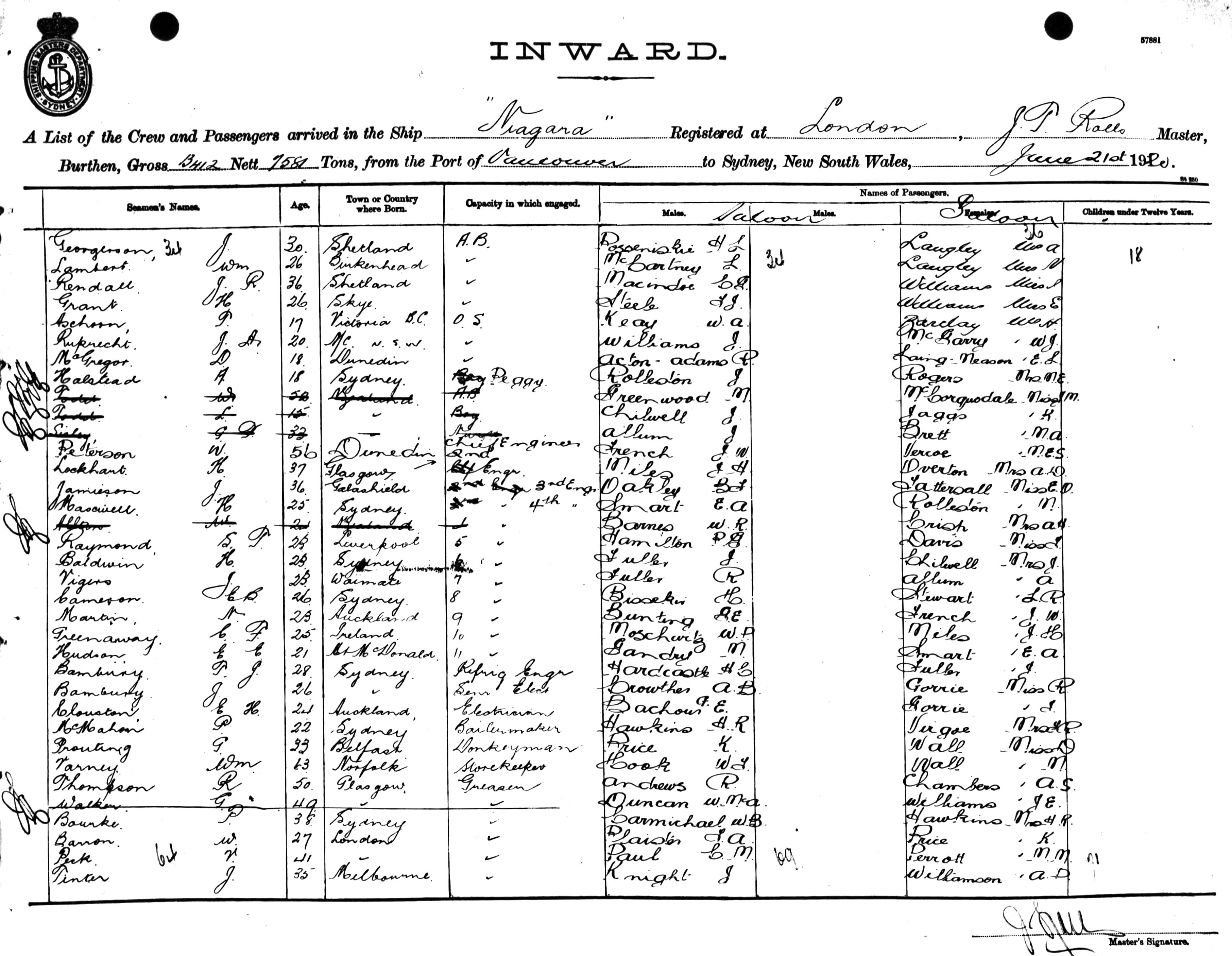 Mariners and ships in Australian Waters | NIAGARAOF LONDON, J. T. ROLLS, MASTER, BURTHEN 13412/7581 TONS FROM THE PORT OF VANCOUVER TO SYDNEY, NEW SOUTH WALES, 21ST JUNE 1920 |