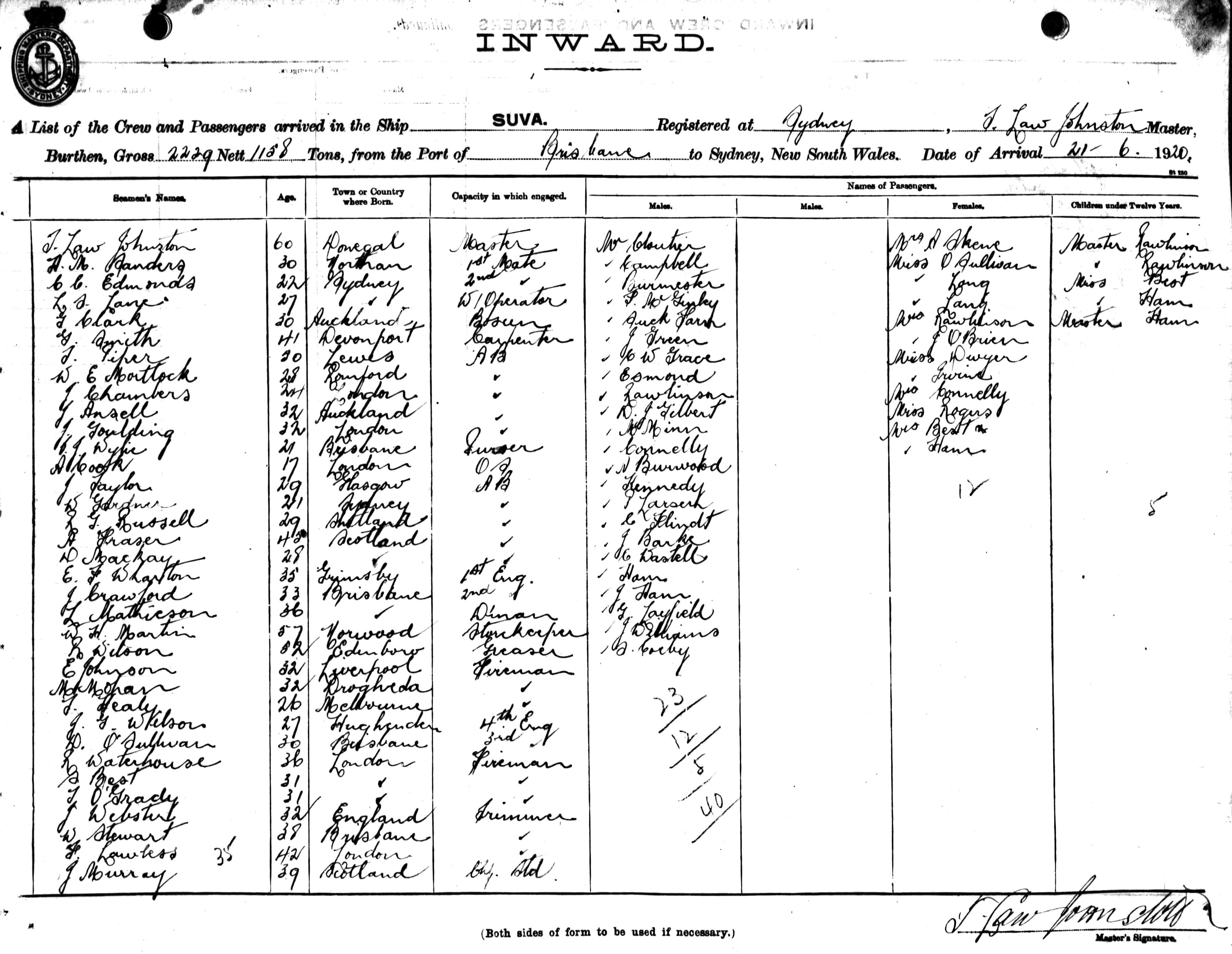 SUVAOF SYDNEY, T. LAW JOHNSTON, MASTER, BURTHEN 2229/1158 TONS FROM THE PORT OF BRISBANE TO SYDNEY, NEW SOUTH WALES, 21ST JUNE 1920 |