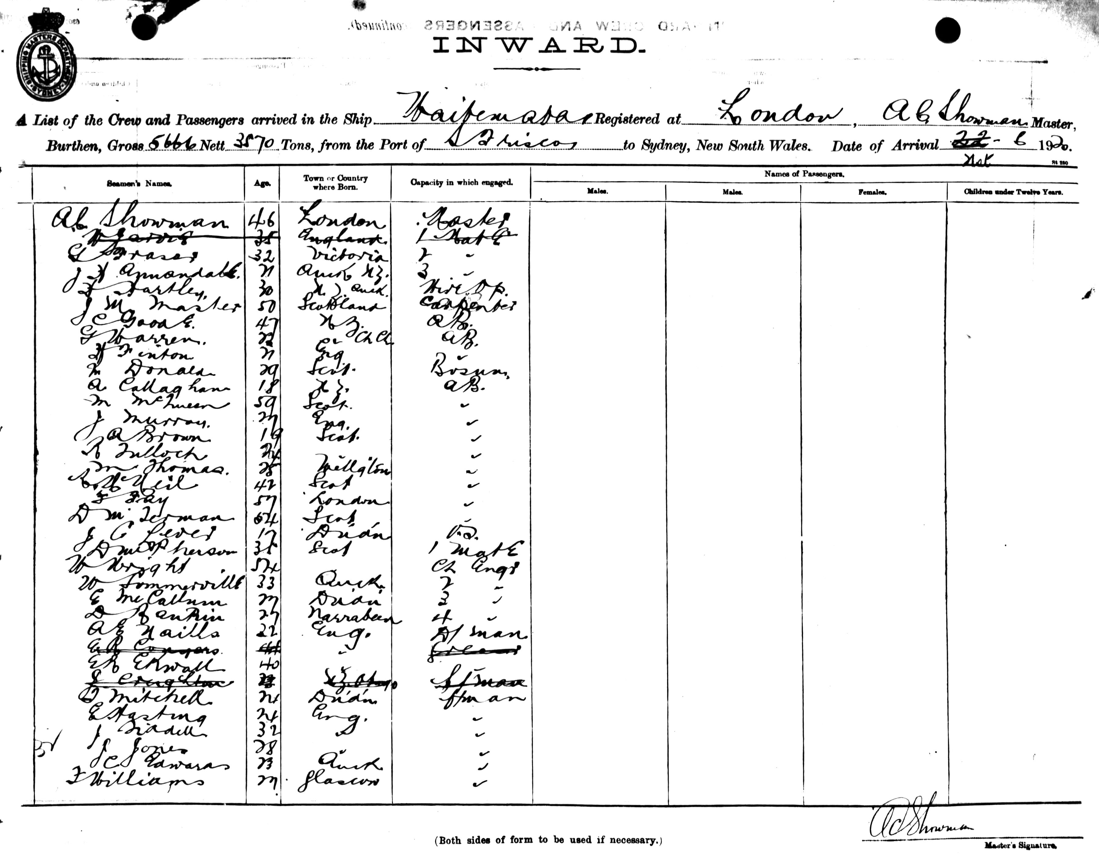 Mariners and ships in Australian Waters | WAITEMATAOF LONDON, A. C. SHOWMAN, MASTER, BURTHEN 5666/3570 TONS FROM THE PORT OF SAN FRANCISCO TO SYDNEY, NEW SOUTH WALES, 21ST JUNE 1920 |