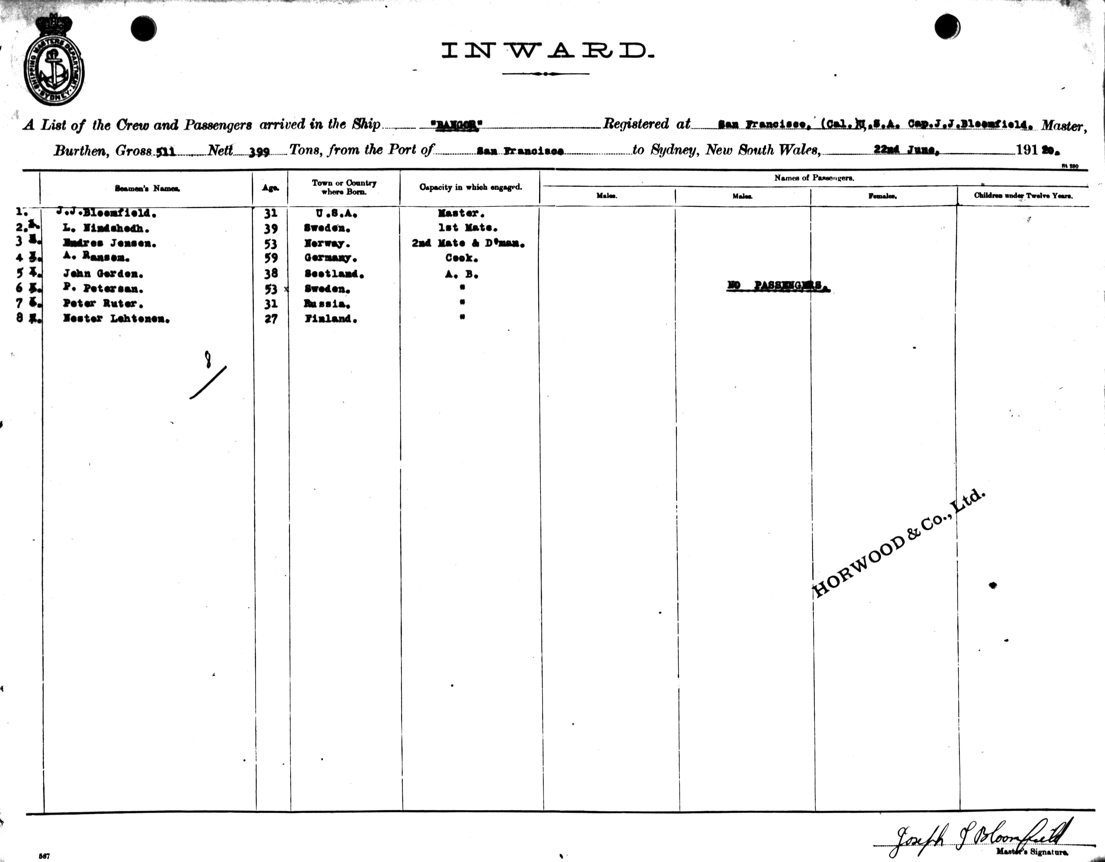 BANGOROF SAN FRANCISCO, J. J. BLOOMFIELD, MASTER, BURTHEN 511/399 TONS FROM THE PORT OF SAN FRANCISCO TO SYDNEY, NEW SOUTH WALES, 22ND JUNE 1920 |