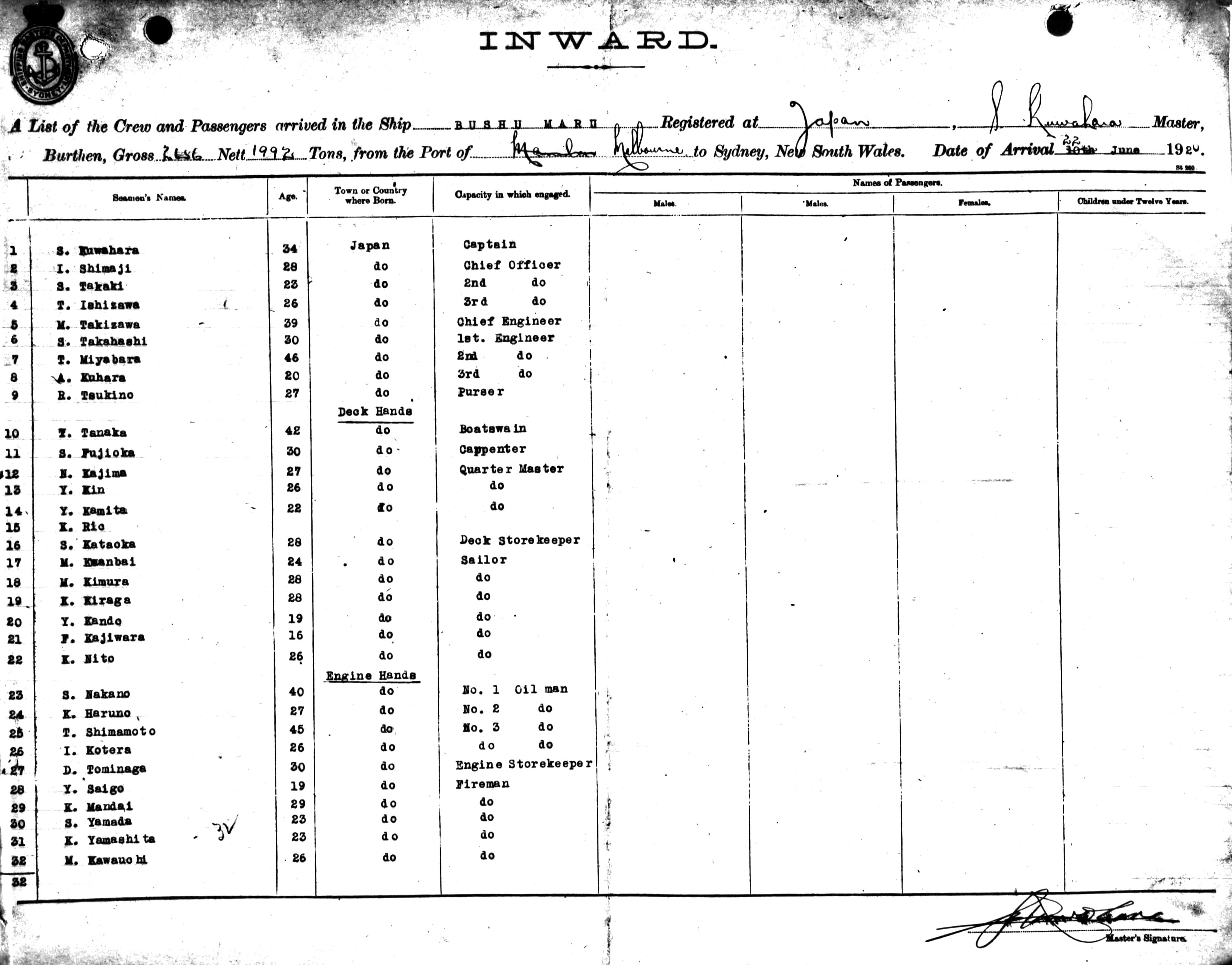 BUSHU MARUOF JAPAN, S. KUWAHARA, MASTER, BURTHEN 2656/1932 TONS FROM THE PORT OF MELBOURNE TO SYDNEY, NEW SOUTH WALES, 22ND JUNE 1920 |