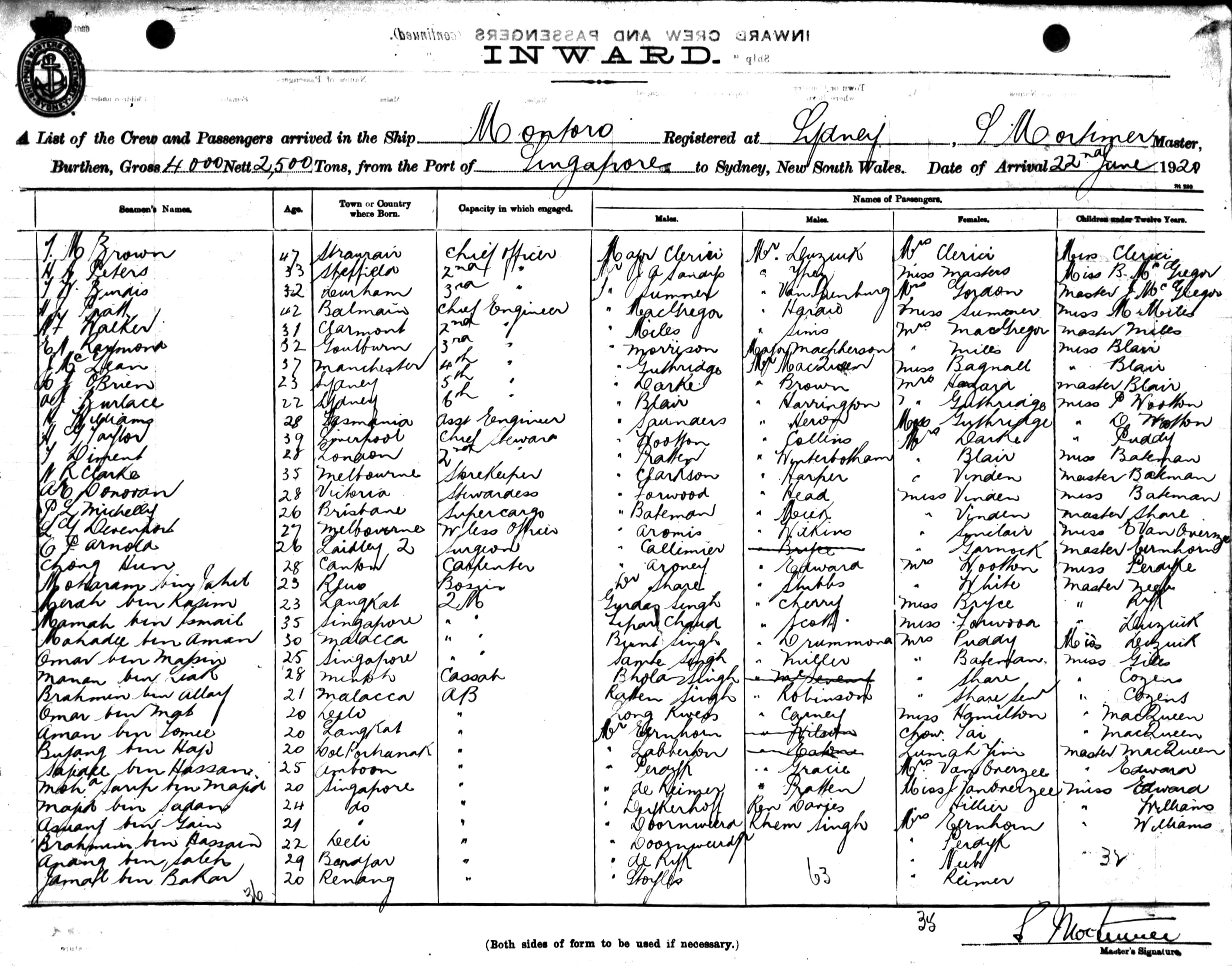 MONTOROOF SYDNEY, S. MORTIMER, MASTER, BURTHEN 4000/2500 TONS FROM THE PORT OF SINGAPORE TO SYDNEY, NEW SOUTH WALES, 22ND JUNE 1920 |