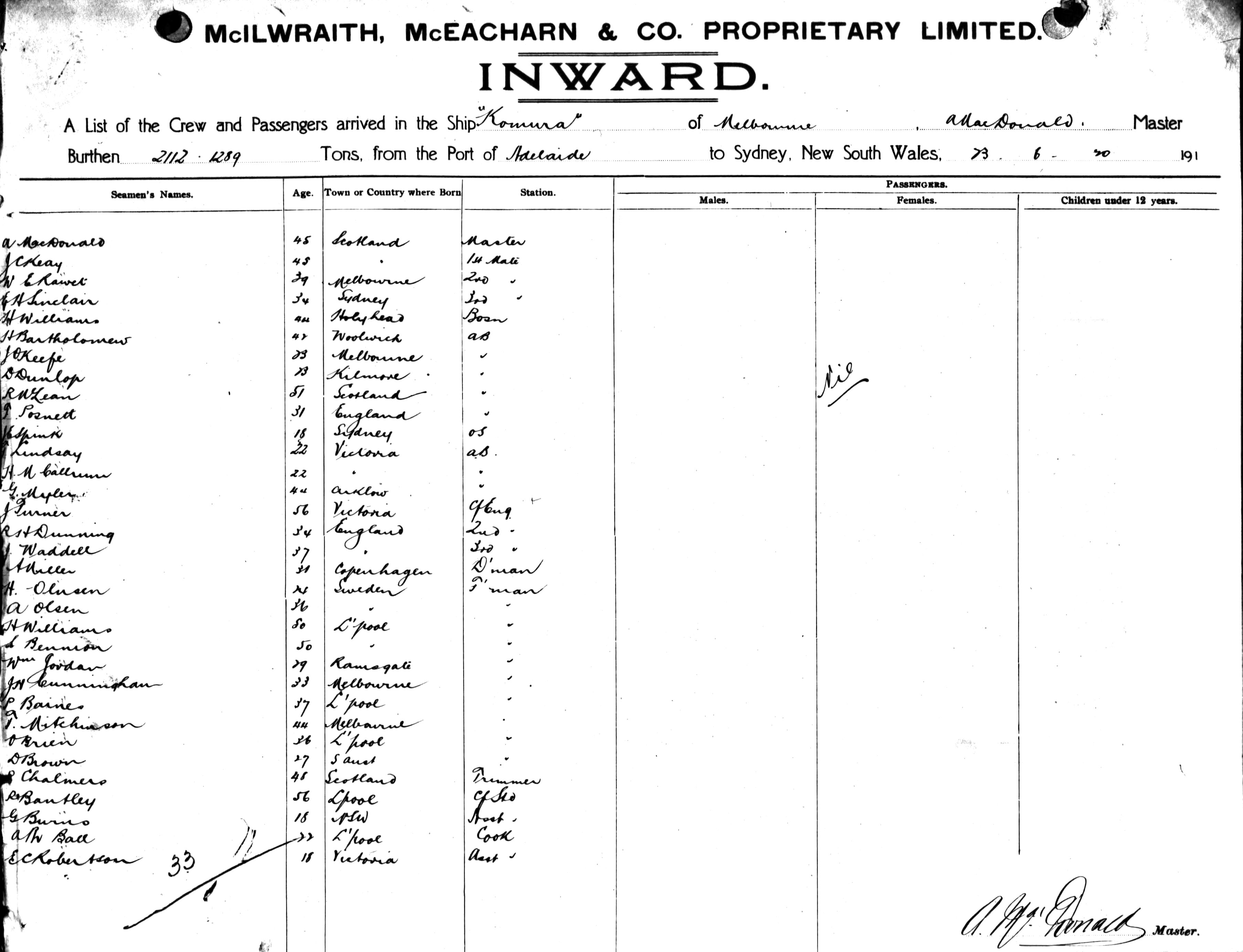 KOMURAOF MELBOURNE, A. MACDONALD, MASTER, BURTHEN 2112/1289 TONS FROM THE PORT OF ADELAIDE TO SYDNEY, NEW SOUTH WALES, 23RD JUNE 1920 |