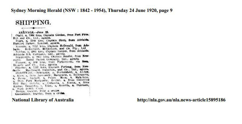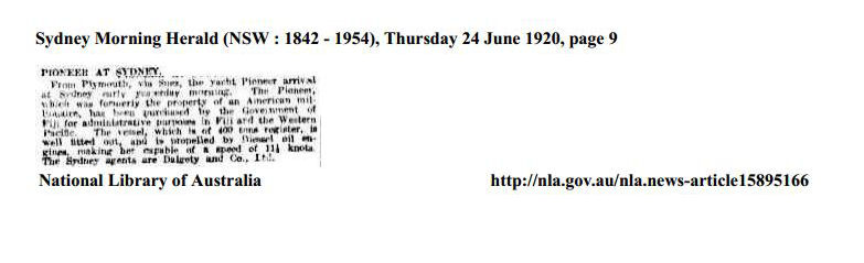 PIONEEROF FIJI, ?, MASTER, BURTHEN 400 TONS FROM THE PORT OF PORTSMOUTH via SUEZ TO SYDNEY, NEW SOUTH WALES, 23RD JUNE 1920 |