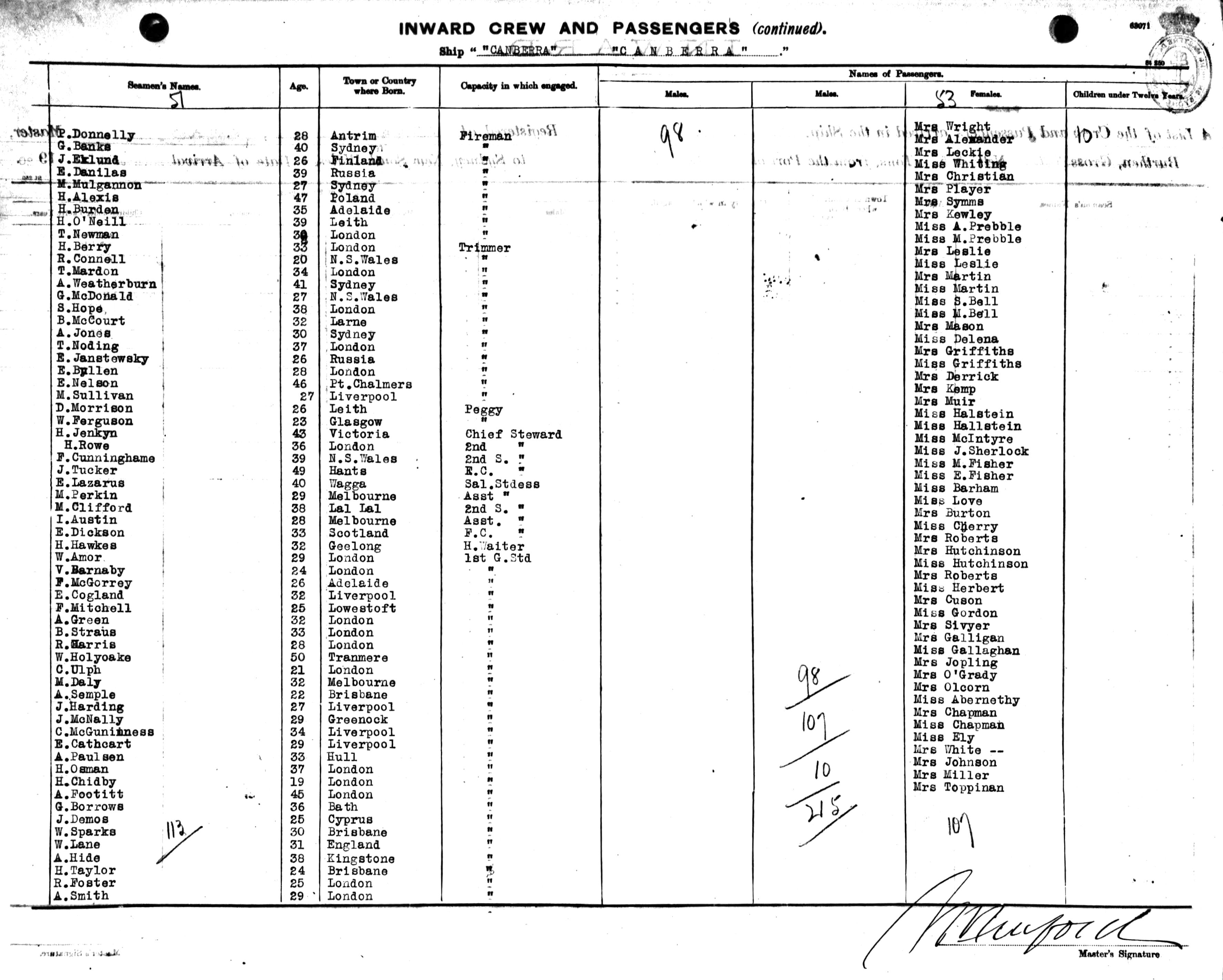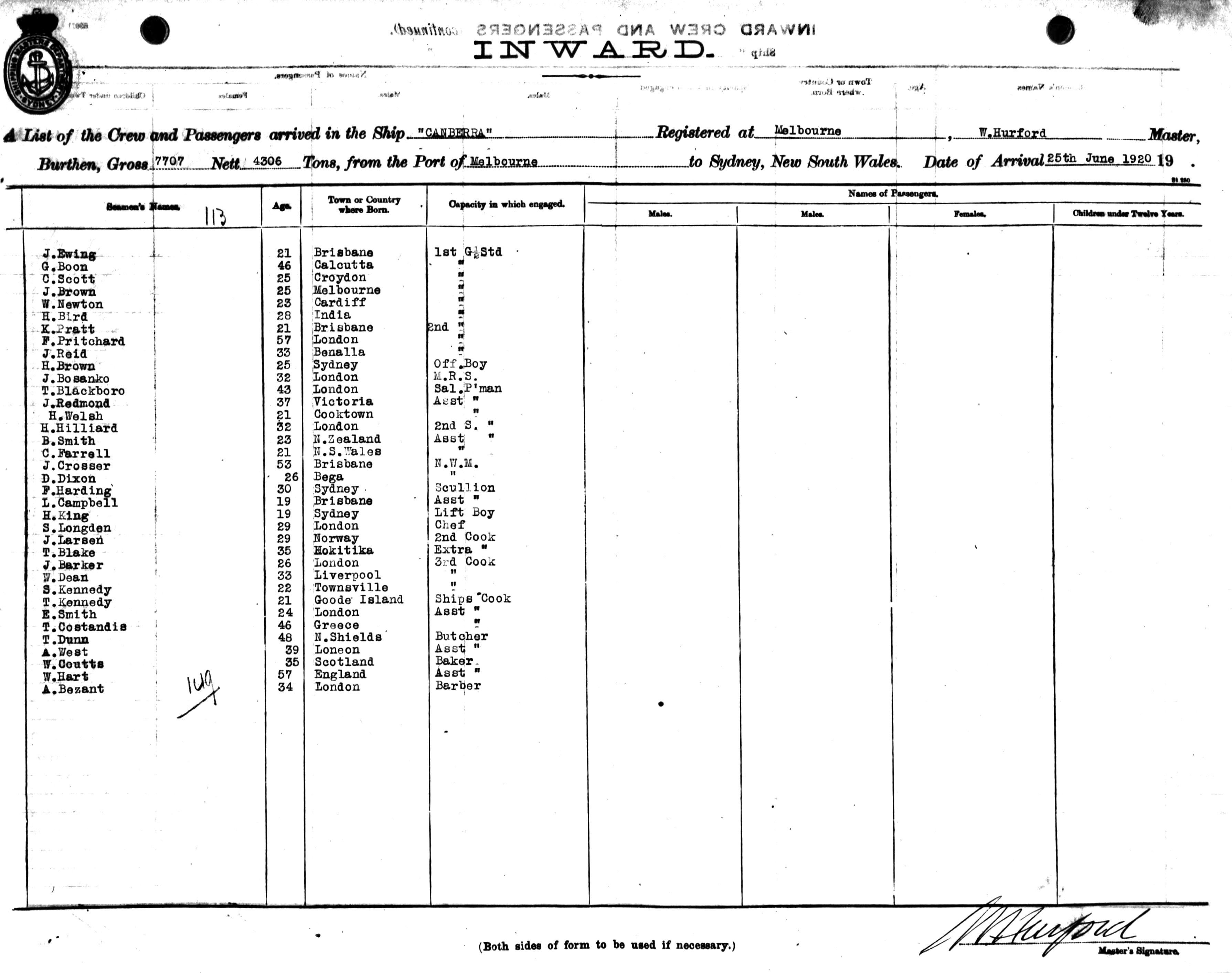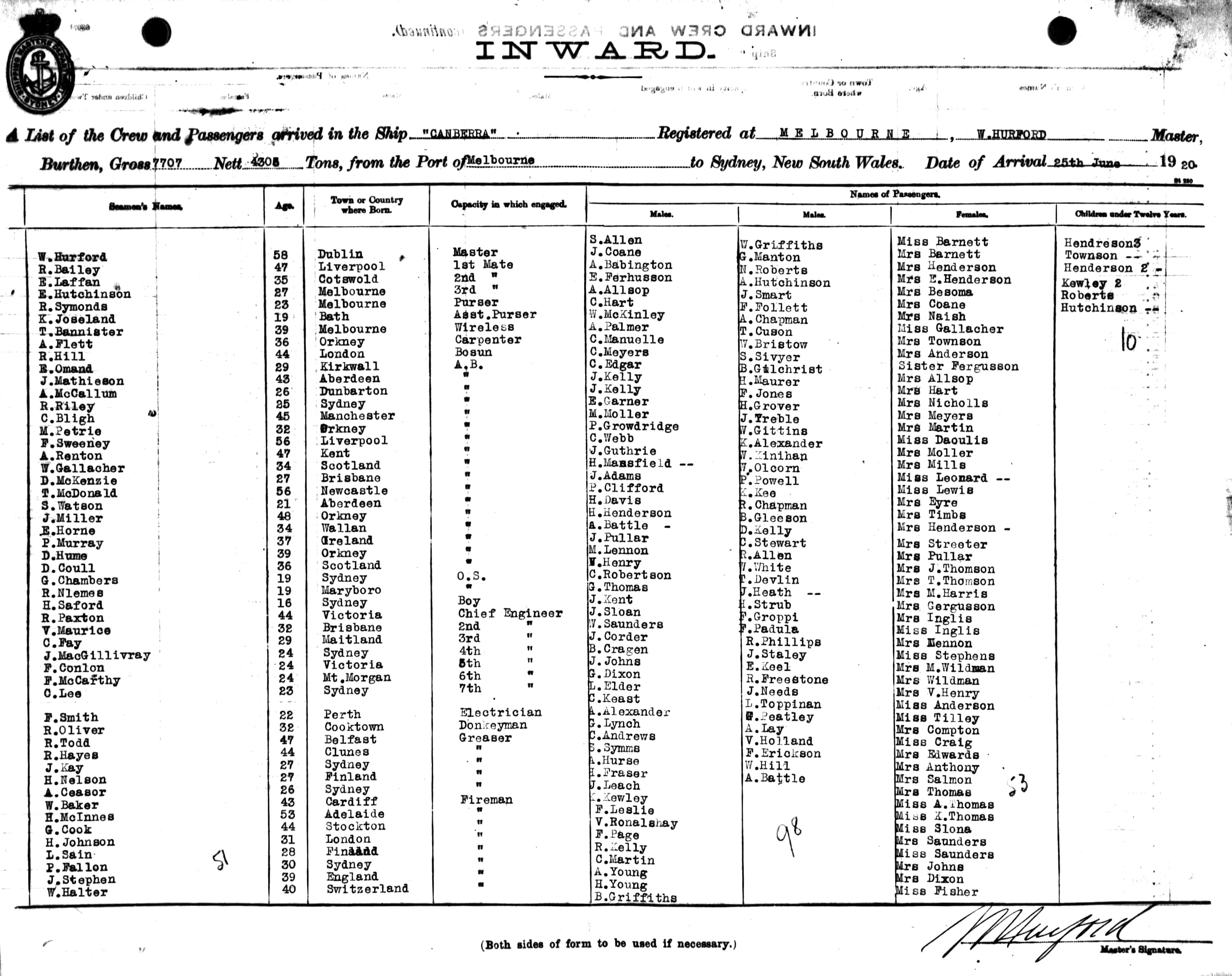 CANBERRAOF MELBOURNE, W. HURFORD, MASTER, BURTHEN 7707/4305 TONS FROM THE PORT OF MELBOURNE TO SYDNEY, NEW SOUTH WALES, 25TH JUNE 1920 |