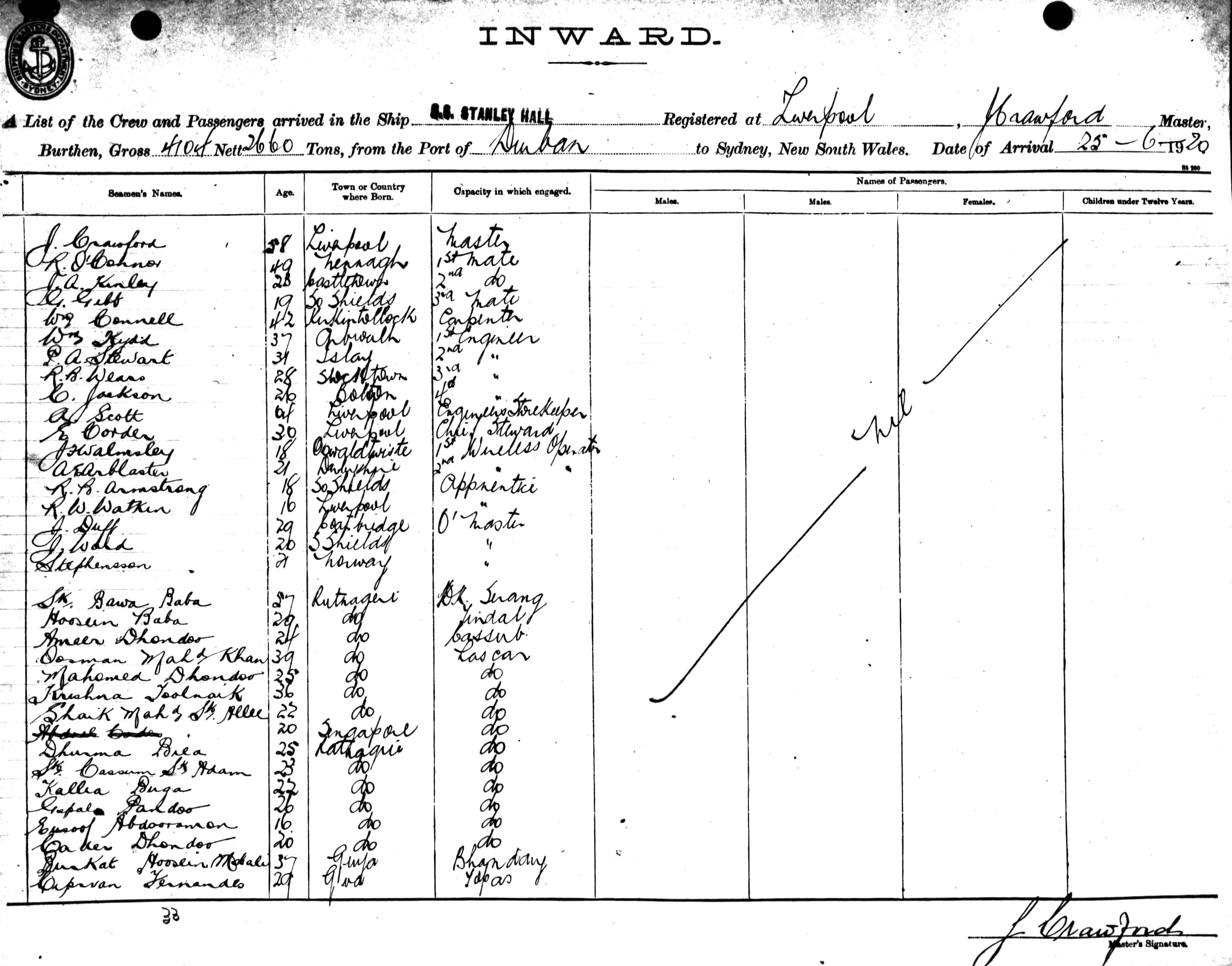 Mariners and ships in Australian Waters | STANLEY HALLOF LIVERPOOL, J. CRAWFORD, MASTER, BURTHEN 4104/2660 TONS FROM THE PORT OF DURBAN TO SYDNEY, NEW SOUTH WALES, 25TH JUNE 1920 |