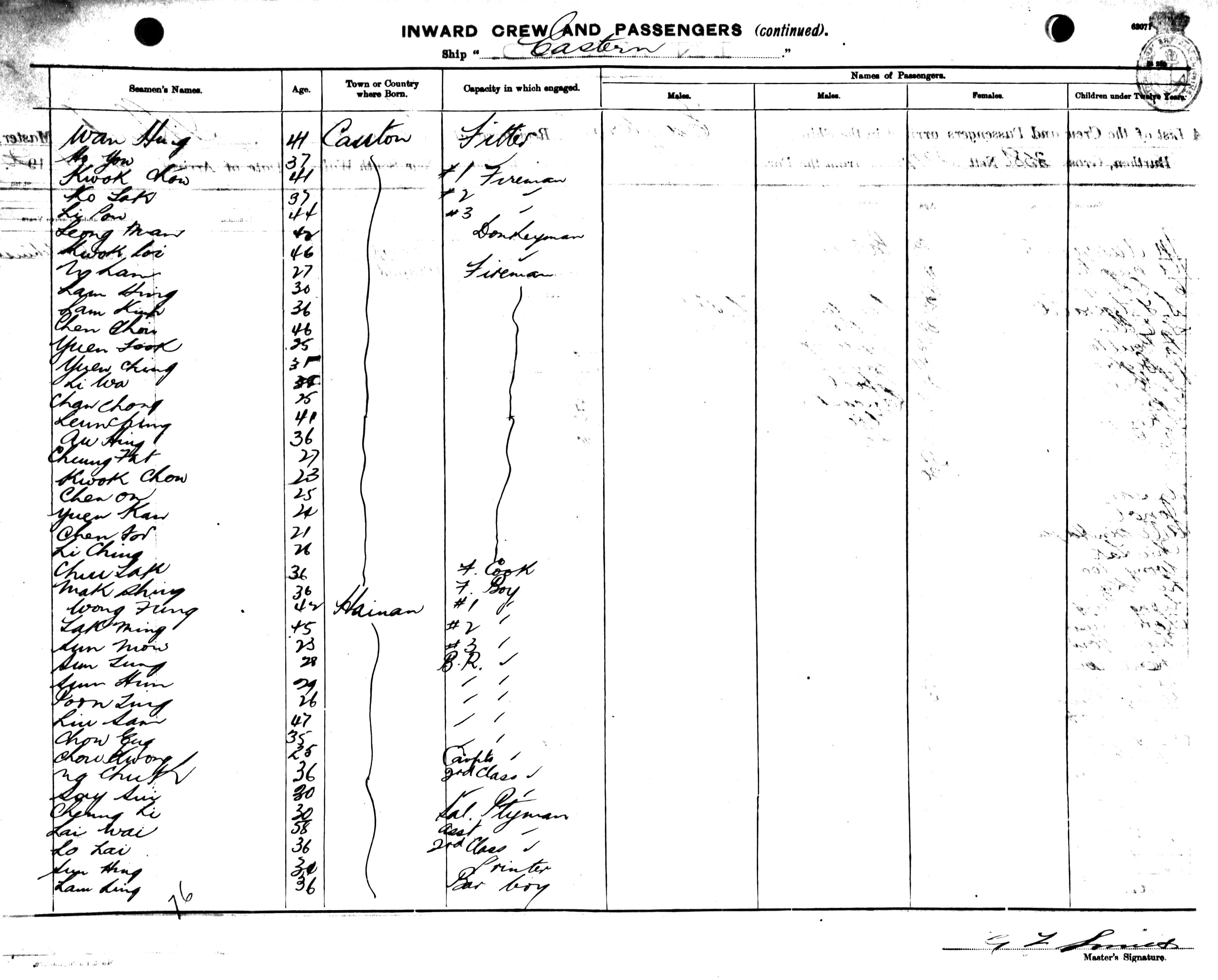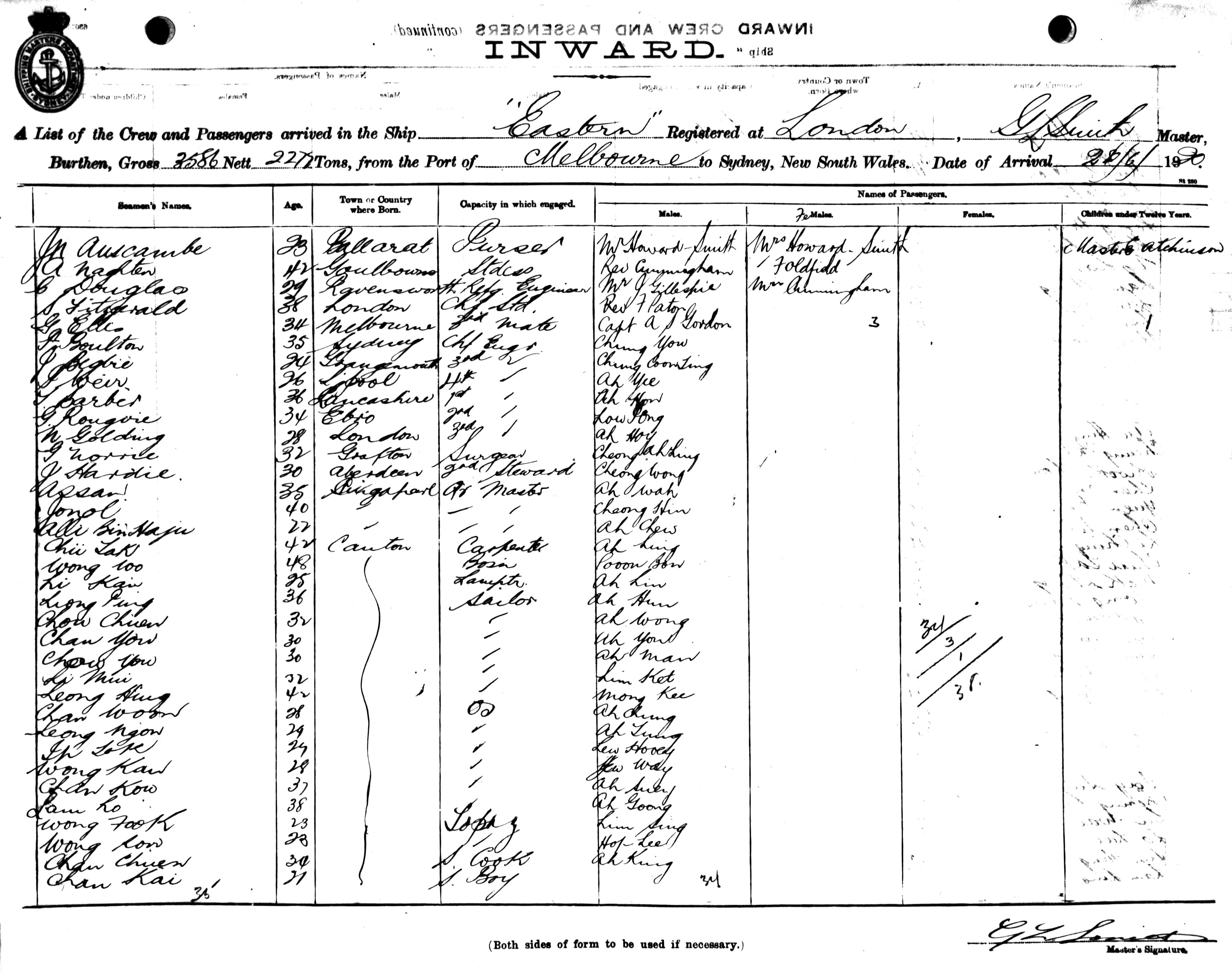 Source: State Records Authority of New South Wales: Shipping Master's Office; Passengers Arriving 1855 - 1922; NRS13278, [X444] reel 2110 & 2111. Transcribed by Lyn & Maurie. You may view/print a scan of the original list - a monitor set to high resolution is recommended for clarity. Use your back button to return. |