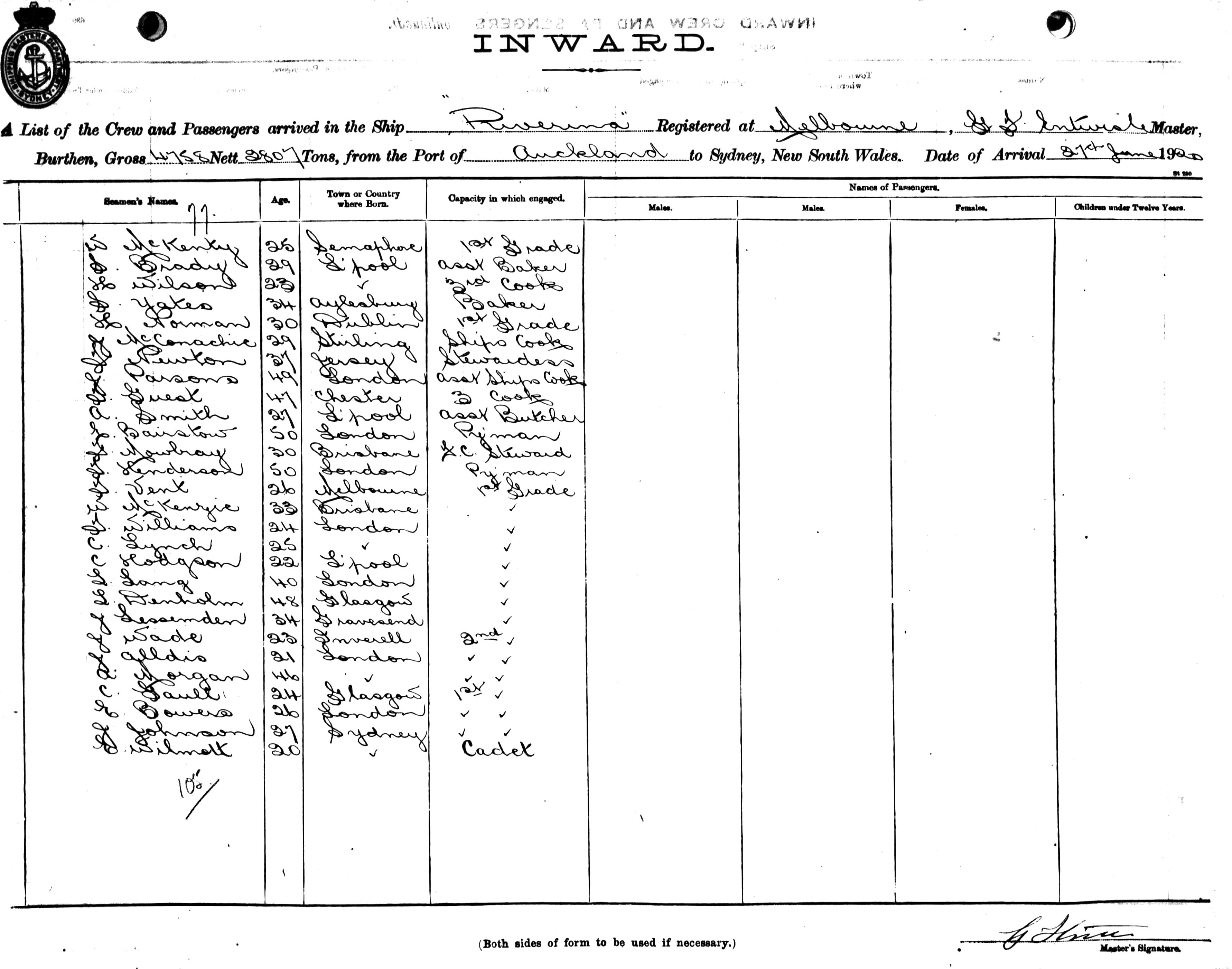 RIVERINAOF MELBOURNE, G. F. ENTWISLE, MASTER, BURTHEN 4758/2807 TONS FROM THE PORT OF AUCKLAND TO SYDNEY, NEW SOUTH WALES, 27TH JUNE 1920 |