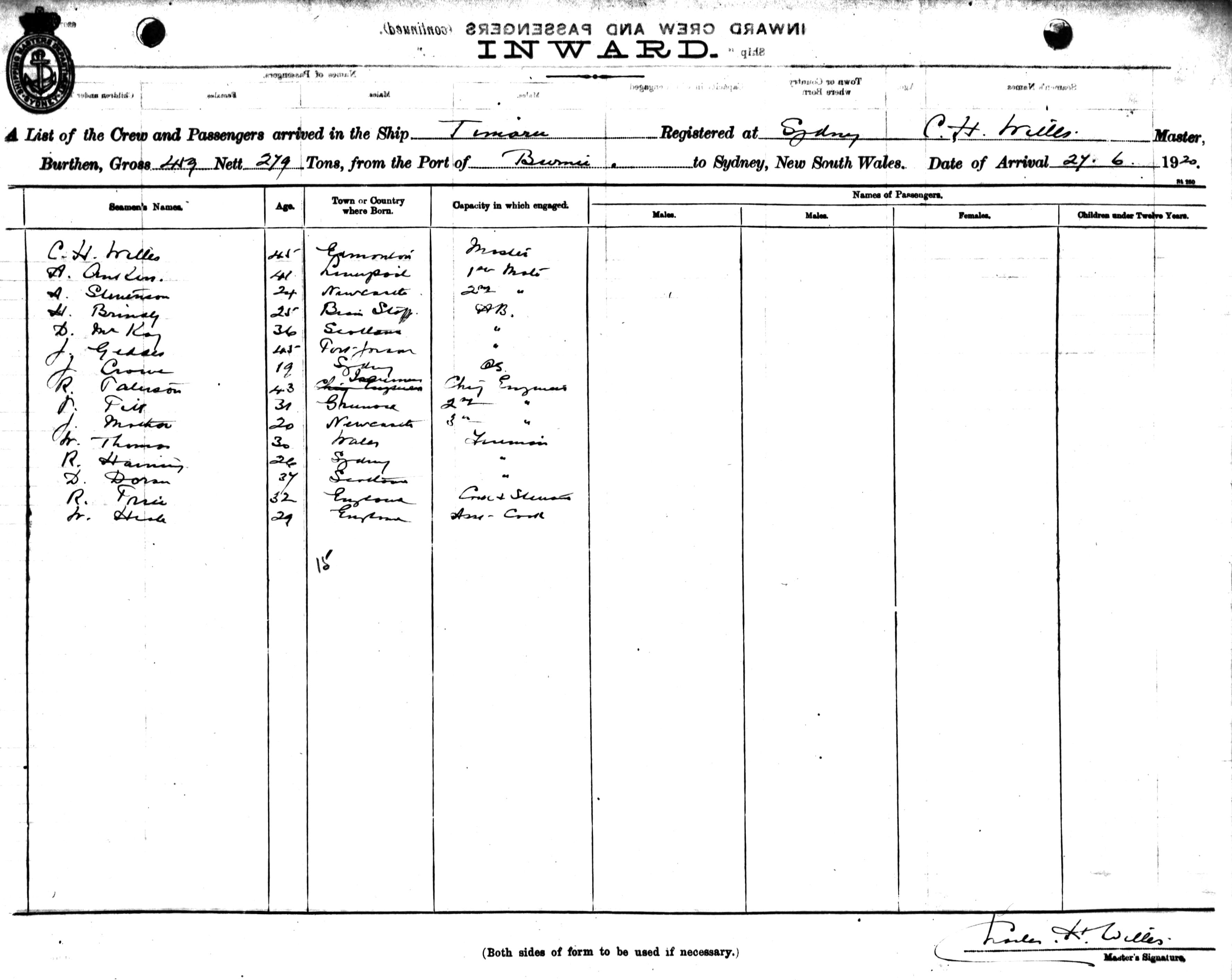 TIMARUOF SYDNEY, C. H. WILLES, MASTER, BURTHEN 459/279 TONS FROM THE PORT OF BURNIE TO SYDNEY, NEW SOUTH WALES, 27TH JUNE 1920 |