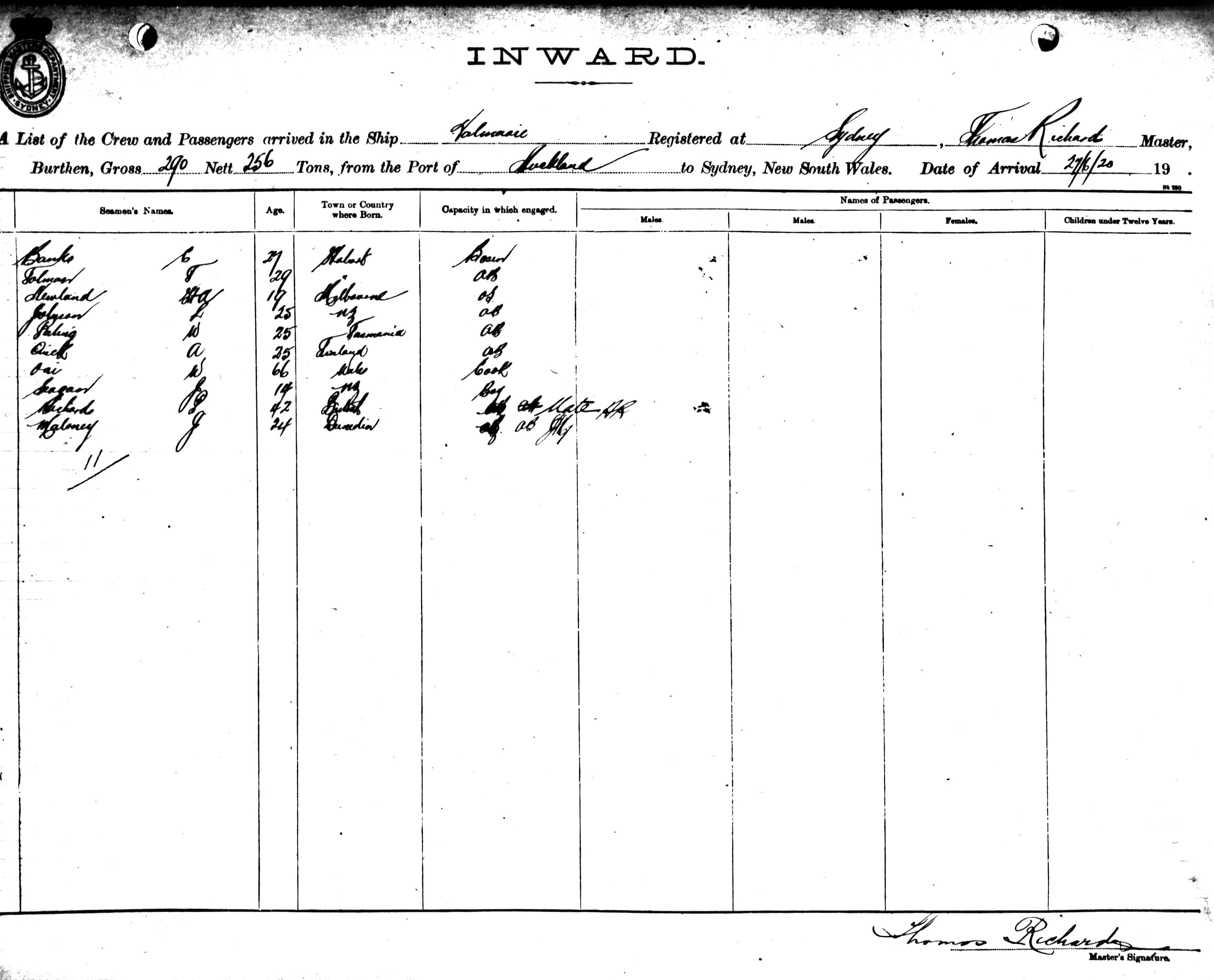 VALMARIEOF SYDNEY, THOMAS RICHARDS, MASTER, BURTHEN 290?256 TONS FROM THE PORT OF AUCKLAND TO SYDNEY, NEW SOUTH WALES, 27TH JUNE 1920 |