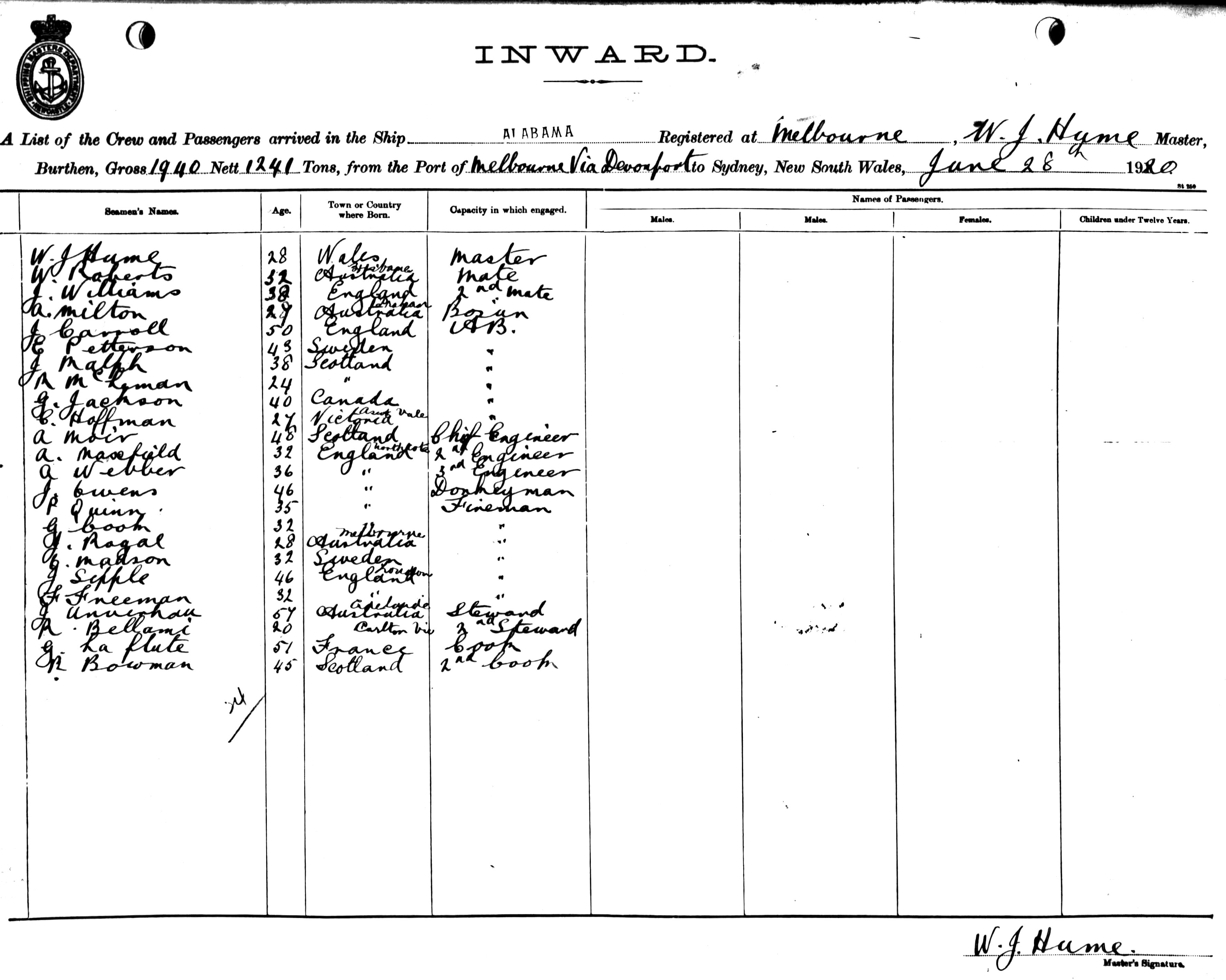 Mariners and ships in Australian Waters | ALABAMAOF MELBOURNE, W. J. HUME, MASTER, BURTHEN 1940/1241 TONS FROM THE PORT OF MELBOURNE via DEVONPORT TO SYDNEY, NEW SOUTH WALES, 28TH JUNE 1920 |
