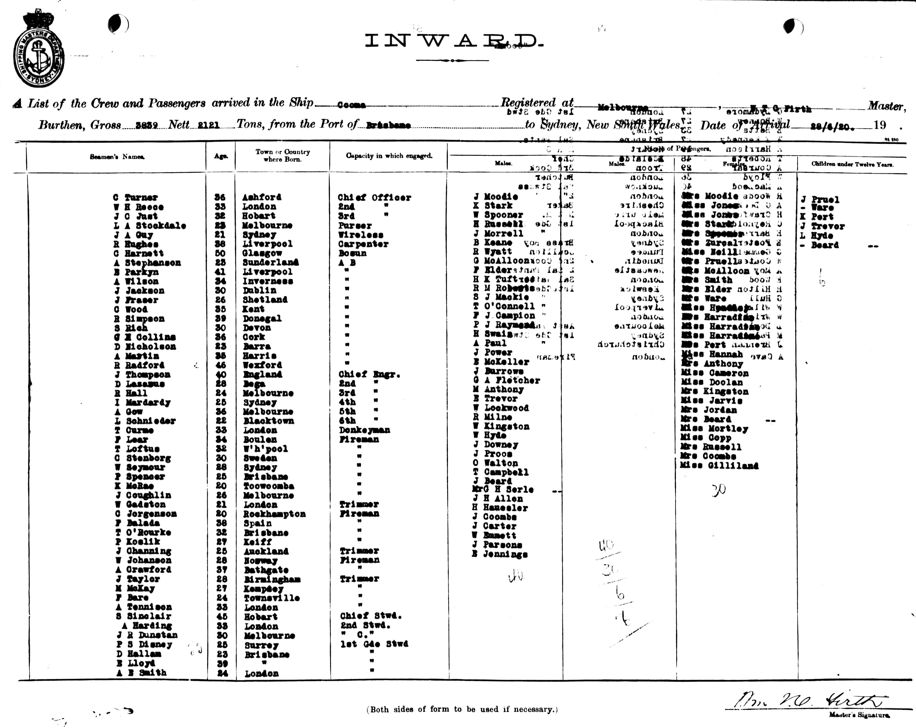 COOMAOF MELBOURNE, W. T. C. FIRTH, MASTER, BURTHEN 3839/2121 TONS FROM THE PORT OF BRISBANE TO SYDNEY, NEW SOUTH WALES, 28TH JUNE 1920 |