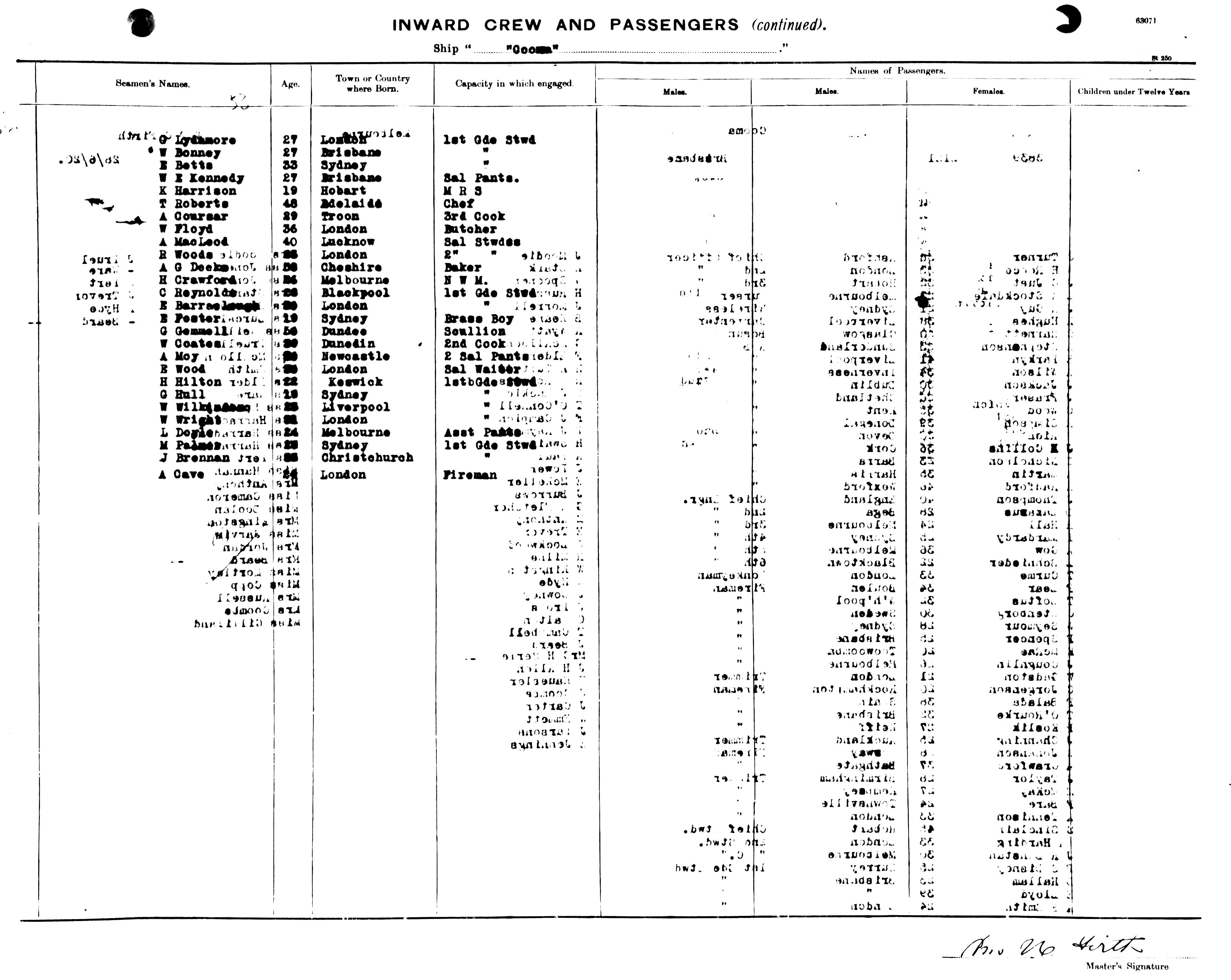 Source: State Records Authority of New South Wales: Shipping Master's Office; Passengers Arriving 1855 - 1922; NRS13278, [X444] reel 2110 & 2111. Transcribed by Lyn & Maurie. You may view/print a scan of the original list - a monitor set to high resolution is recommended for clarity. Use your back button to return. |