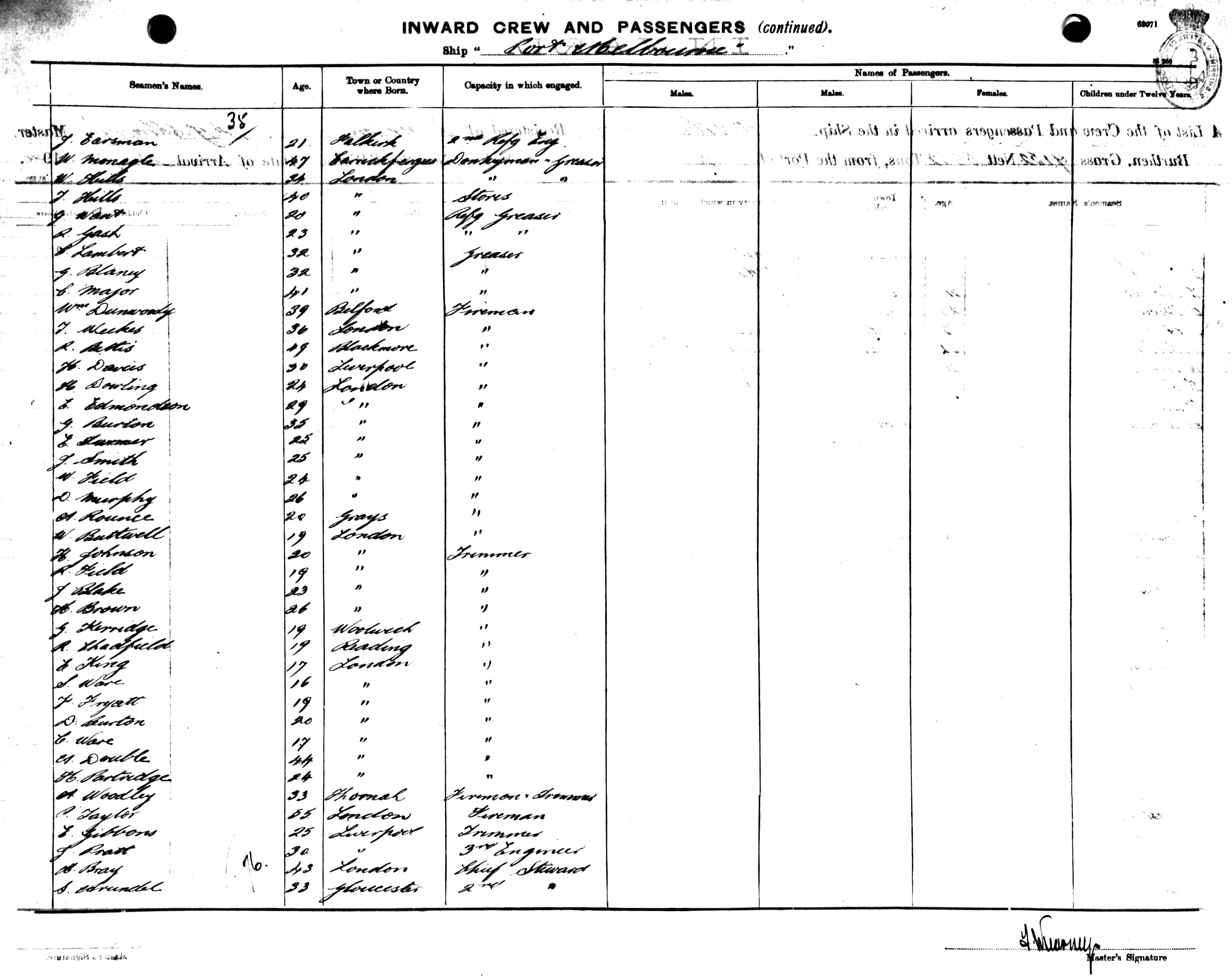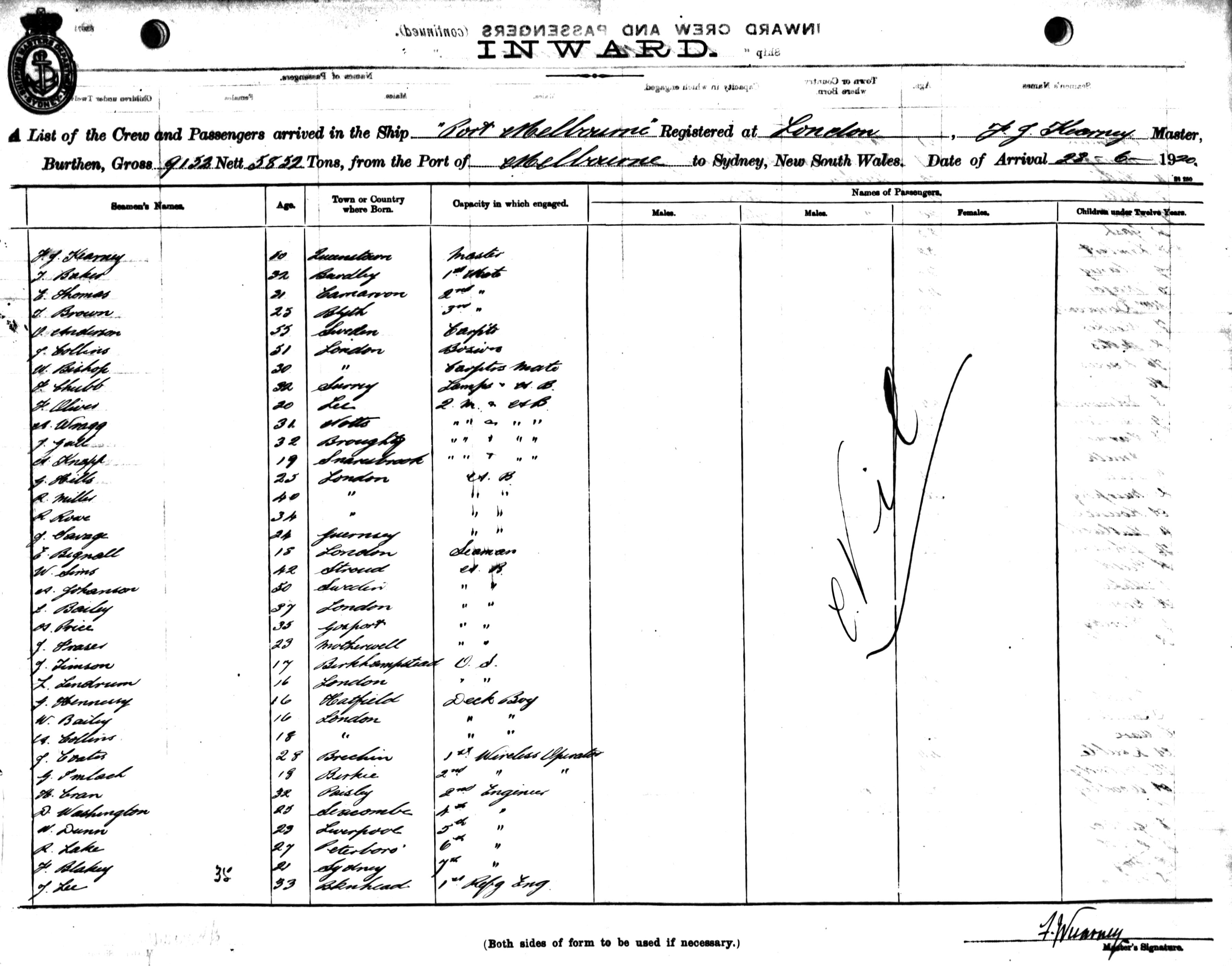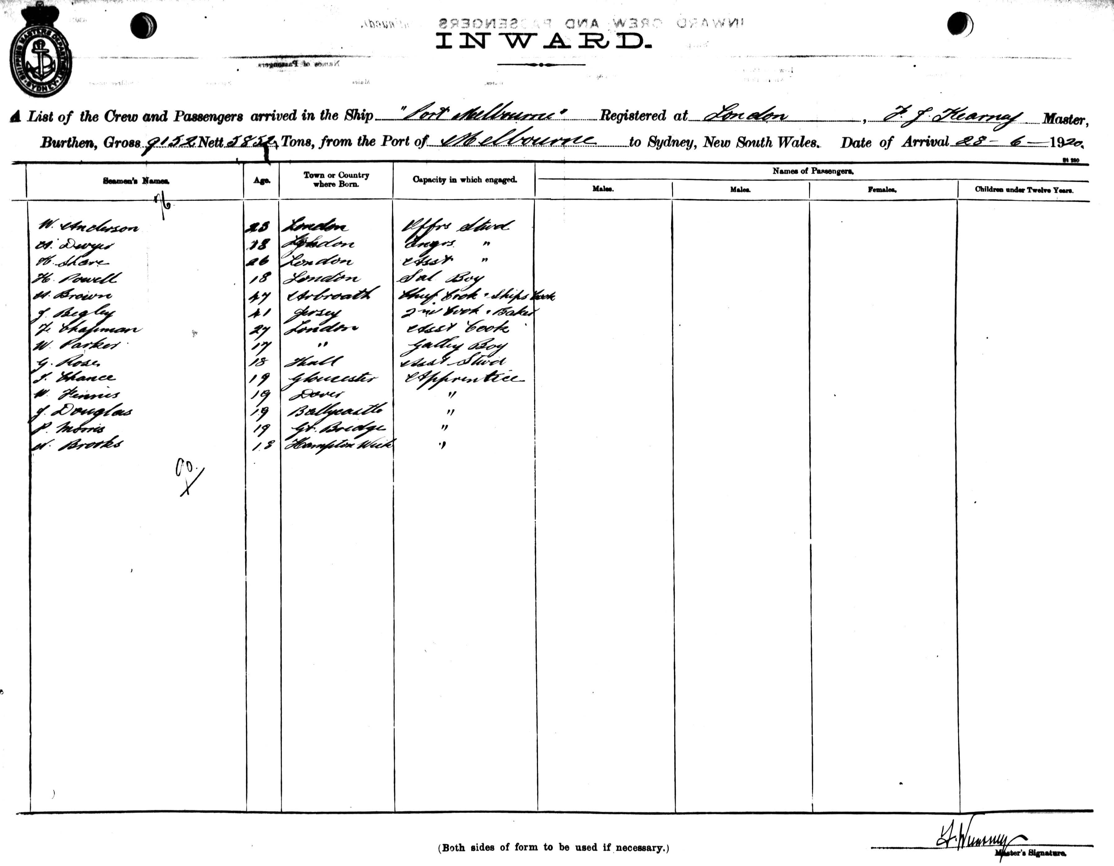 PORT MELBOURNEOF LONDON, F. J. KEARNEY, MASTER, BURTHEN 9152/5852 TONS FROM THE PORT OF MELBOURNE TO SYDNEY, NEW SOUTH WALES, 28TH JUNE 1920 |