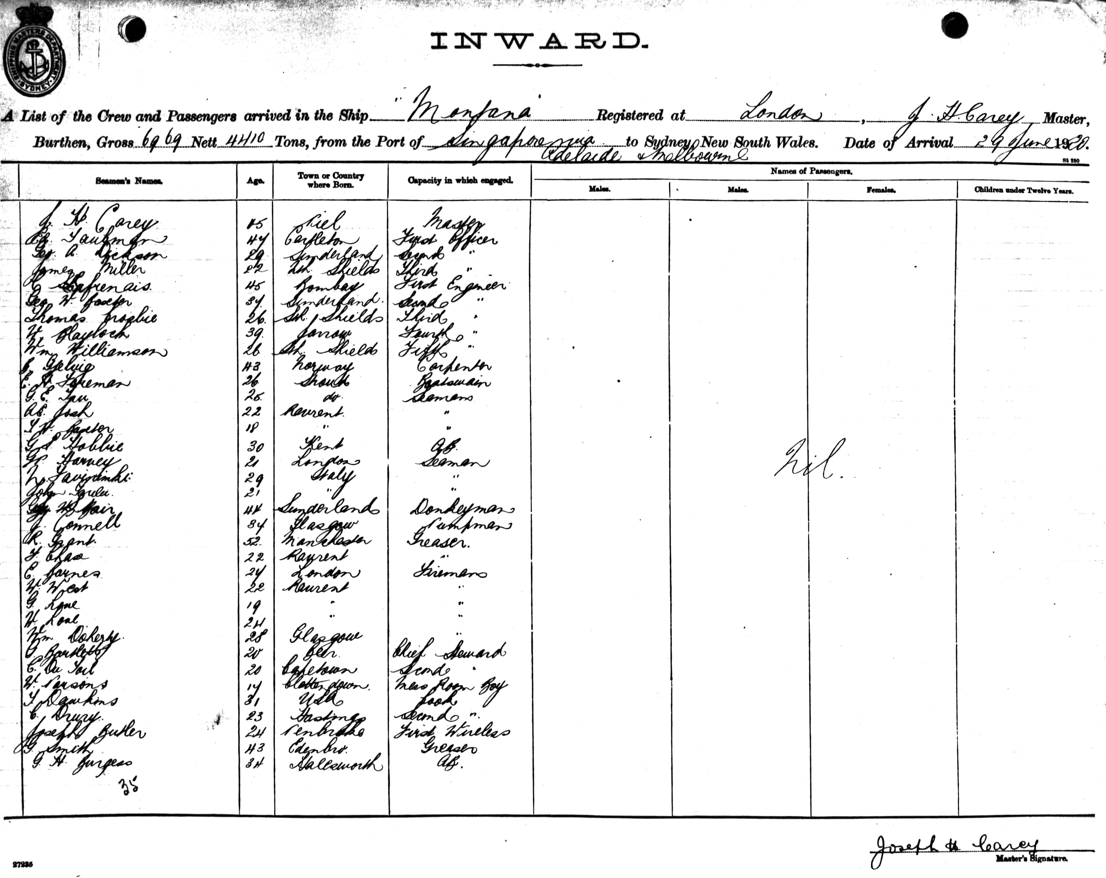 Source: State Records Authority of New South Wales: Shipping Master's Office; Passengers Arriving 1855 - 1922; NRS13278, [X444] reel 2110 & 2111. Transcribed by Nerryle Scriven. Proofread by Lyn & Maurie. You may view/print a scan of the original list - a monitor set to high resolution is recommended for clarity. Use your back button to return. |