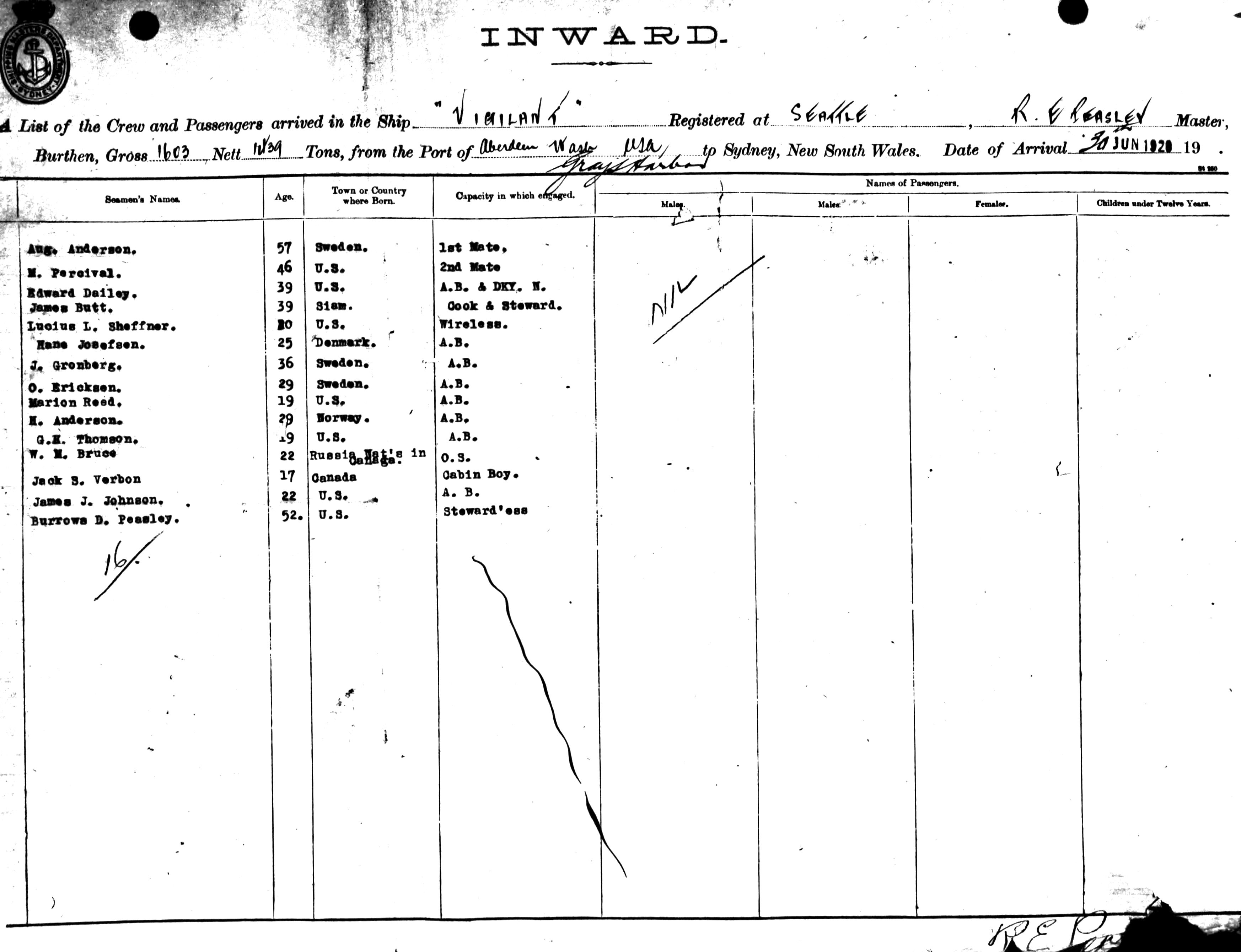 VIGILANTOF SEATTLE, R. E. PEASLEY, MASTER, BURTHEN 1603/1439 TONS FROM THE PORT OF ABERDEEN & GRAYS HARBOR, WASHINGTON STATE, U.S.A. TO SYDNEY, NEW SOUTH WALES, 3OTH JUNE 1920 |