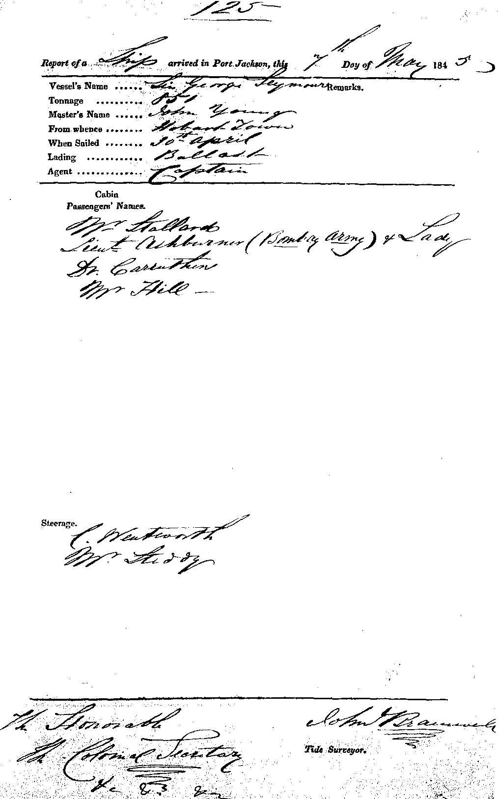 SIR GEORGE SEYMOURSHIP, TONNAGE 851, MASTER YOUNG, SAILED 30 APRIL 1845 FROM WHENCE, HOBART TOWN TO PORT JACKSON 7 MAY, 1845 |