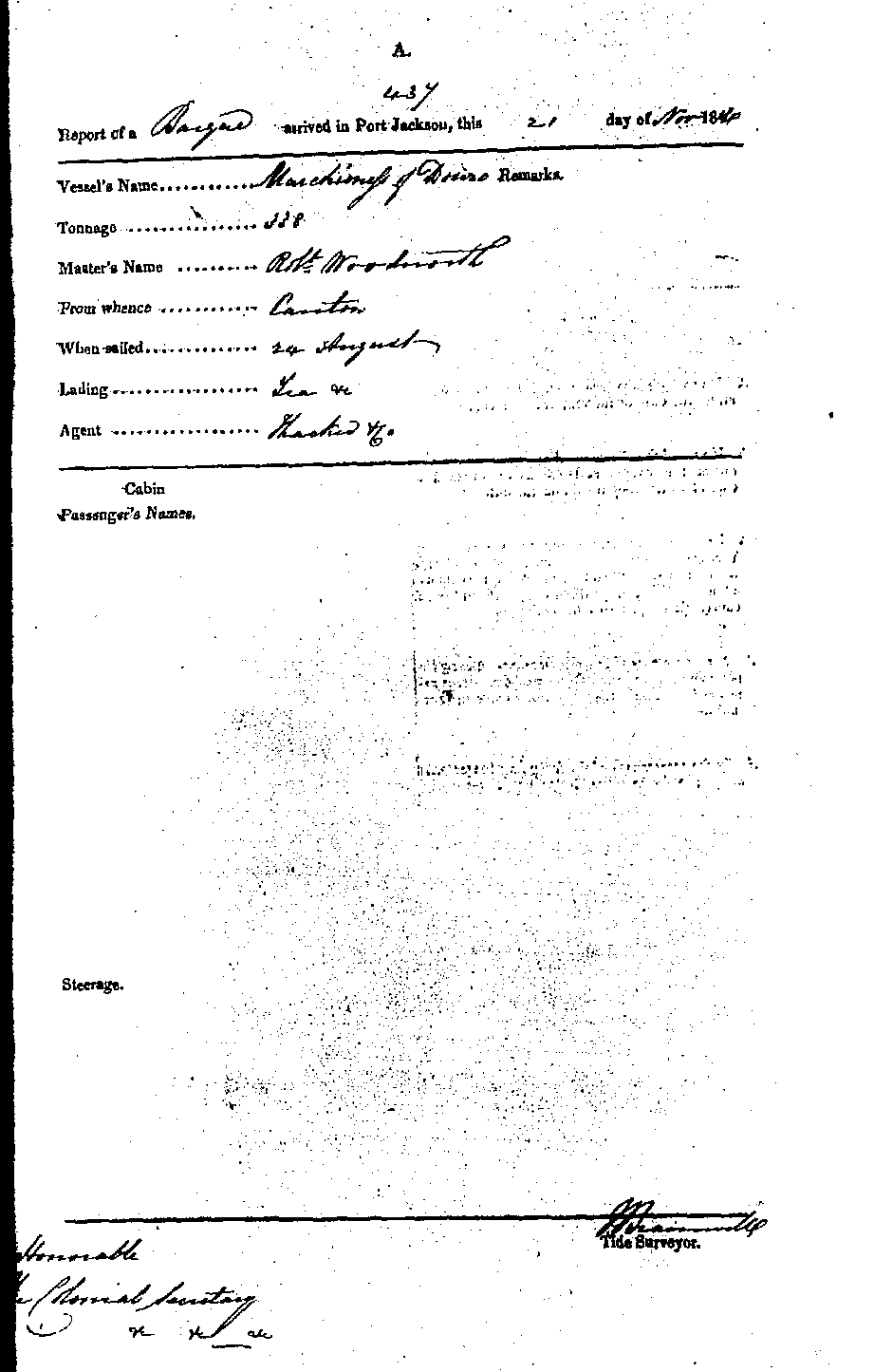 MARCHIONESS OF DOUROBARQUE, TONNAGE 338, MASTER WOODNORTH, SAILED 24TH AUGUST 1846 FROM WHENCE, CANTON TO PORT JACKSON 21ST NOVEMBER 1846 |