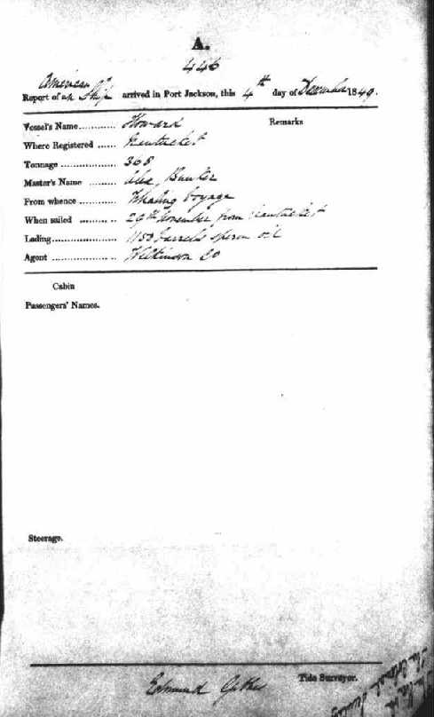 HOWARDAMERICAN SHIP, TONNAGE 308, MASTER BUNKER, SAILED 29TH NOV 1845 FROM WHENCE, NANTUCKET VIA HONG KONG ON A WHALING VOYAGE TO PORT JACKSON, 4TH DECEMBER 1849 |