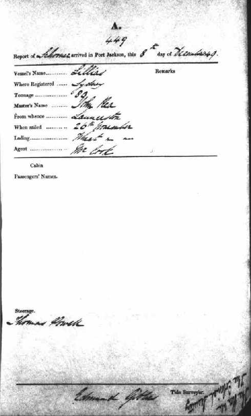 LILLIASSCHOONER, TONNAGE 89, MASTER REA, SAILED 26TH NOV 1849 FROM WHENCE, LAUNCESTON TO PORT JACKSON, 8TH DECEMBER 1849 |
