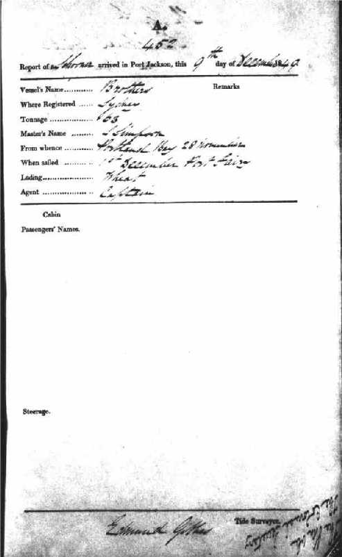 BROTHERSSCHOONER, TONNAGE 63, MASTER SIMPSON, SAILED 28TH NOV 1849 FROM WHENCE, PORTLAND BAY via PORT FAIRY TO PORT JACKSON, 9TH DECEMBER 1849 |