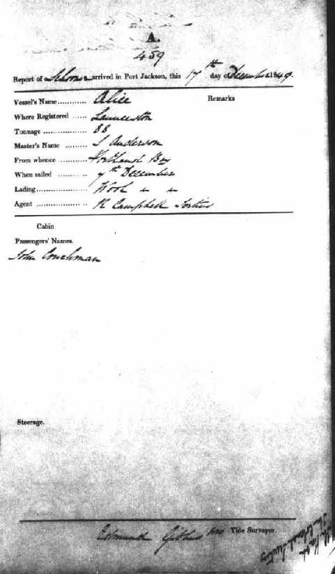 ALICESCHOONER, TONNAGE 88, MASTER ANDERSON, SAILED 7TH DECEMBER 1849 FROM WHENCE, PORTLAND BAY TO PORT JACKSON, 17TH DECEMBER 1849 |