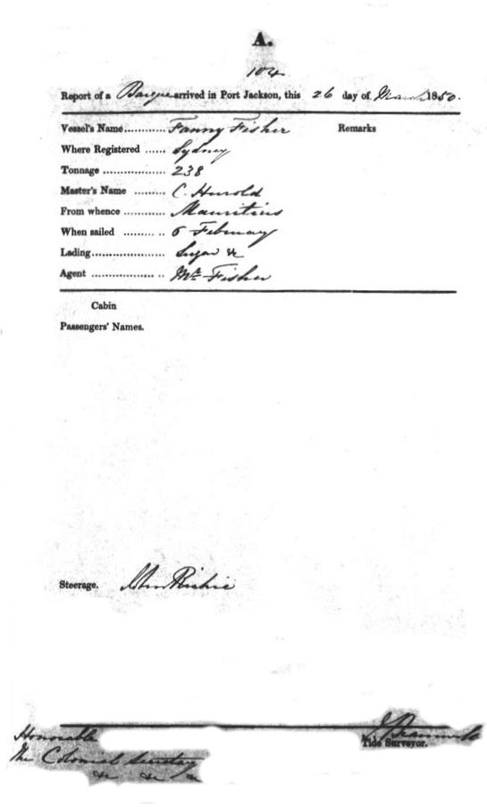 FANNY FISHERBARQUE OF SYDNEY, CHARLES HARROLD, MASTER, BURTHEN 238 TONS, FROM THE PORT OF MAURITIUS TO PORT JACKSON, NEW SOUTH WALES, 26TH MARCH 1850 |