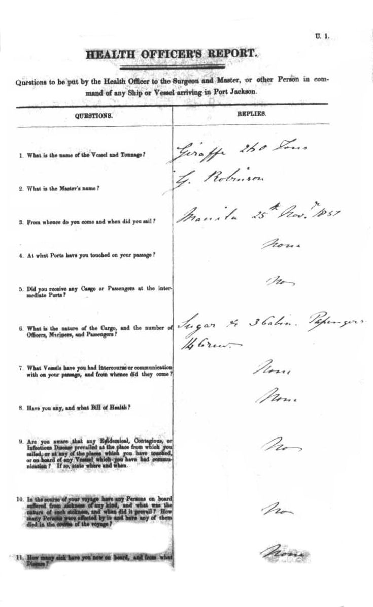 GIRAFFEBRIG OF SYDNEY, G. ROBINSON, MASTER, BURTHEN 260 TONS FROM THE PORT OF MANILA TO PORT JACKSON, NEW SOUTH WALES 16TH FEBRUARY 1852 |