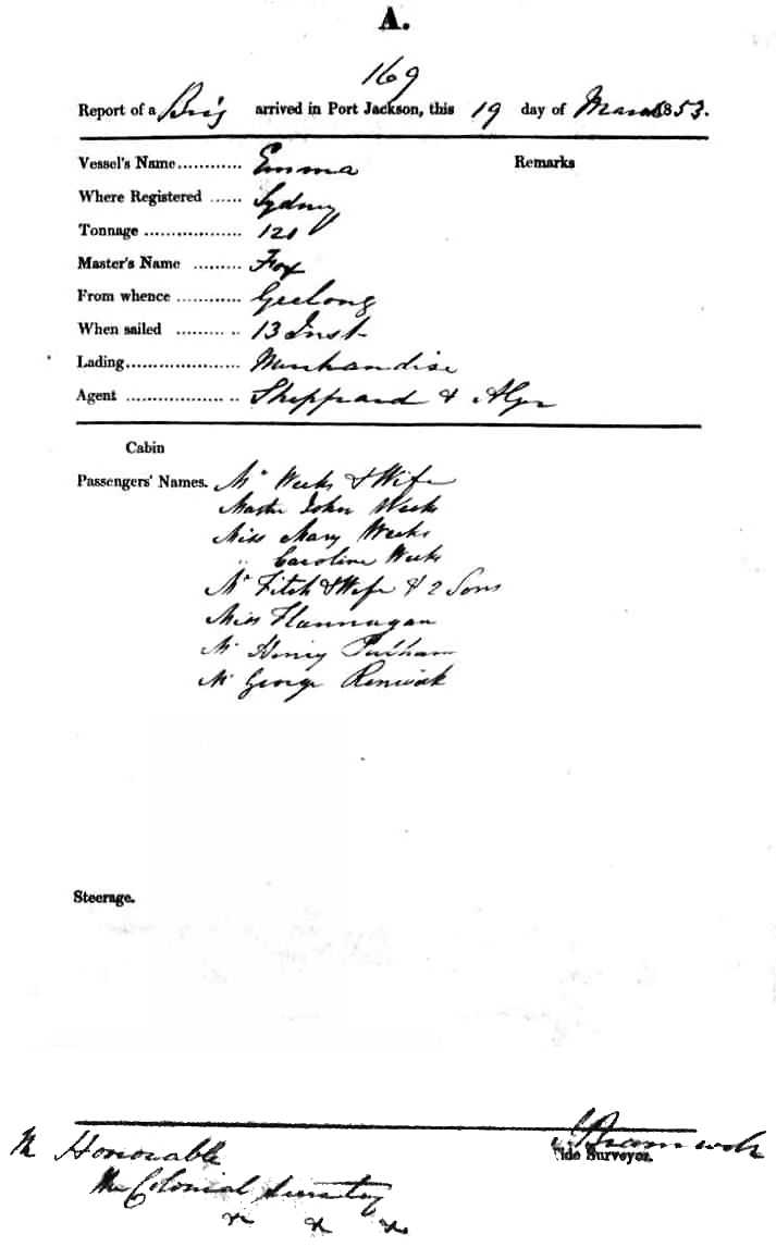 EMMABRIG OF SYDNEY, FOX, MASTER, BURTHEN 121 TONS, FROM THE PORT OF GEELONG TO PORT JACKSON, NEW SOUTH WALES, 19TH MARCH 1853 |