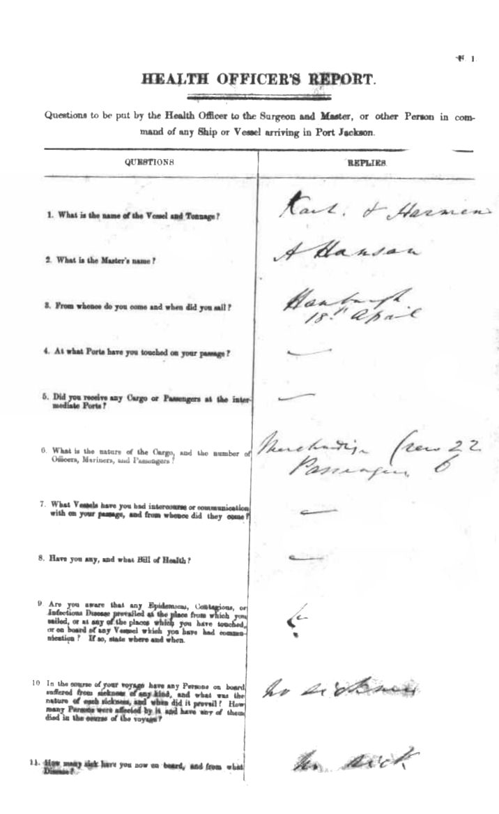 CARL HERMANNOF ?, A. HANSEN, MASTER, BURTHEN ? TONS, FROM THE PORT OF HAMBURGH TO PORT JACKSON, NEW SOUTH WALES, 5TH AUGUST 1853 |