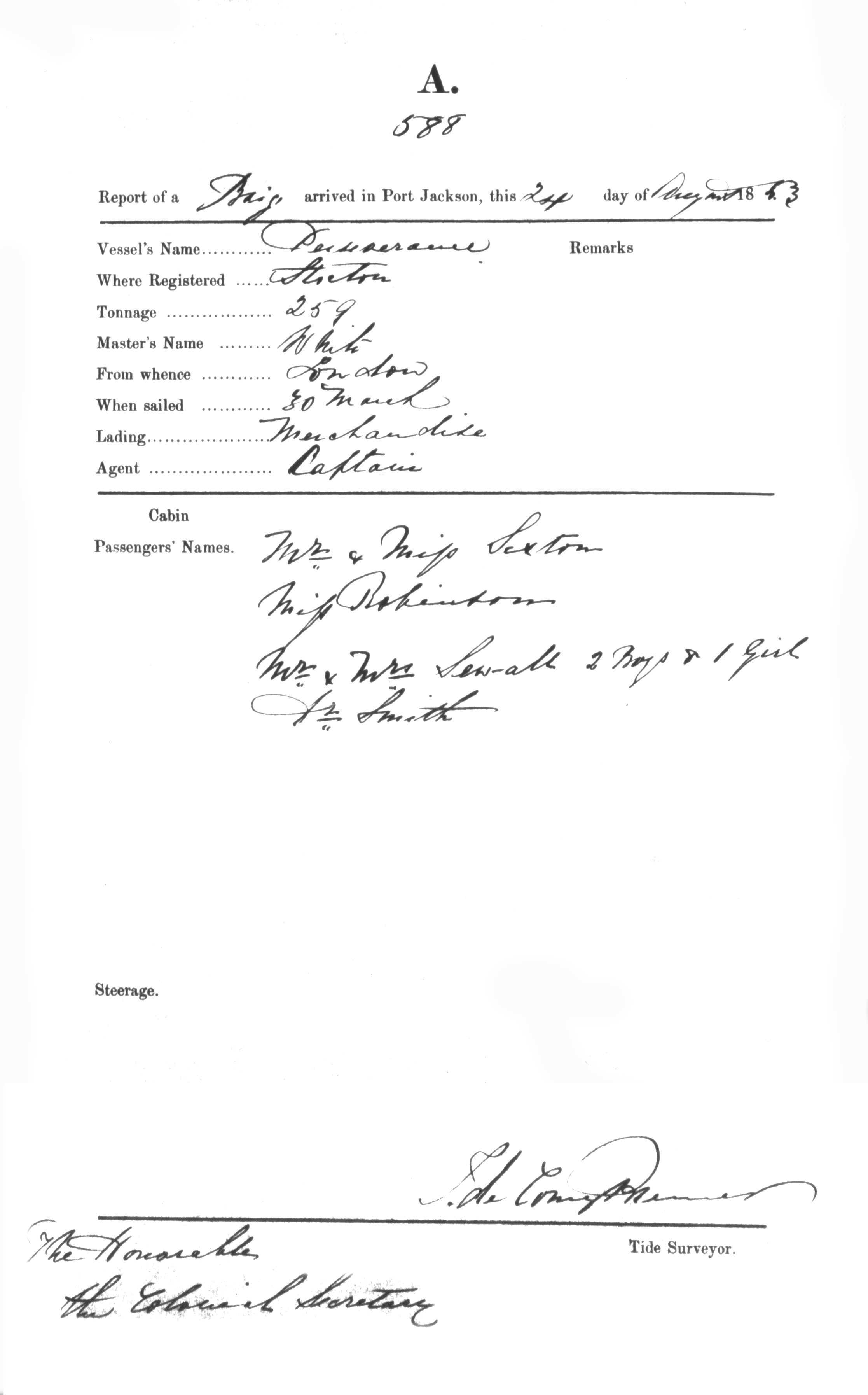 PERSEVERANCEBRIG OF STOCKTON, G. WHITE, MASTER, BURTHEN 259 TONS, FROM THE PORT OF LONDON TO PORT JACKSON, NEW SOUTH WALES, 24TH AUGUST 1853 |