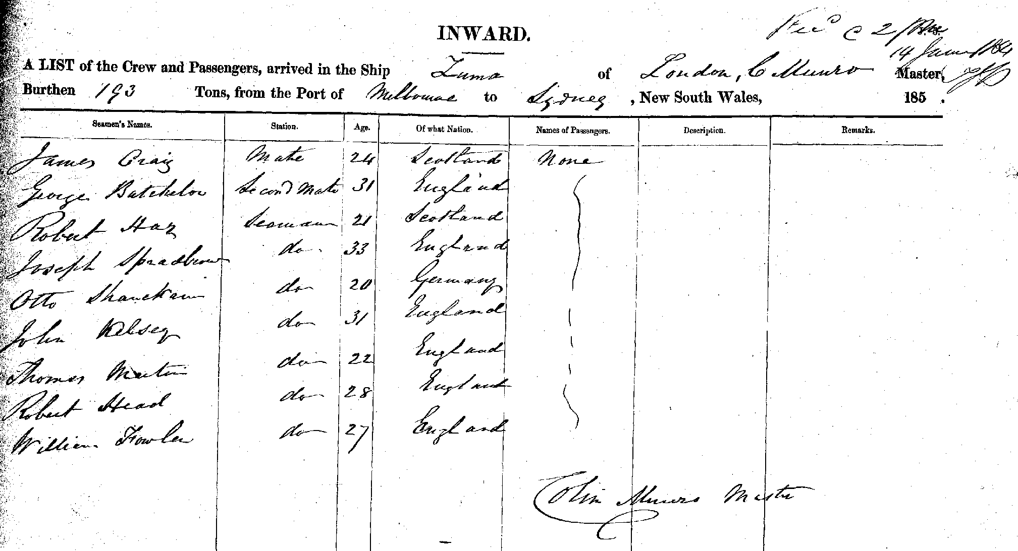 ZUMAOF LONDON, MUNRO, MASTER, BURTHEN 193 TONS FROM THE PORT OF MELBOURNE TO SYDNEY, NEW SOUTH WALES, ? JUNE 1854 |