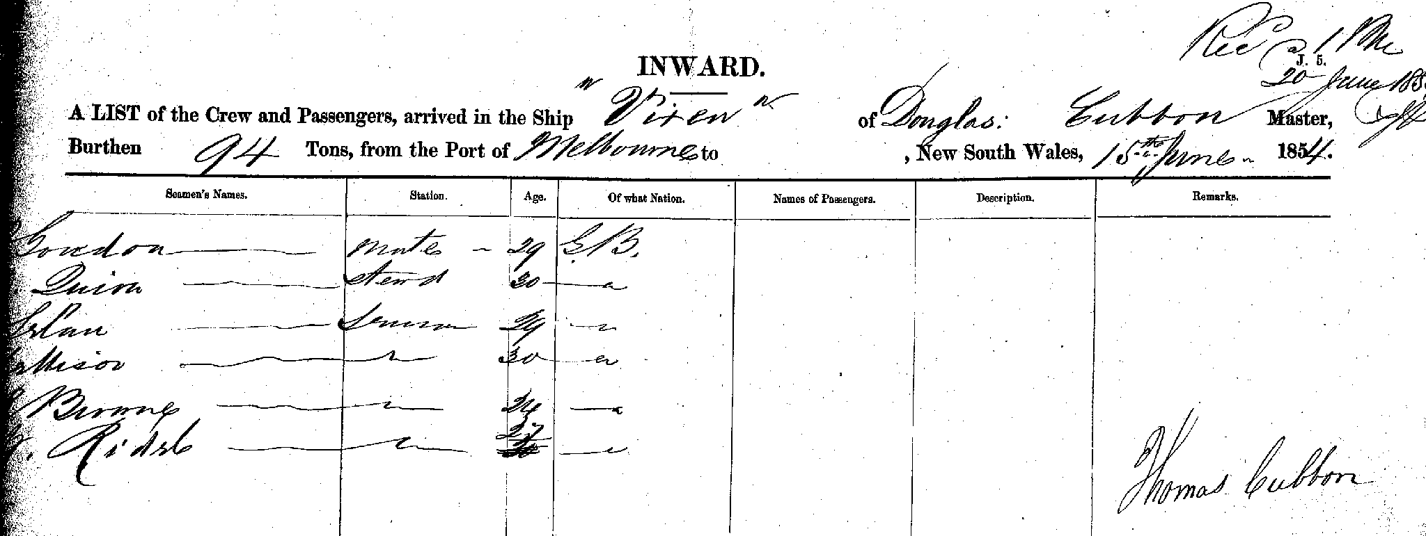 VIXENOF DOUGLAS, CUBBON, MASTER, BURTHEN 94 TONS FROM THE PORT OF MELBOURNE TO SYDNEY, NEW SOUTH WALES, 15TH JUNE 1854 |