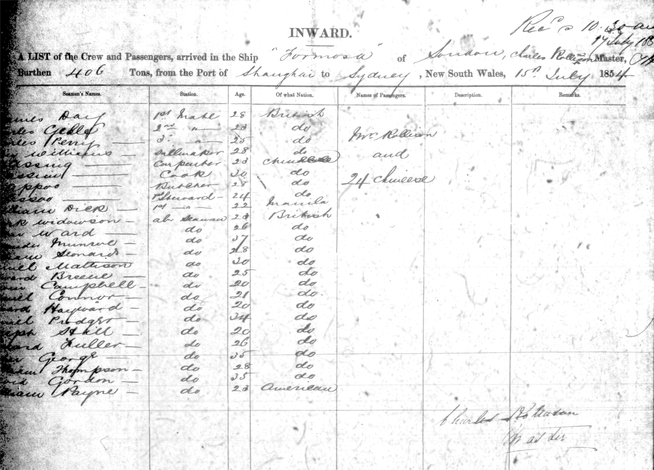 FORMOSAOF LONDON, CHARLES ROLLINSON, MASTER, BURTHEN 406 TONS FROM THE PORT OF SHANGHAI TO SYDNEY, NEW SOUTH WALES, 15TH JULY, 1854 |